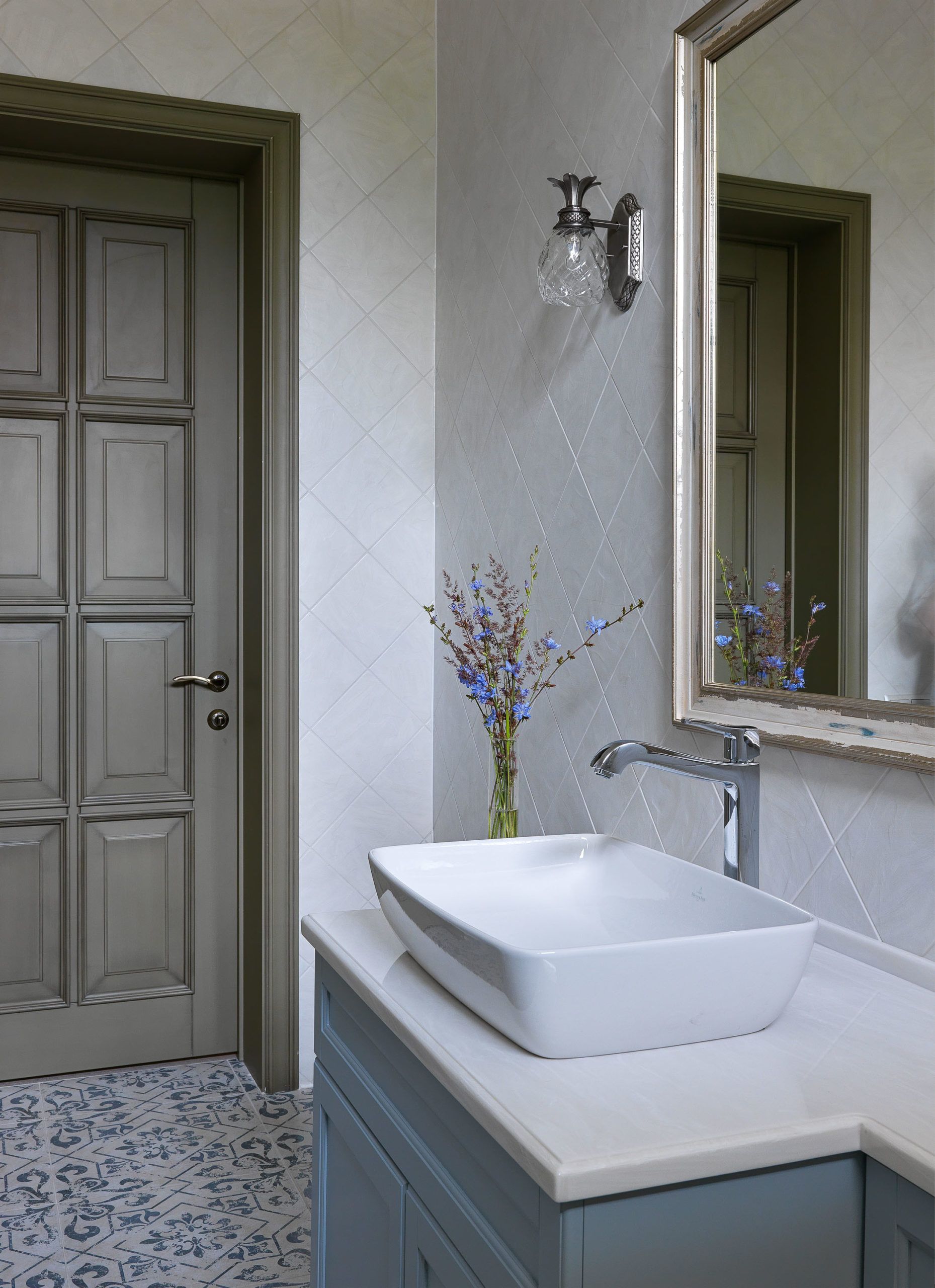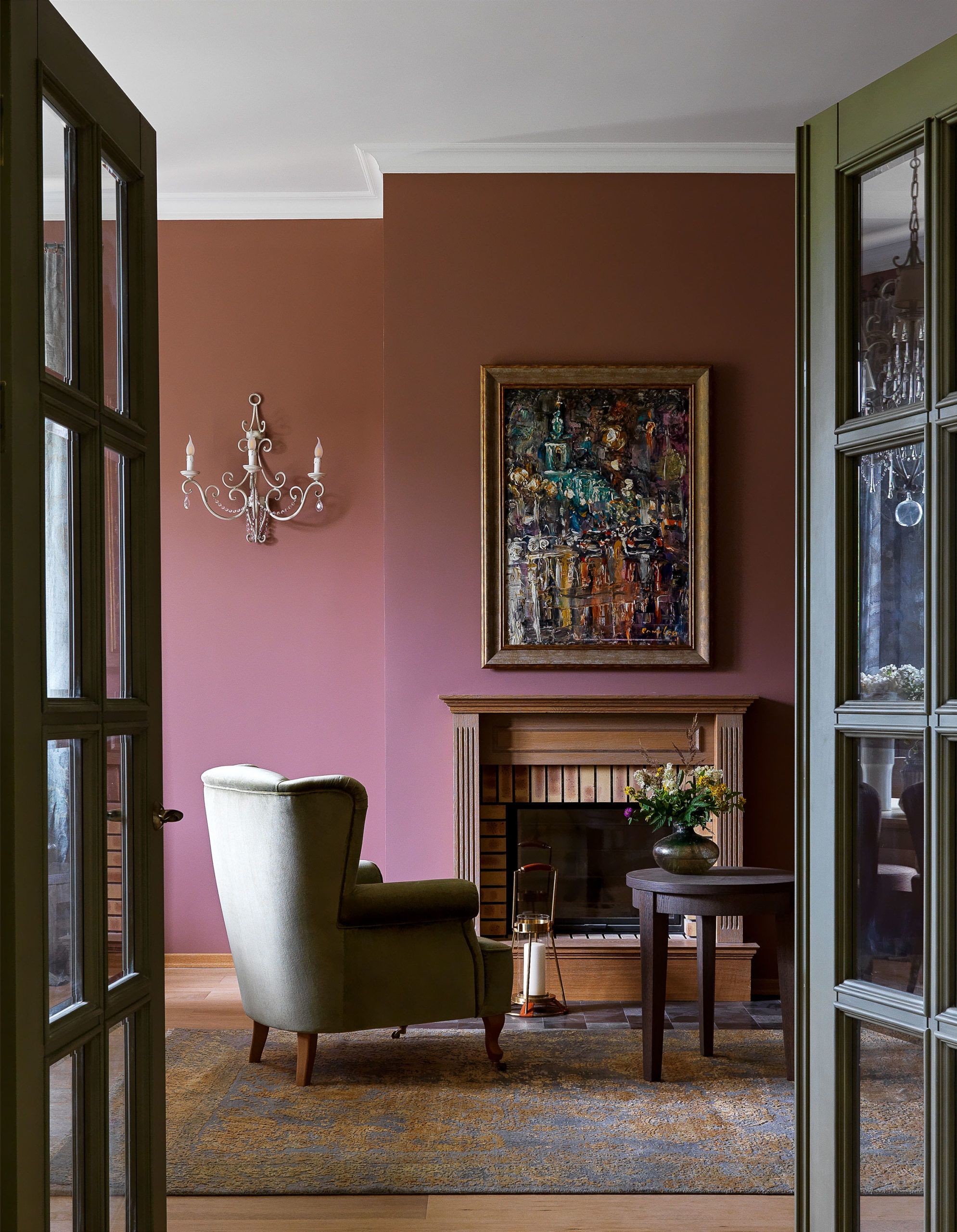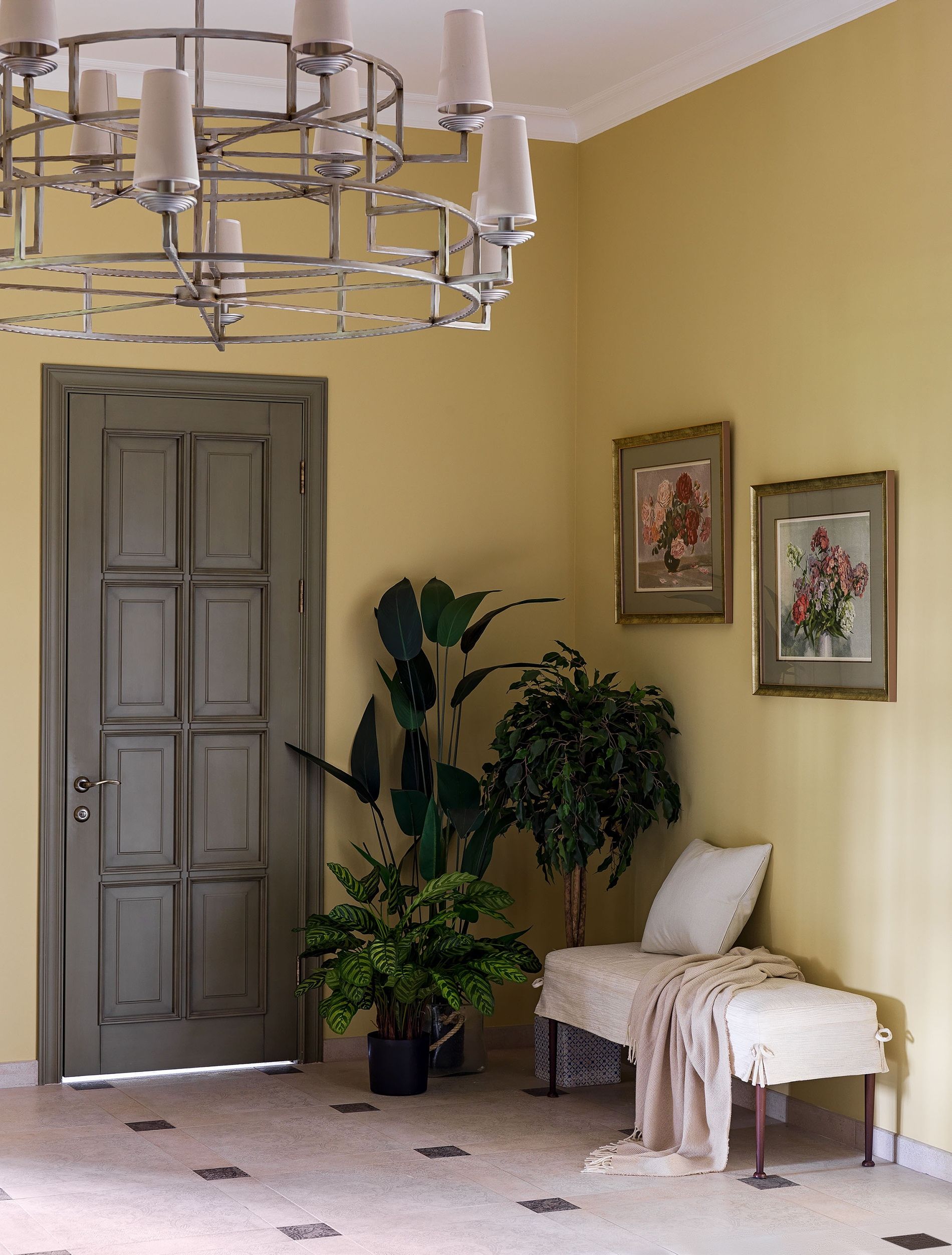 This country house by interior designer Anastasia Muravyeva is located near Moscow, in the vicinity of Pirogovo. The residence has an area of 300 sq.m. and two floors.The interior uses a complex color palette and a number of items are made to special order. For example, a staircase with a wrought-iron fence was made according to the sketch of the designer. An unusual solution as well is the olive doors with patina.
