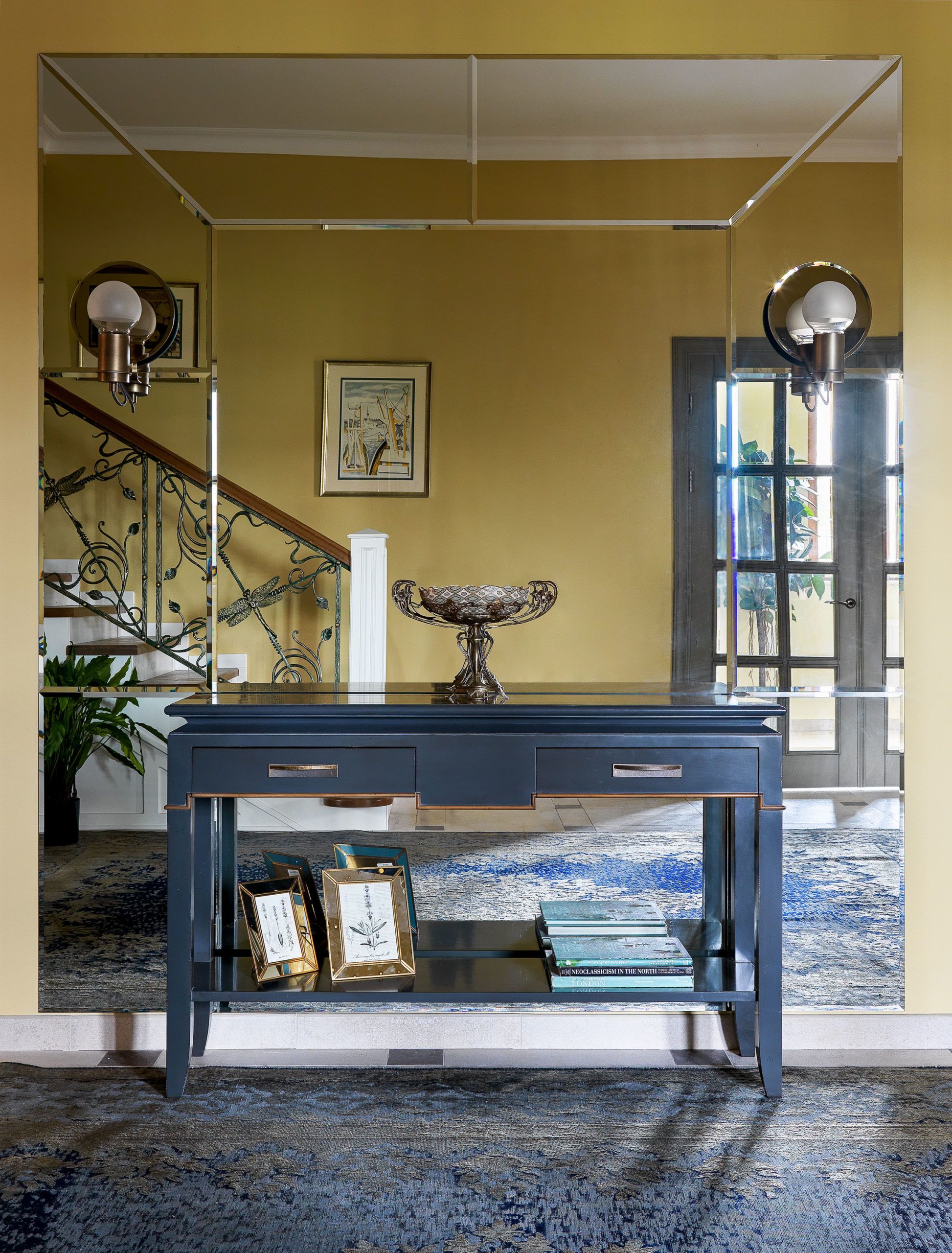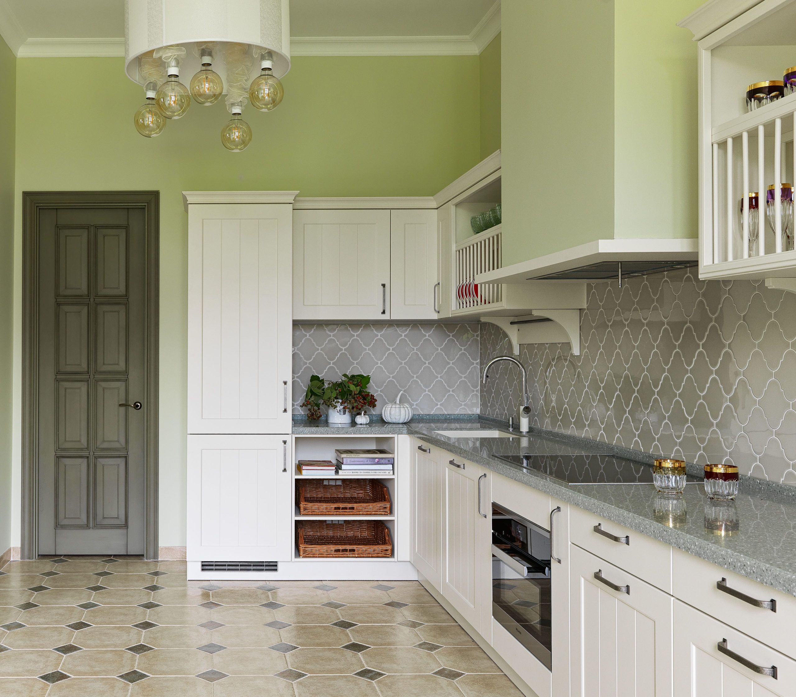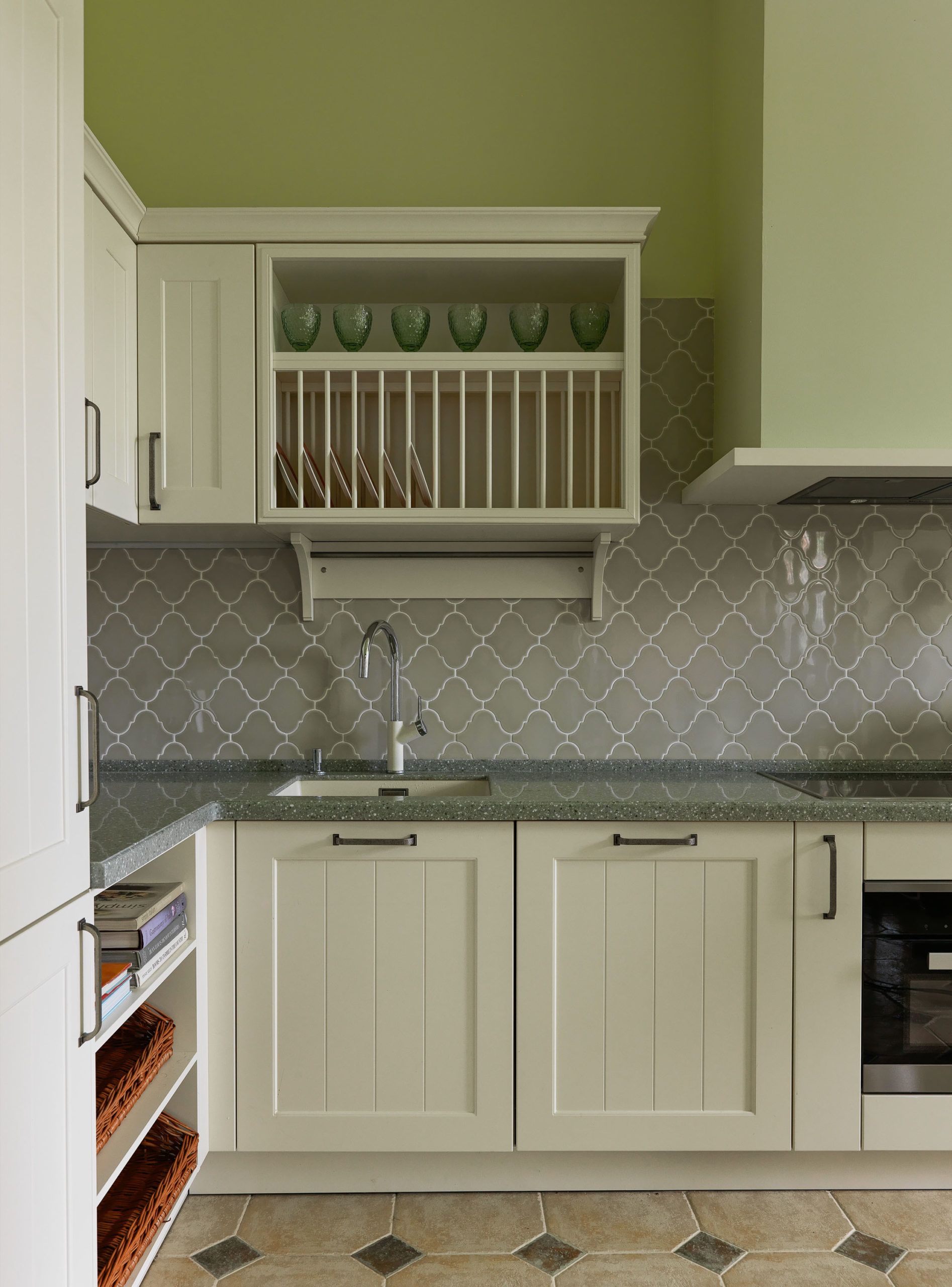 This country house by interior designer Anastasia Muravyeva is located near Moscow, in the vicinity of Pirogovo. The residence has an area of 300 sq.m. and two floors.The interior uses a complex color palette and a number of items are made to special order. For example, a staircase with a wrought-iron fence was made according to the sketch of the designer. An unusual solution as well is the olive doors with patina.