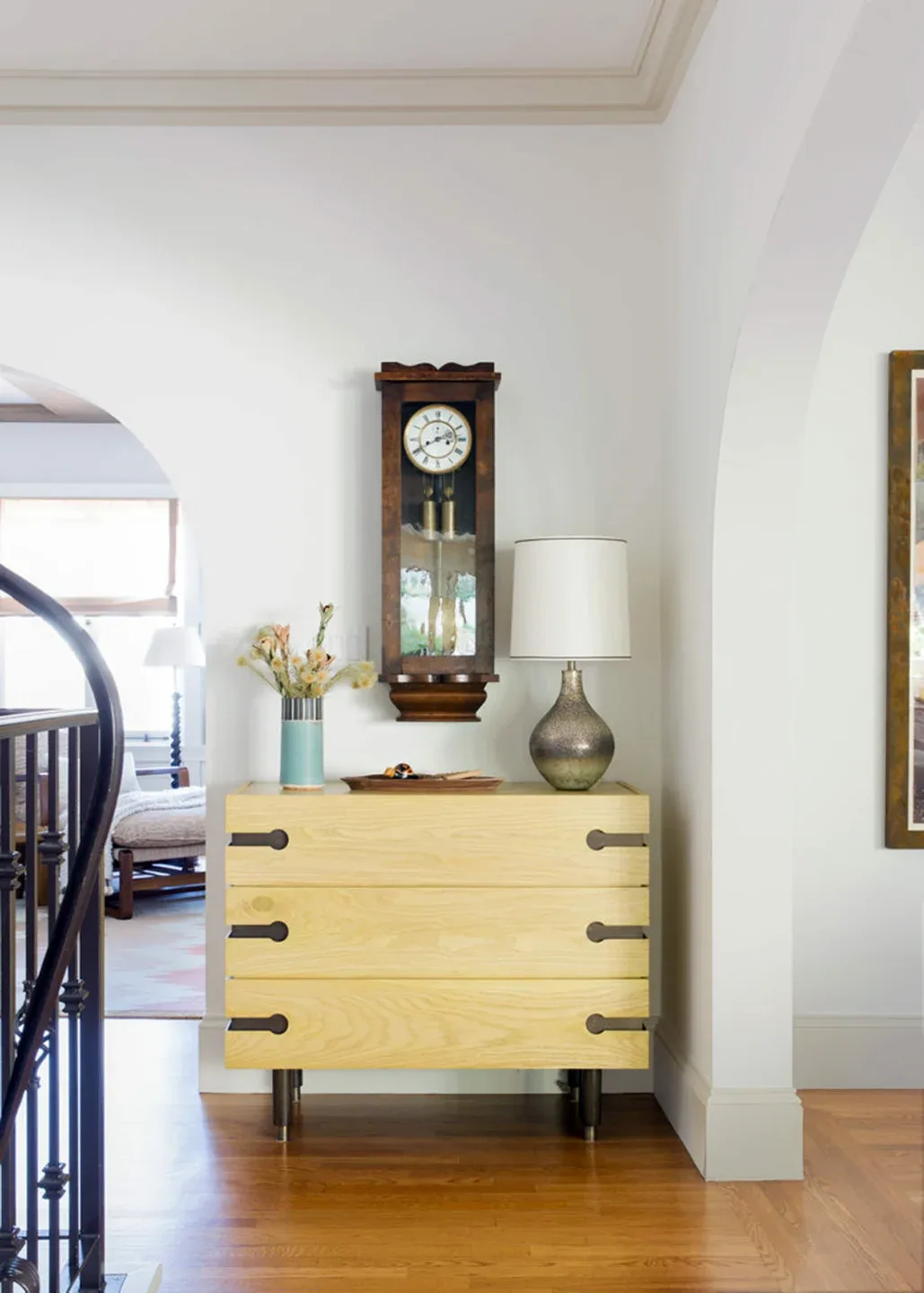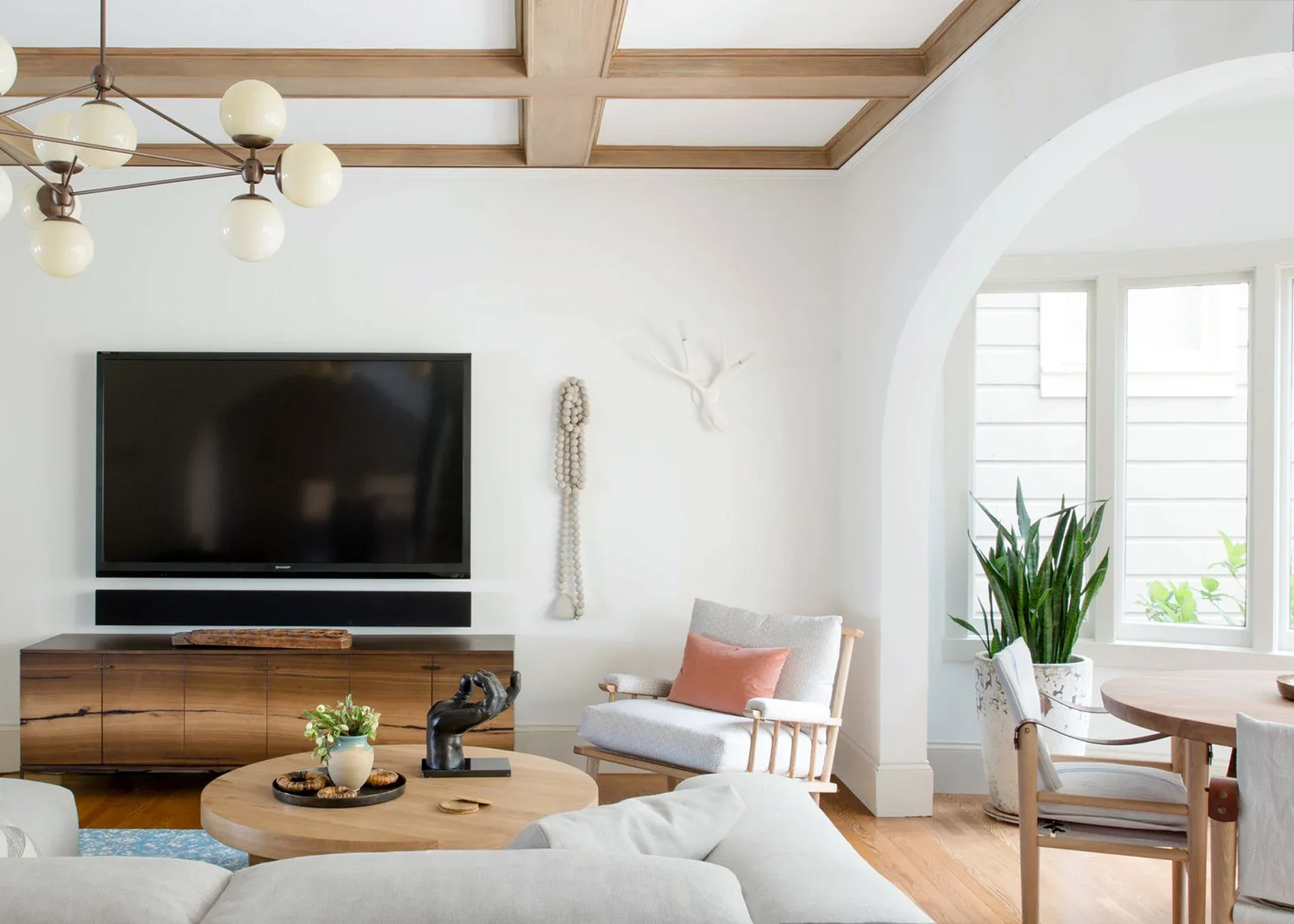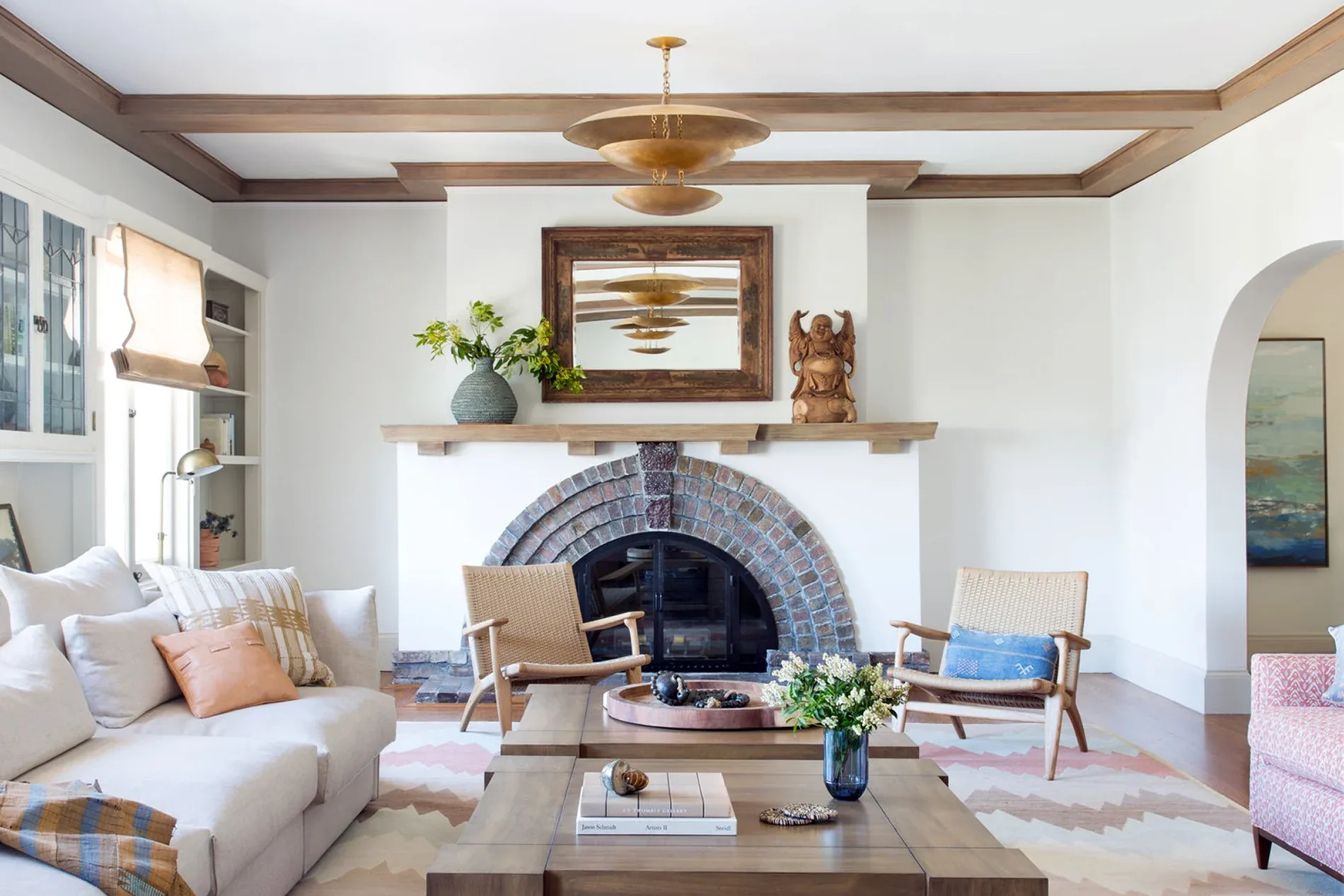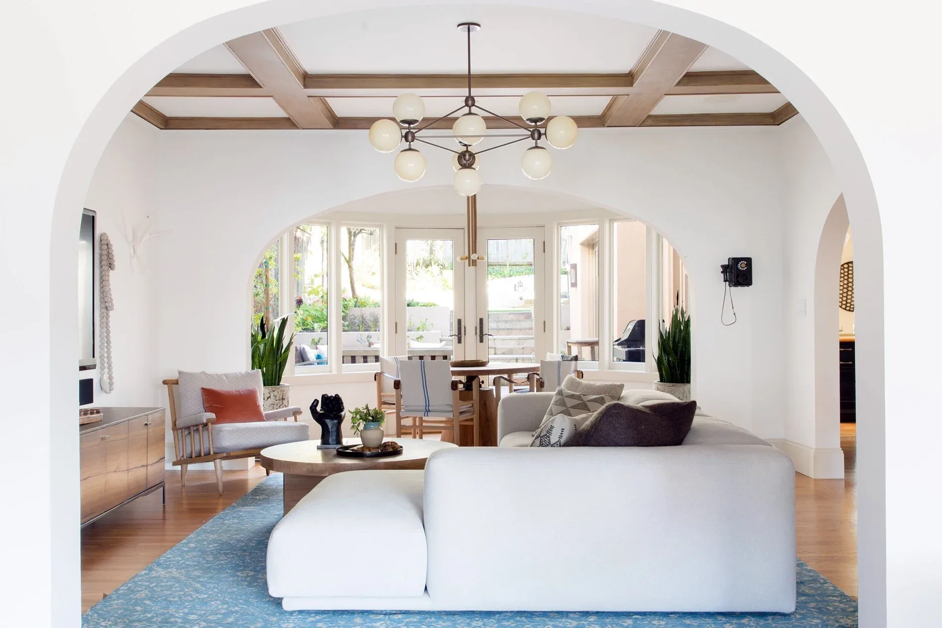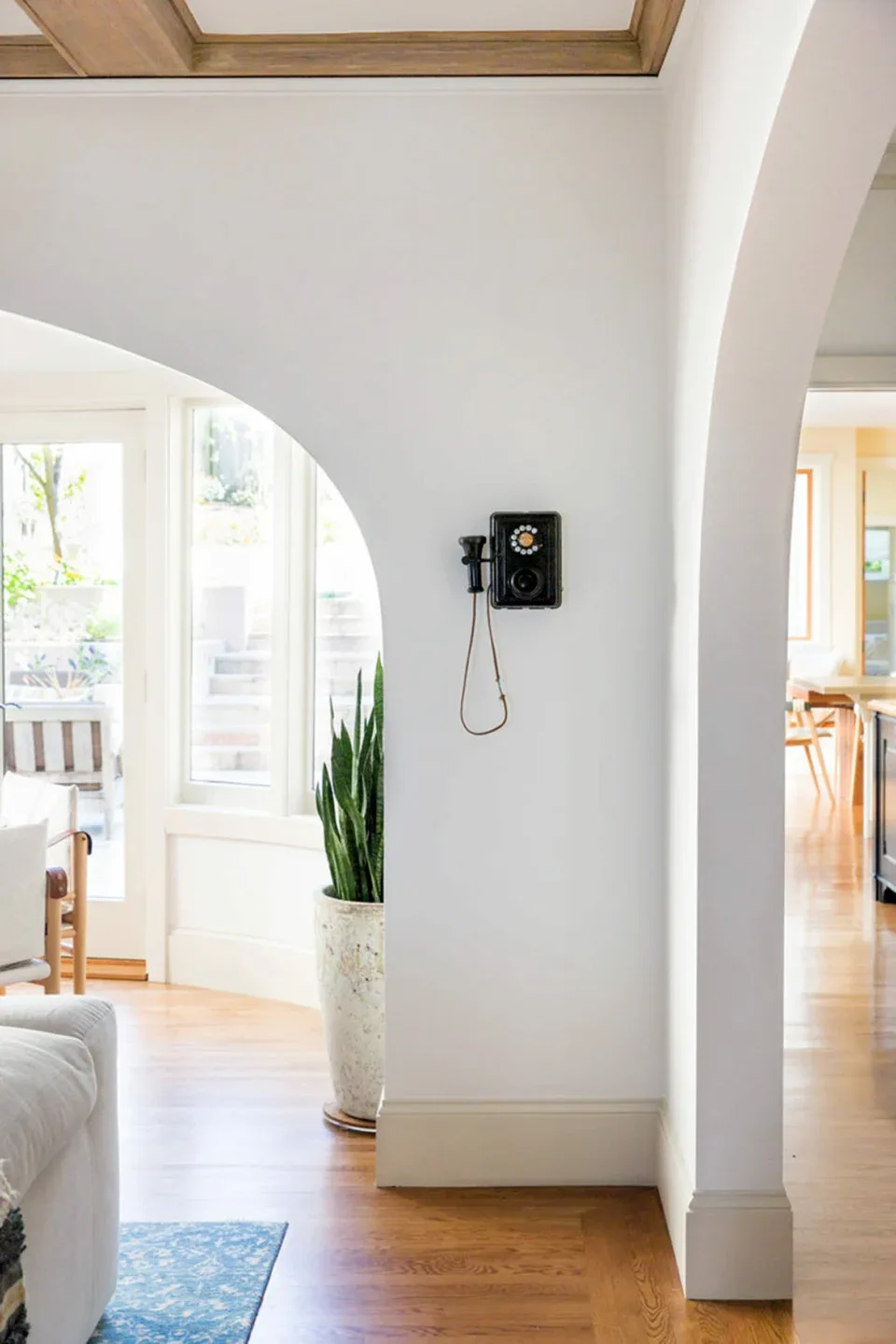 In the living room, lounge-worthy upholstery grounds the space, encouraging a relaxed and effortless West Coast vibe. Exposed wood beams recall the original Spanish-influence, but feel updated and fresh in a light wood stain. Throughout the entry and main floor, found artifacts punctate the softer textures—ceramics from New Mexico, religious sculpture from Asia, and a quirky wall-mounted phone that belonged to client’s grandmother.