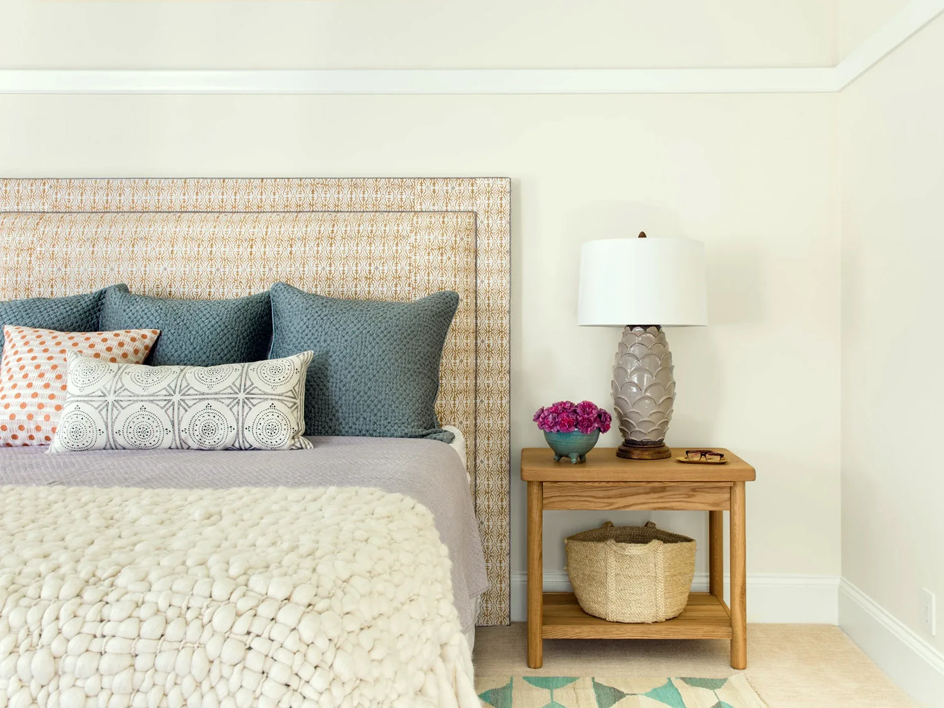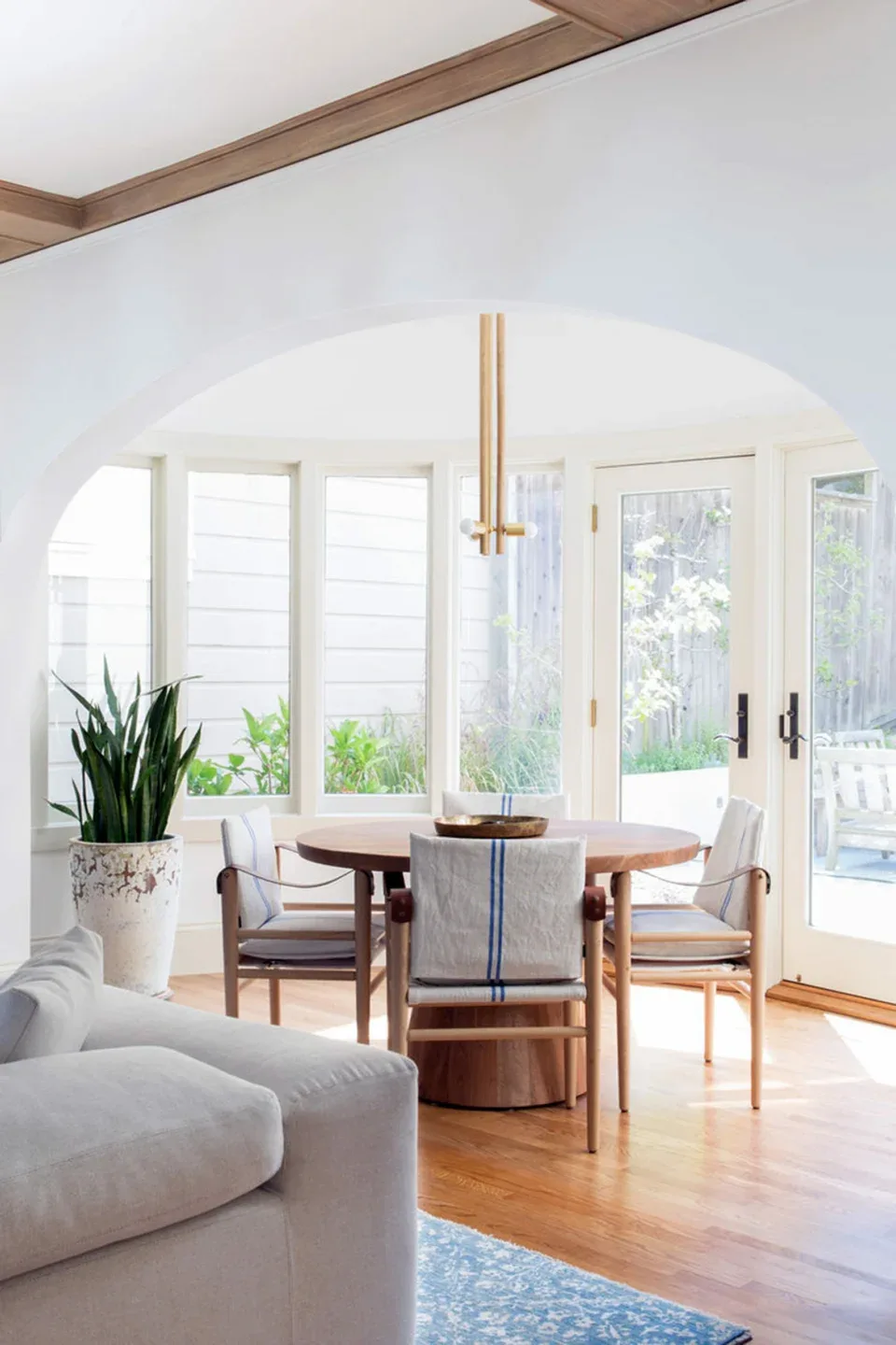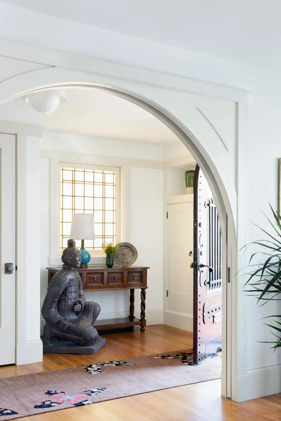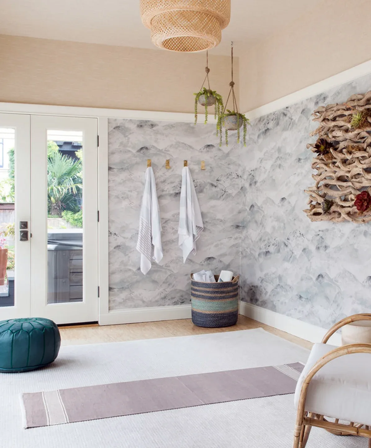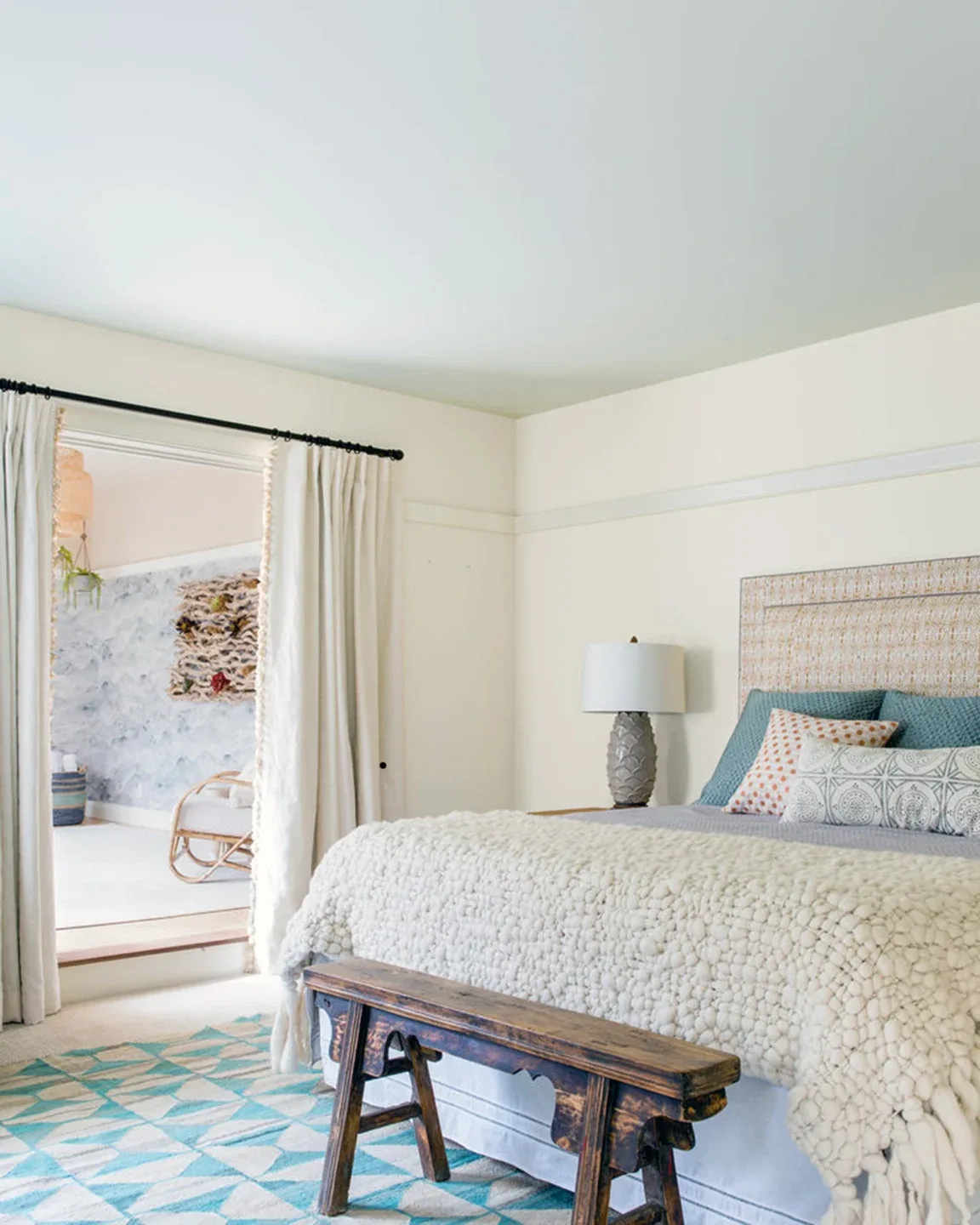 In the living room, lounge-worthy upholstery grounds the space, encouraging a relaxed and effortless West Coast vibe. Exposed wood beams recall the original Spanish-influence, but feel updated and fresh in a light wood stain. Throughout the entry and main floor, found artifacts punctate the softer textures—ceramics from New Mexico, religious sculpture from Asia, and a quirky wall-mounted phone that belonged to client’s grandmother.