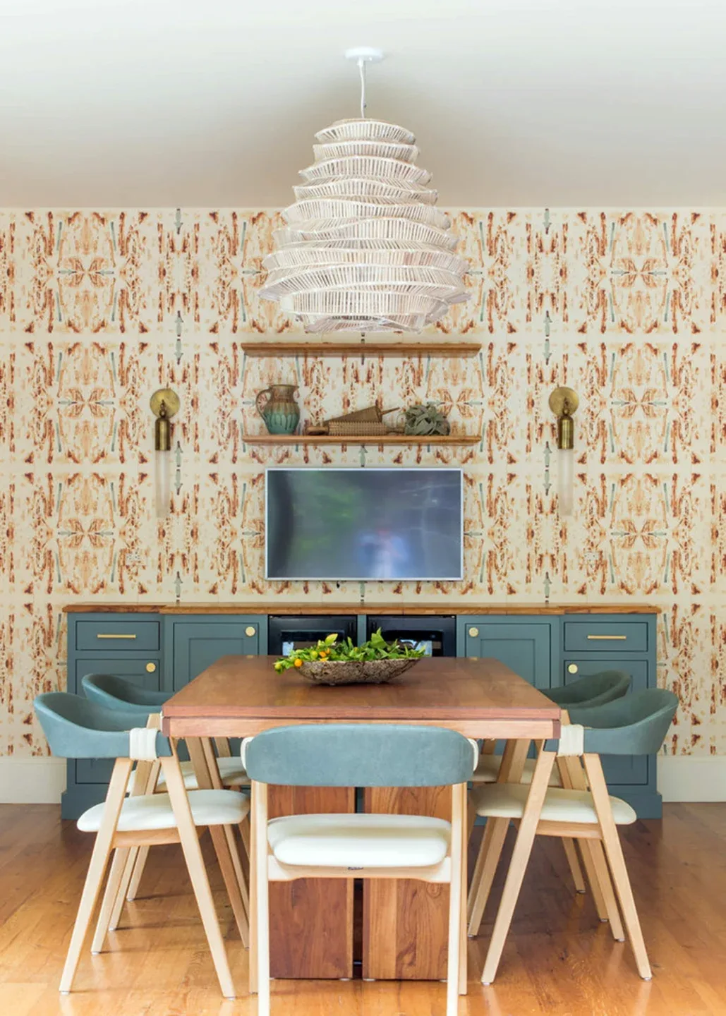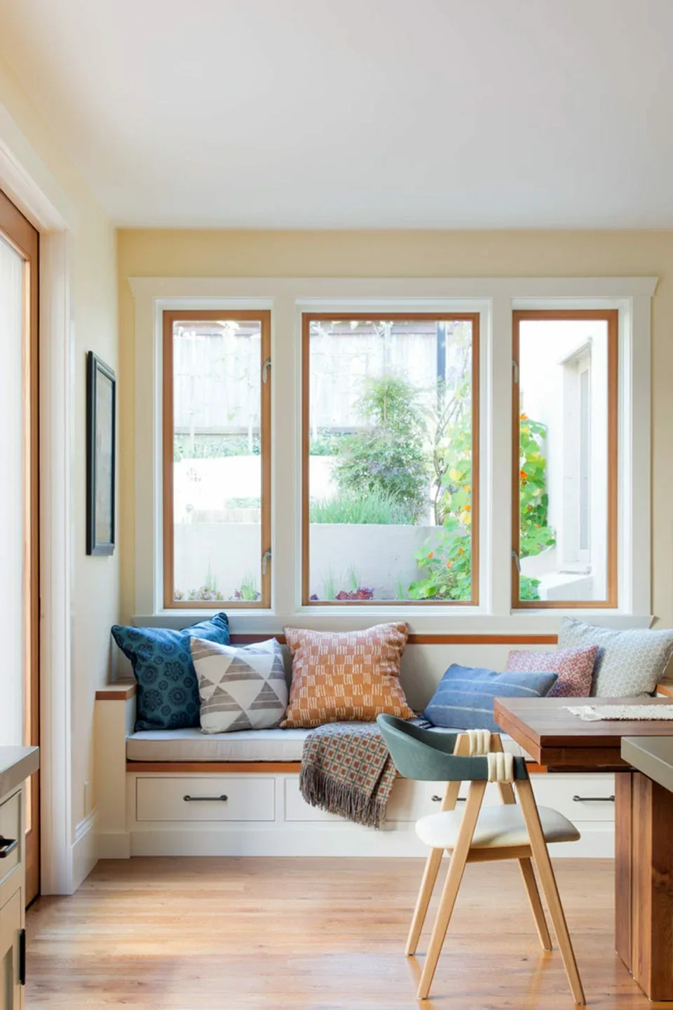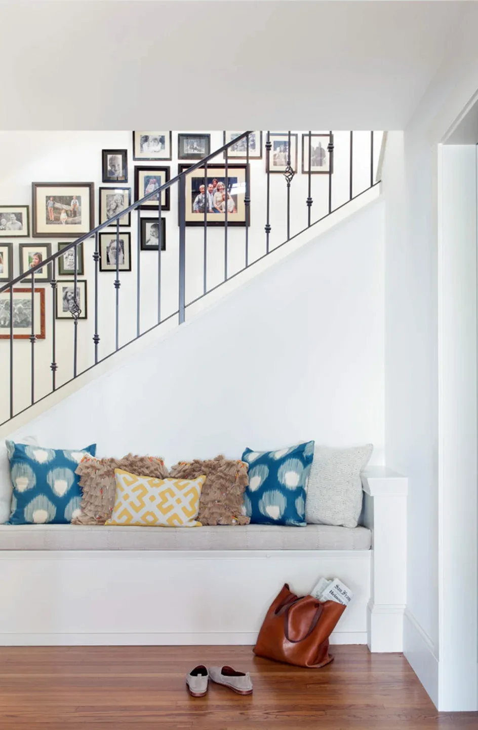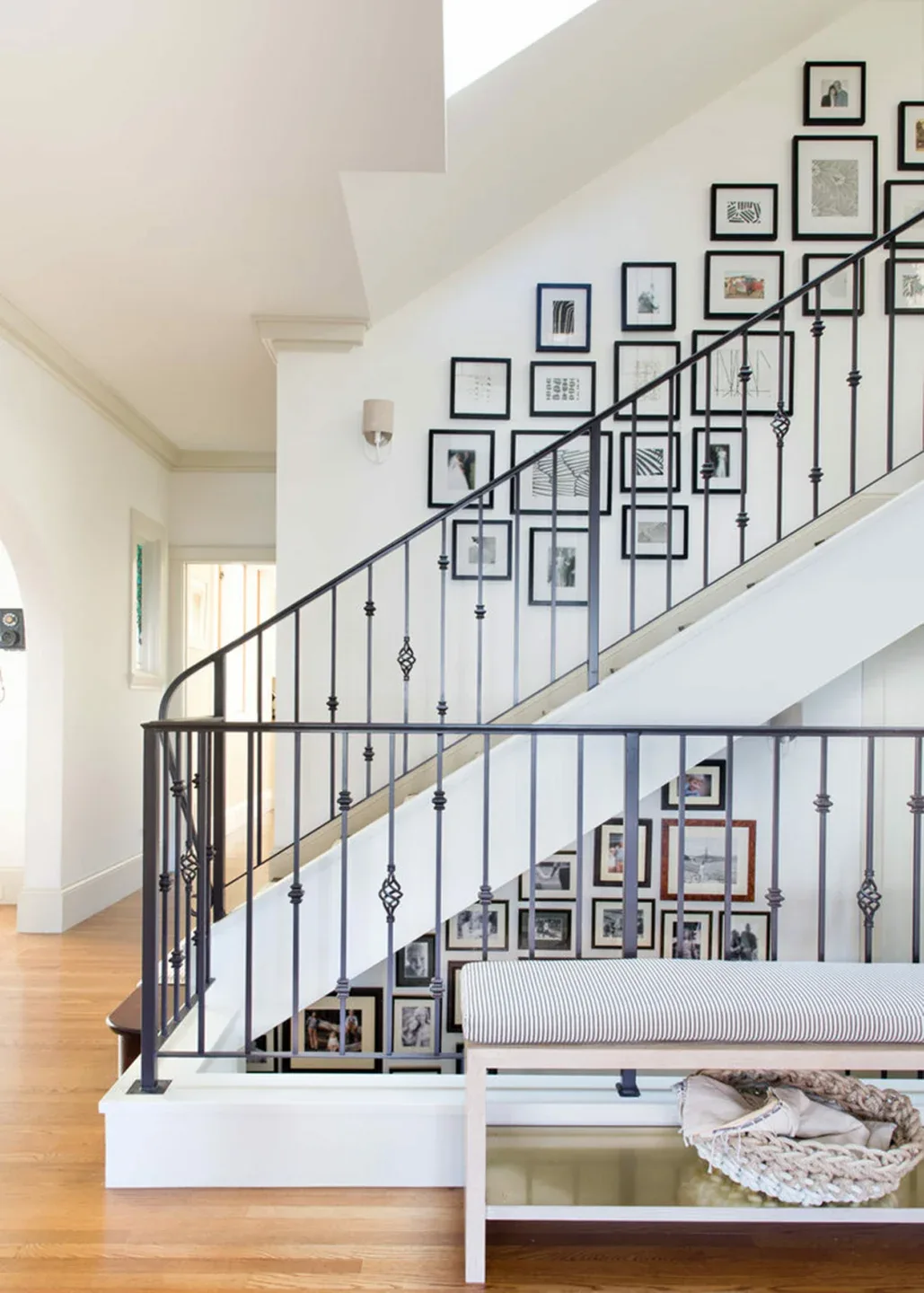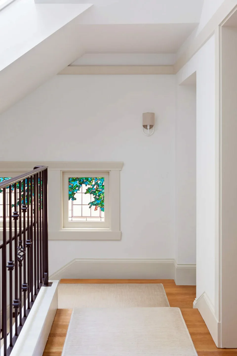 In the living room, lounge-worthy upholstery grounds the space, encouraging a relaxed and effortless West Coast vibe. Exposed wood beams recall the original Spanish-influence, but feel updated and fresh in a light wood stain. Throughout the entry and main floor, found artifacts punctate the softer textures—ceramics from New Mexico, religious sculpture from Asia, and a quirky wall-mounted phone that belonged to client’s grandmother.
