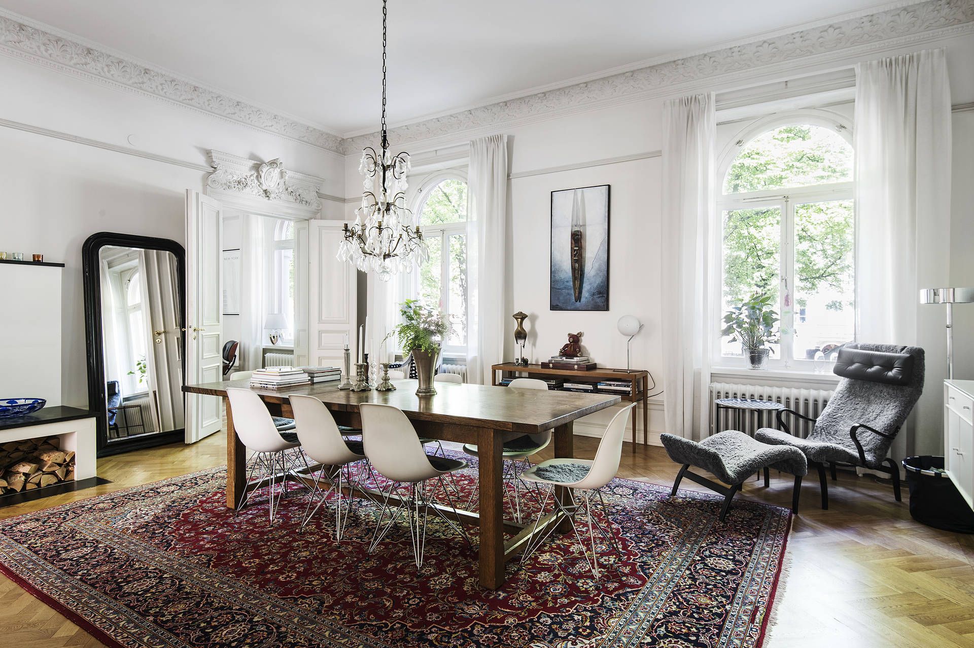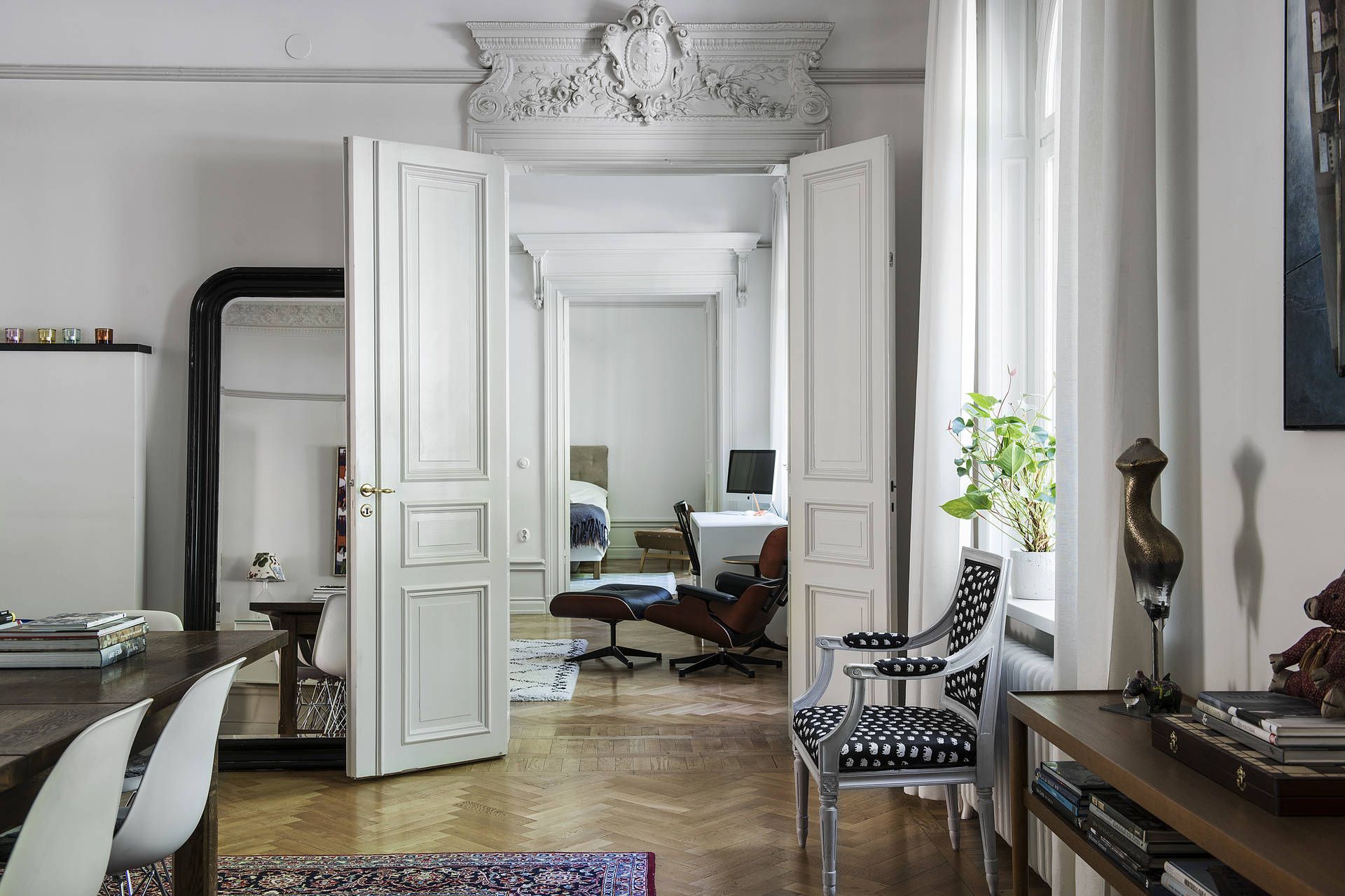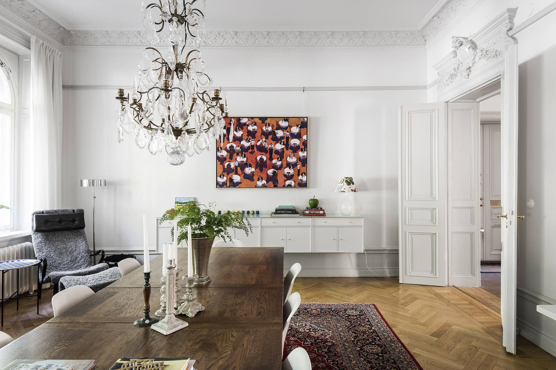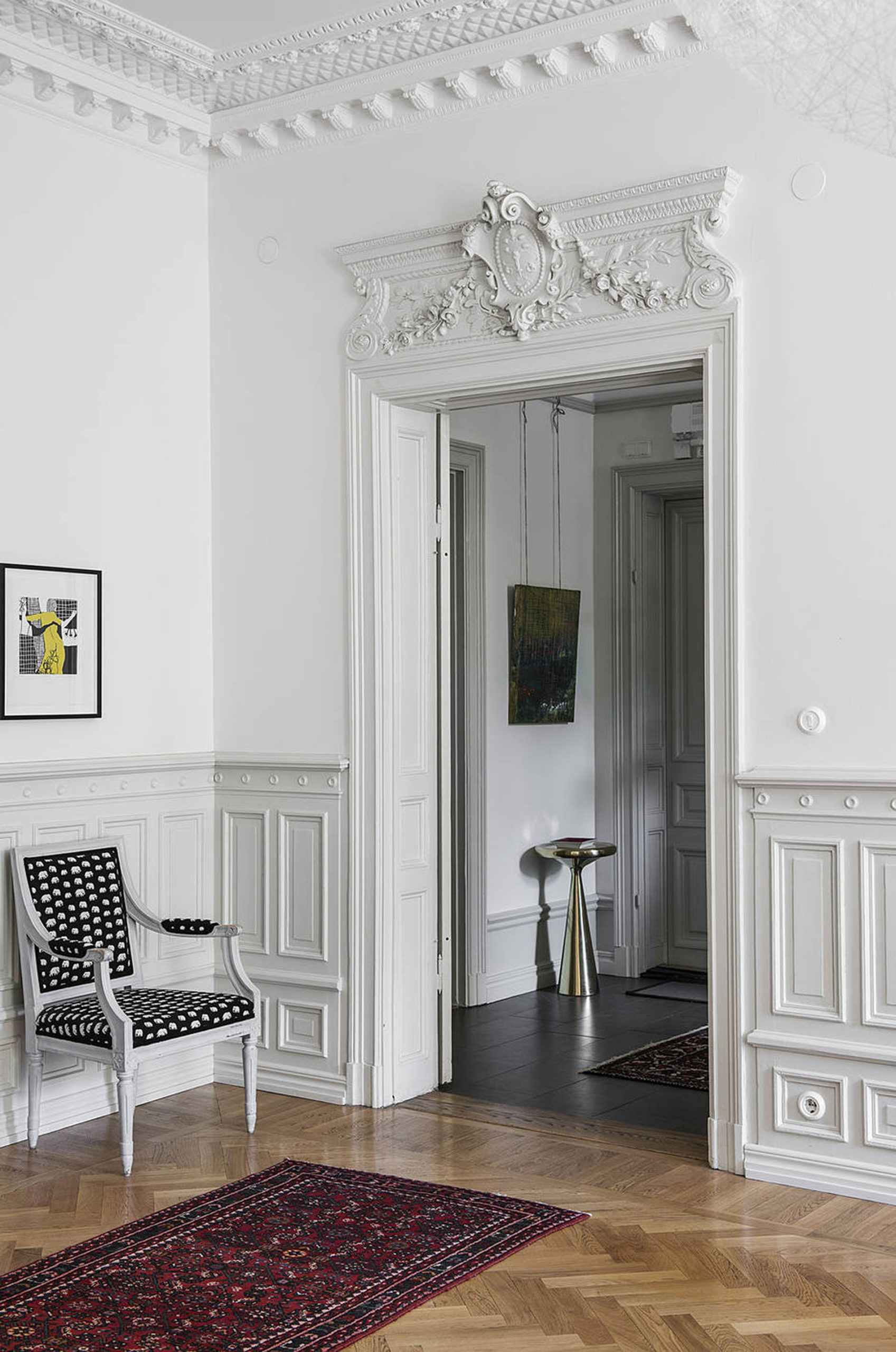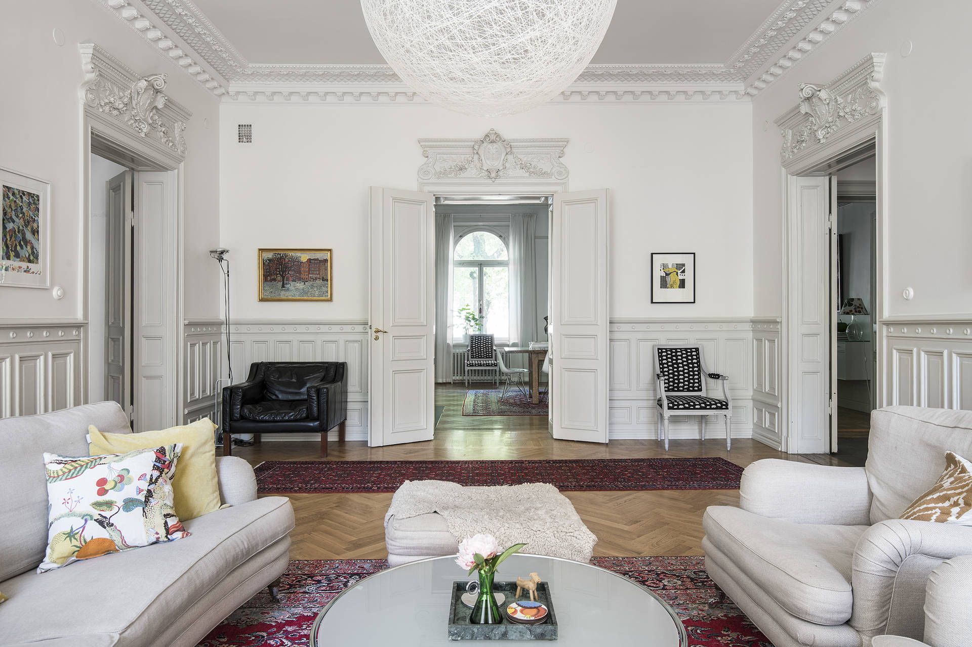 Striking family apartment of 213 sqm in a beautiful corner property in 1888 of Nordic design . Here you are met by several well-preserved original details such as ornate ceiling stucco, chest panels and mirrored double doors with magnificent door tops. This extremely well-appointed floor boasts wonderful light from two directions and a very impressive ceiling height. Have a look!!!!