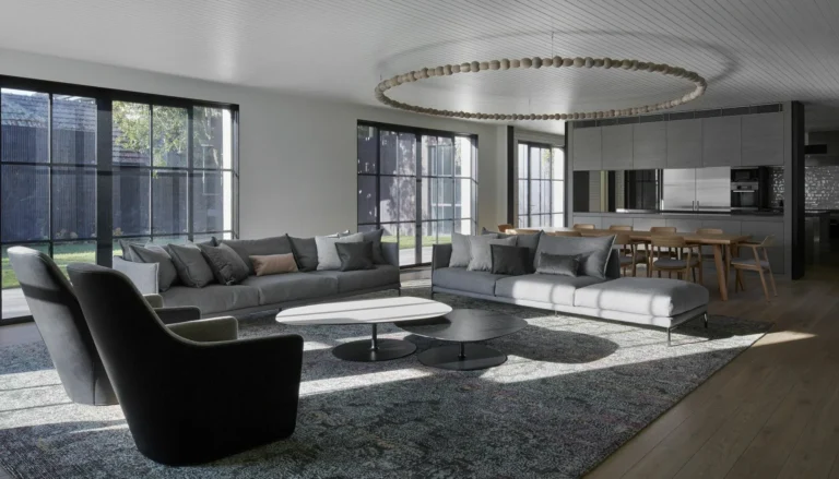 The approach for the renovation and extension of the Hopetoun Road Residence by B.E Architecture, was to retain the existing structure as an anchoring element, by adding a series of pavilions underneath a floating copper roofline that wraps around the original building. Embracing the client’s desire to maintain a relatively conventional residential structure, the design strengthens the form by creating a gable façade at the front and back with a clearly defined outline. Clad in polished grey render, the gables emphasise solidity and give the house a re-established sense of history and permanence. The tension and balance between old and new are carried into the interiors of the house. The existing structure maintains the intimate qualities of the original house with a series of crafted details. The new areas, made primarily from glass, are open to the green landscape beyond. The prominent use of steel-framed windows is a unifying element…