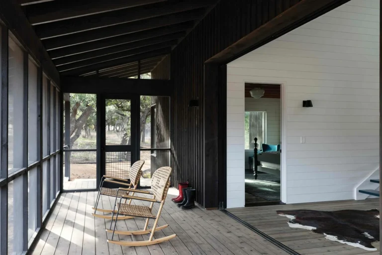 A multi-family compound rises from a remote, grassy valley on the bank of the Frio River deep in the Texas Hill Country. The goal for this project by Tim Cuppett Architects was to create shelters with an environmental experience unique to its place where Summer madness gives way to Winter stillness. Where city life and digital stimulation are replaced by the experience of feeling a cool breeze or snuggling up to a warm fire.Structures consist of a main house, meditation room over art studio/garage, and two guest studio cottages. Main house and cottages are linked by a slightly elevated walkway which enables barefoot kids to run back and forth over the tall grass and creepie crawlers.Much like “Dogtrot” shelters from the past, a “breezeway” bookended by concealed multi-slide doors, bisects the main house enabling alfresco dining most of the year; even in the sweltering Summer a cool breeze rises from…