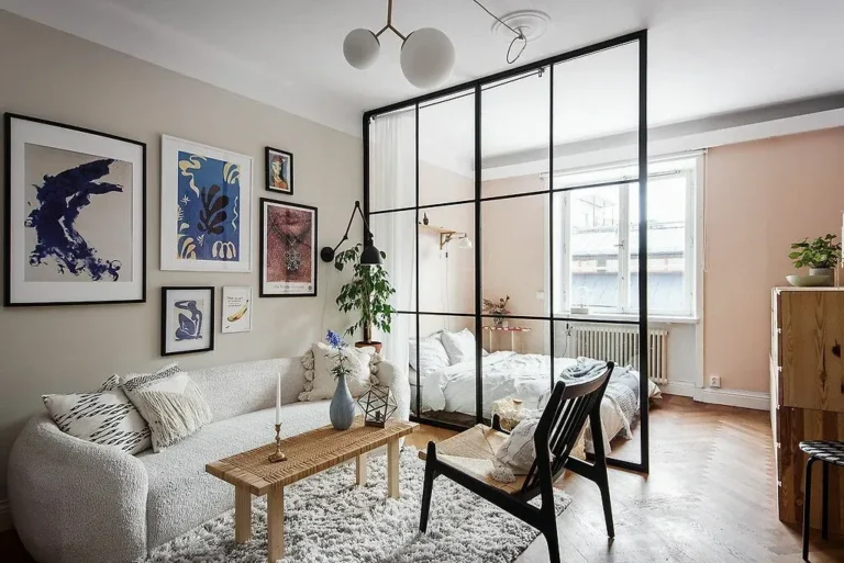 With the skillful hand of Scandinavian designers, a simple studio apartment with a total area of 37 sqm was converted into a very nice one-bedroom dwelling. More precisely, the bedroom here is not entirely a room; it is rather a dedicated sleeping corner which arose thanks to a glass partition. The living room area is quite aesthetic thanks to cool wall posters, a plush sofa and beautiful textiles. Such a great little home!!!!! See also :https://house-diaries.com/a-playful-tiny-scandinavian-apartment/