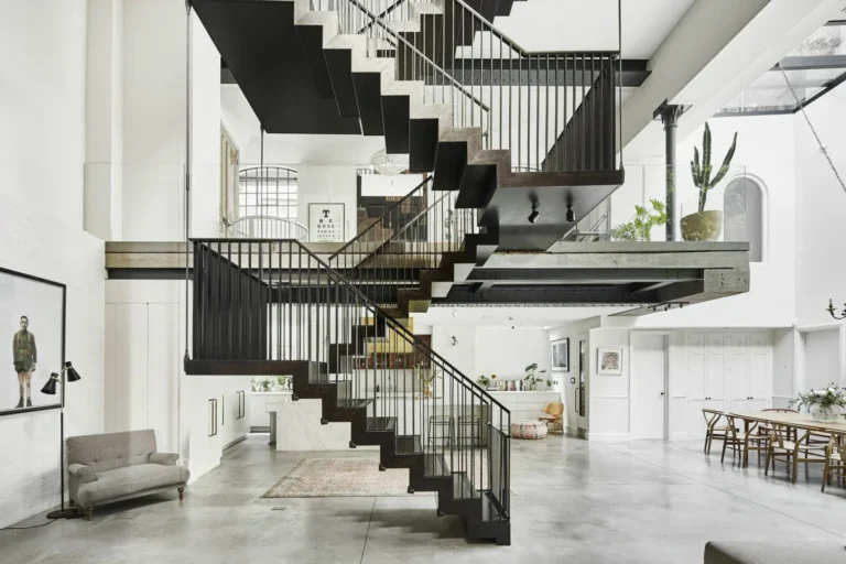 The recipient of a RIBA Award in 2017, this incredible four/five-bedroom house can be found nestled on a gated, cobbled mews in the Clerkenwell Green Conservation Area. Built in the early 1900s, originally for use as a brewery cooperage, it is the subject of an ambitious and beautifully executed renovation by Chris Dyson Architects. Internal accommodation approaches 4,000 sq ft over five expansive levels, including a substantial roof terrace. The result is a wonderfully considered renaissance of an industrial past and a masterful marrying of materials, new and old. Combining concrete, black steel and exposed brickwork the architects have created a home that is at once versatile, warm and aesthetically arresting. Photography : The Modern House See also :https://house-diaries.com/a-terraced-house-in-notting-hill-london/
