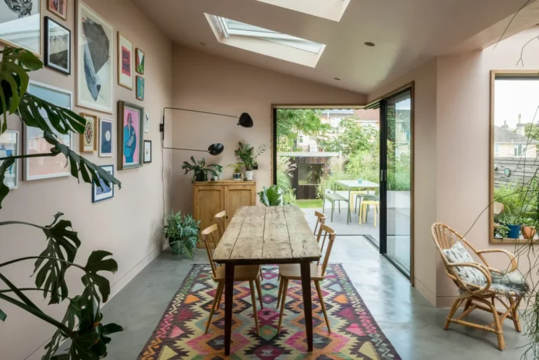 This beautifully designed three-bedroom house combines generous Victorian proportions with exceptional modern details. Extended and completely renovated by the current owner, an interior designer, internal accommodation measures just under 2,050 sq ft across three floors. The large open-plan living area on the ground floor includes two seating areas and a large pink and black kitchen in the new extension. Large windows and skywindows have been added to flood this room with light and with wonderful views over the garden. The hand-crafted kitchen has been finished with exceptional attention to detail, with Carrara marble worktops paired with brass fixtures and bespoke light fittings. The master bedroom upstairs has floor to ceiling cabinets painted in a blue shade. A self-contained studio is set in the beautifully landscaped rear garden, providing a private workspace independent to the house. Photography : The Modern House See also :https://house-diaries.com/woodland-pavilion-an-extension-between-a-grand-victorian-villa-and-a-woodland-nature-reserve/