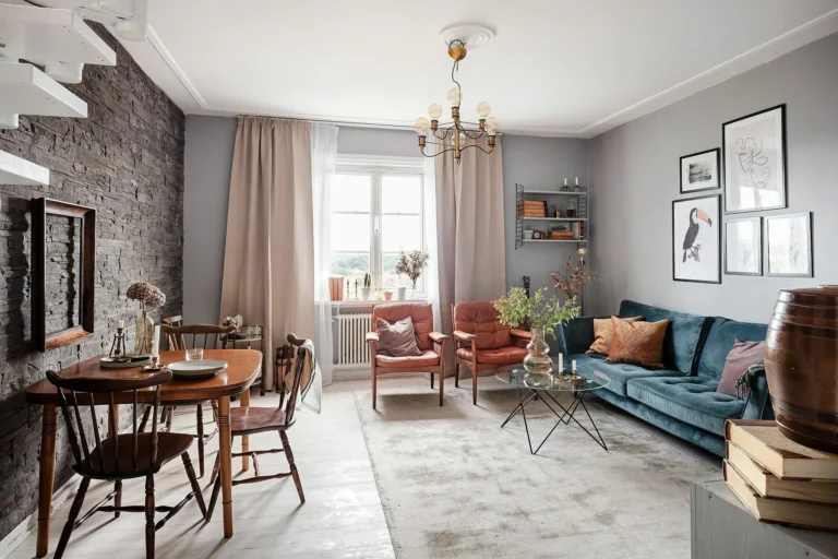 This Gothenburg apartment has only 63 sqm of the total area, but the two levels made it possible to create different convenient zones. The ground floor consists of a kitchen and living room for receiving guests, while the attic floor is designed for privacy with a bedroom.In contrast to the grey-shaded kitchen, the dining-living room has a variety of colors: from various shades of brown to powdery and azure blue. The second floor is an area of relaxation and comfort, so milky shades with wooden accents prevail here. A vintage chest of drawers and a desk that highlight the century-old history of the house, built in 1926, complement the look . Enjoy the tour!!!! See also :https://house-diaries.com/stylish-turn-of-the-century-apartment-in-goteborg/