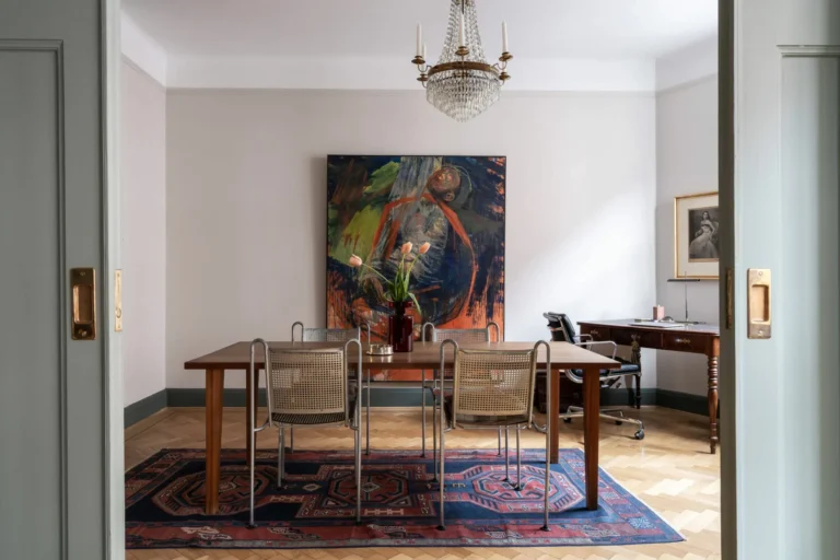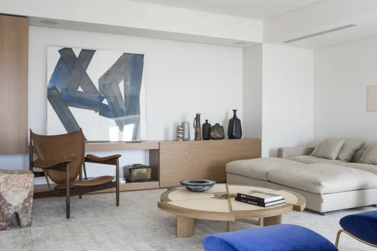 With a panoramic view to Tejo river, TM apartment, designed by Arthur Casas Studio, is on the penthouse of a retrofit building in the heart of Lisbon. The project’s layout reflects the wishes of clients for cozy spaces to receive friends, but also to respect their privacy. Once you enter the apartment, the Portuguese tiles panel in the dining room announces the blue protagonist, a striking color in the project – also present in the Delfino armchairs and Carolina Semiatzh’s painting. Also central in this environment, the Amorfa dining table designed by Arthur Casas, is inspired by organic forms of nature and escapes from the conventional pattern, with a dynamic design to bring its users closer. Finally, the convex mirror, by studio Básico, amplifies and visually integrates the social areas. The project also features neutral tones and wood finishings – present on the floor, woodwork, furniture and decoration – to…