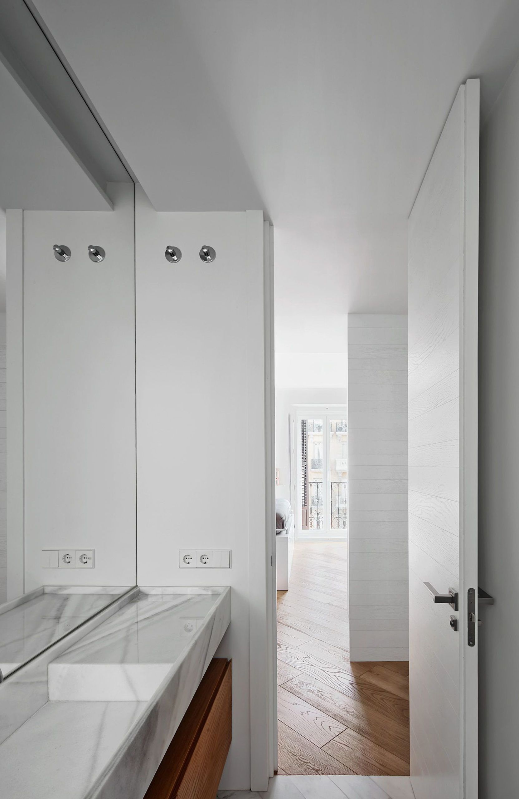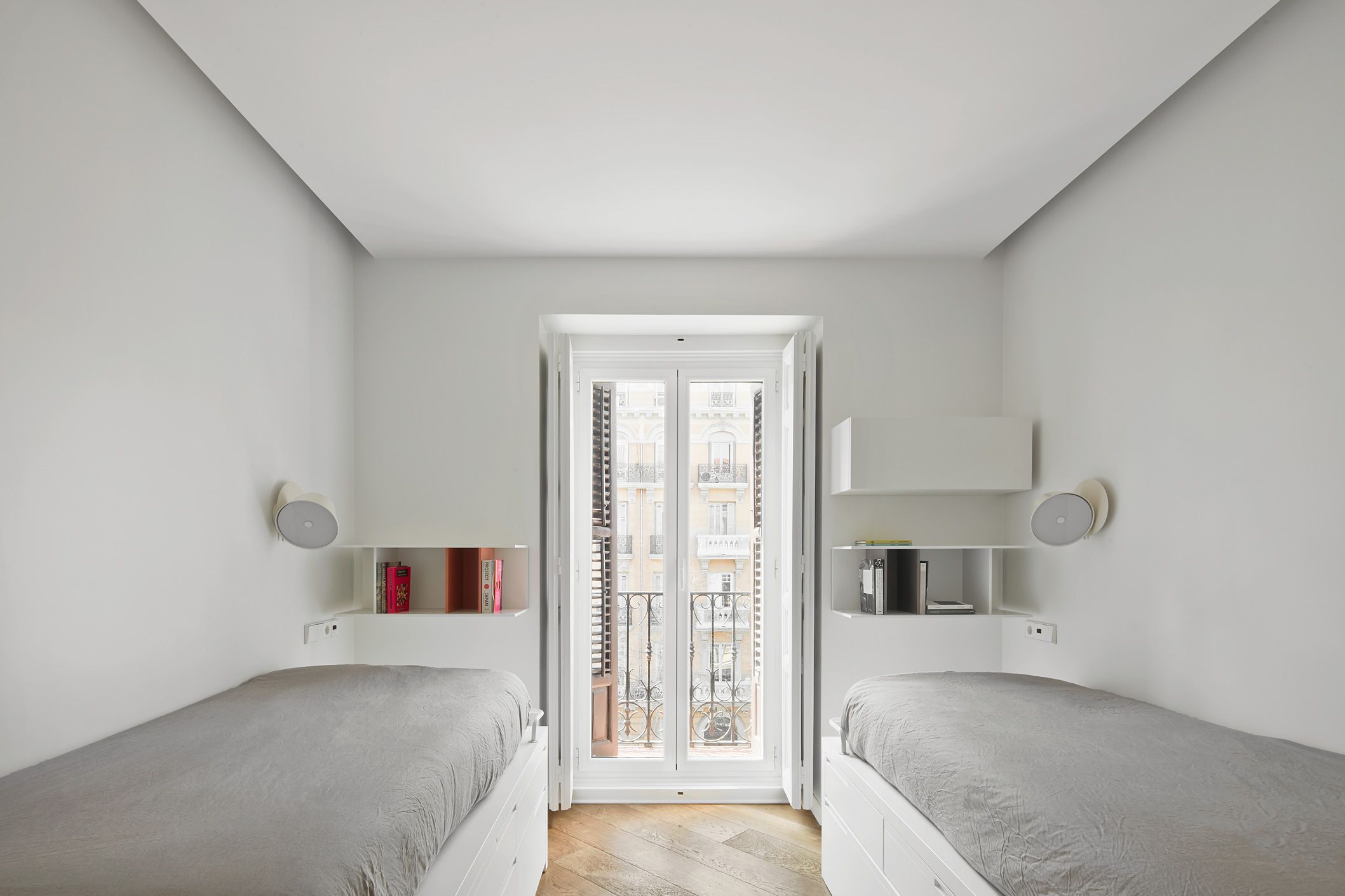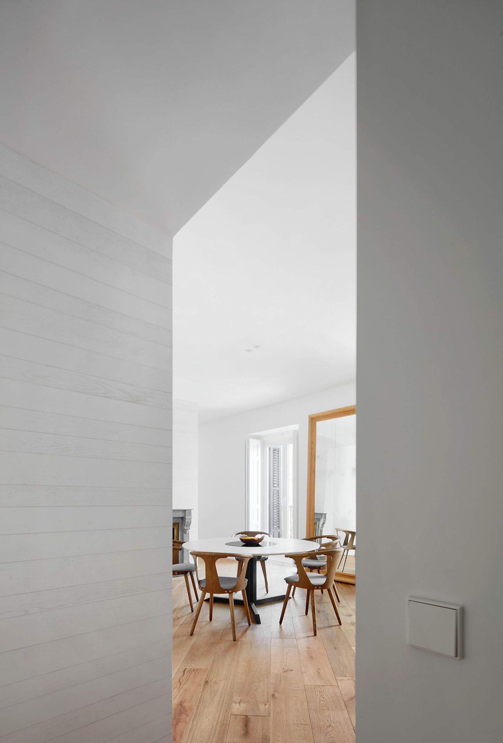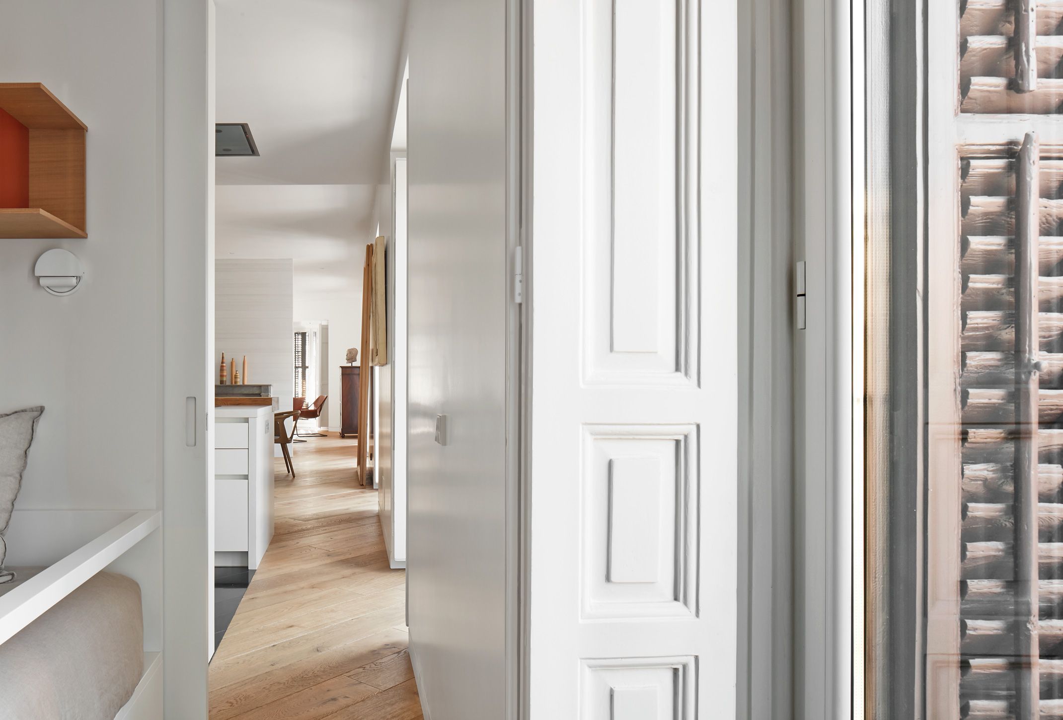 PV2 is a house in the expansion district of Madrid, close to Retiro Park, in a building of the late nineteenth century.Originally, Estudio Lucas y Hernández-Gil found a house with a marked longitudinal character, fully compartmentalized and connected by a large corridor. The firm strategy consisted on the joint of the spaces giving absolute value to the lineal development of the facade with its nine balconies (something unusual in this type of house, that are usually deep and with a little bit facade).
