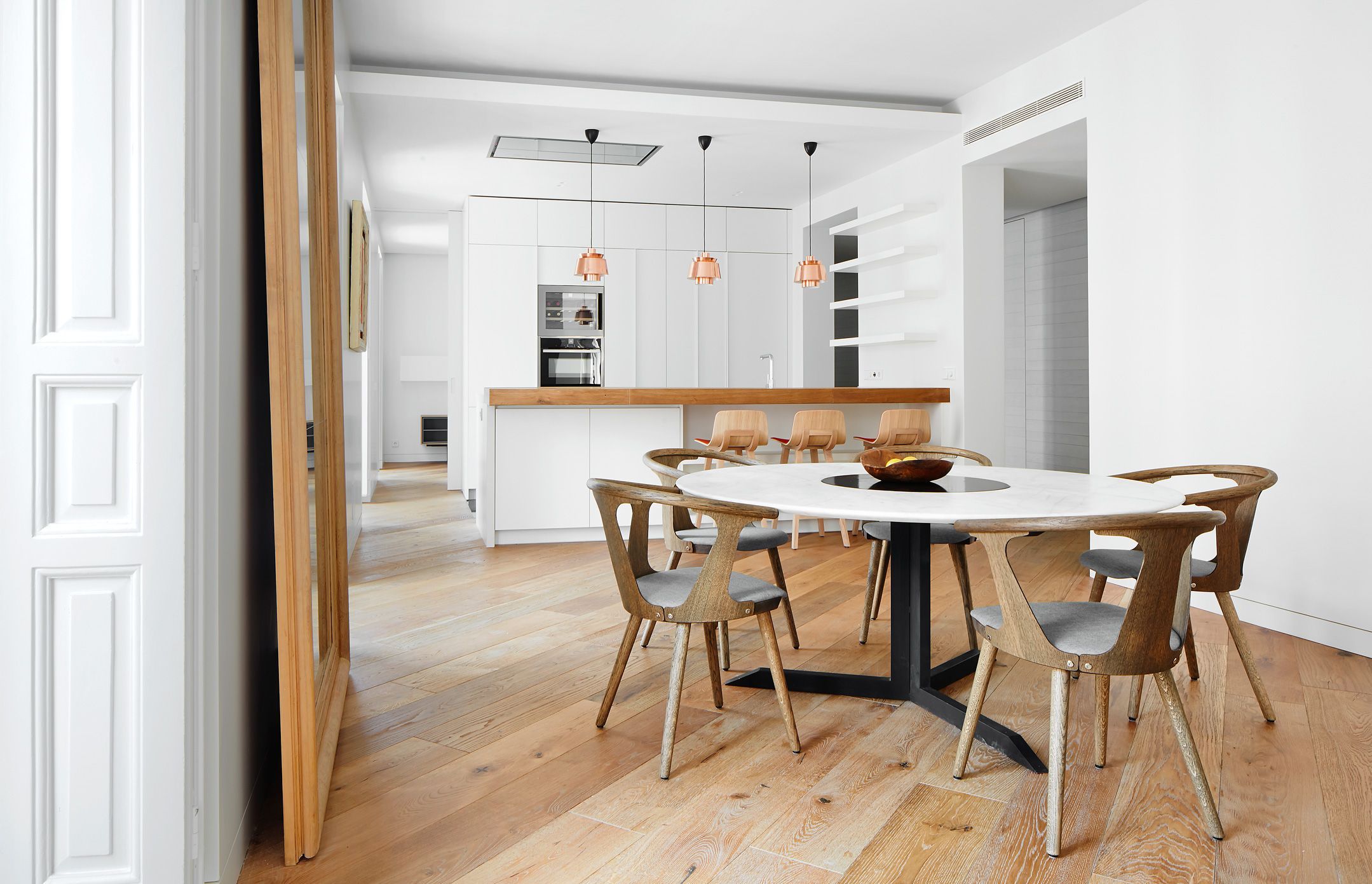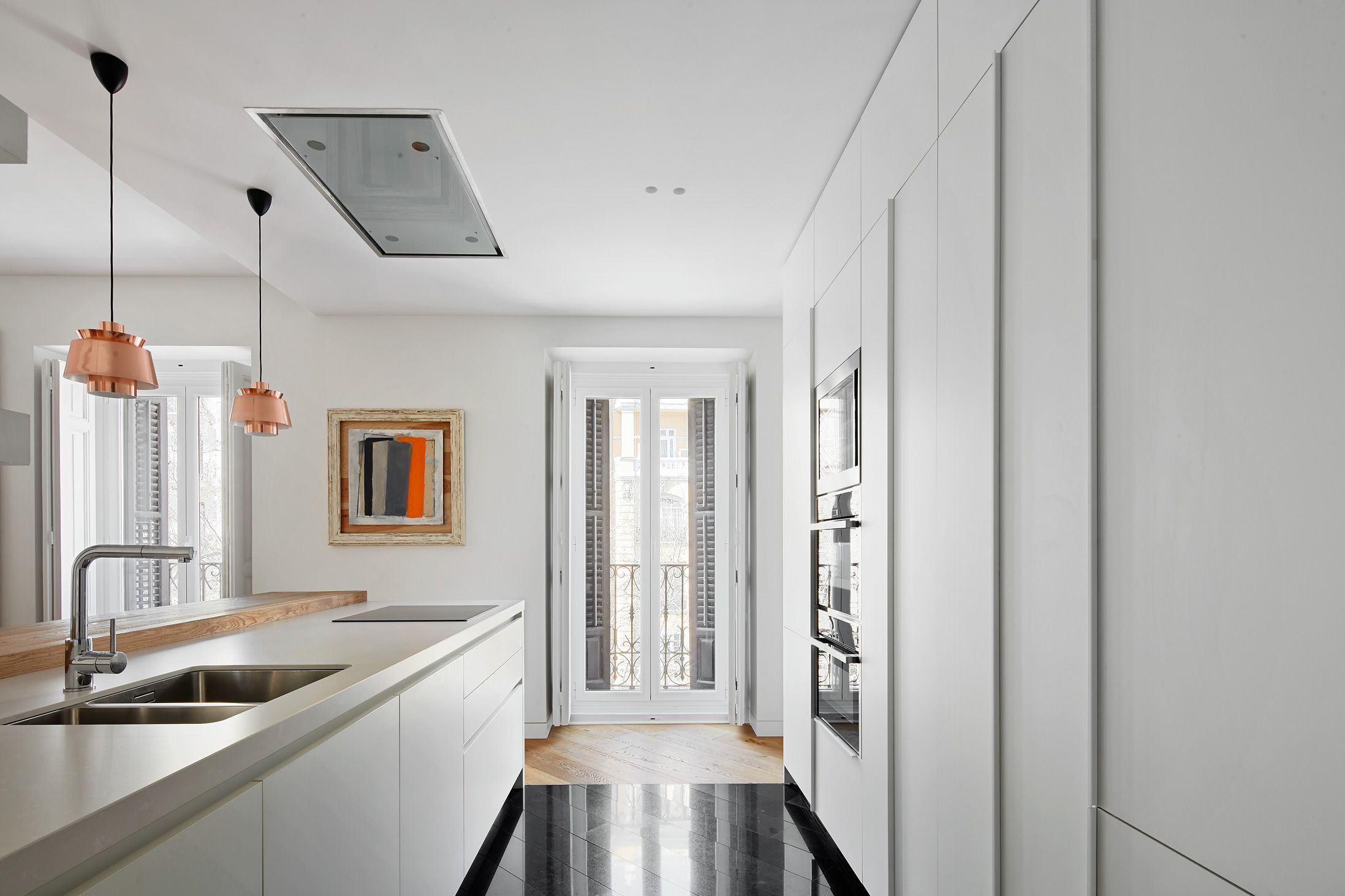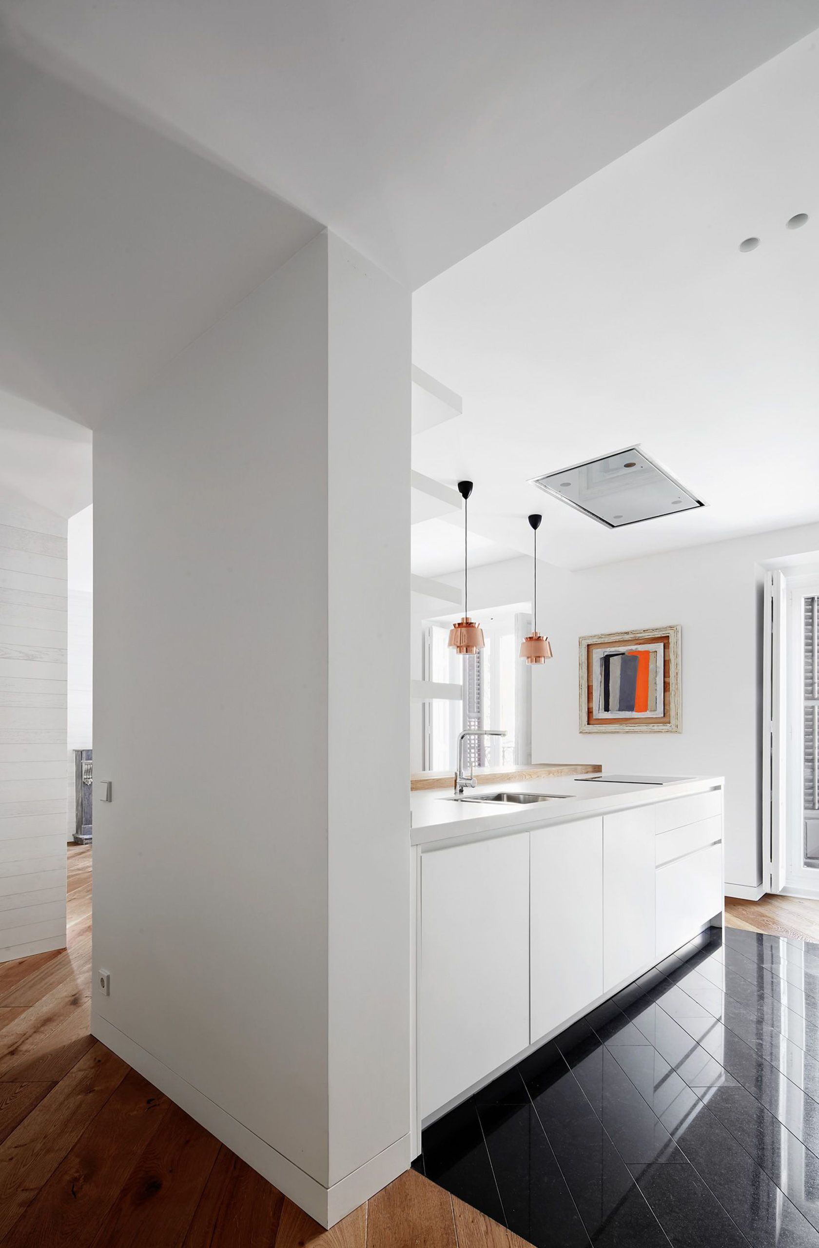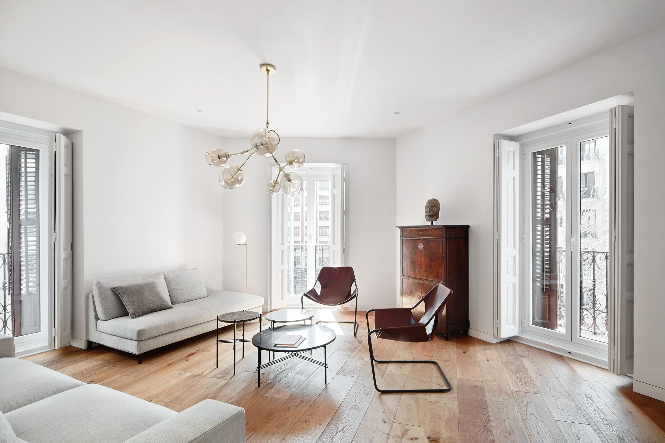 PV2 is a house in the expansion district of Madrid, close to Retiro Park, in a building of the late nineteenth century.Originally, Estudio Lucas y Hernández-Gil found a house with a marked longitudinal character, fully compartmentalized and connected by a large corridor. The firm strategy consisted on the joint of the spaces giving absolute value to the lineal development of the facade with its nine balconies (something unusual in this type of house, that are usually deep and with a little bit facade).