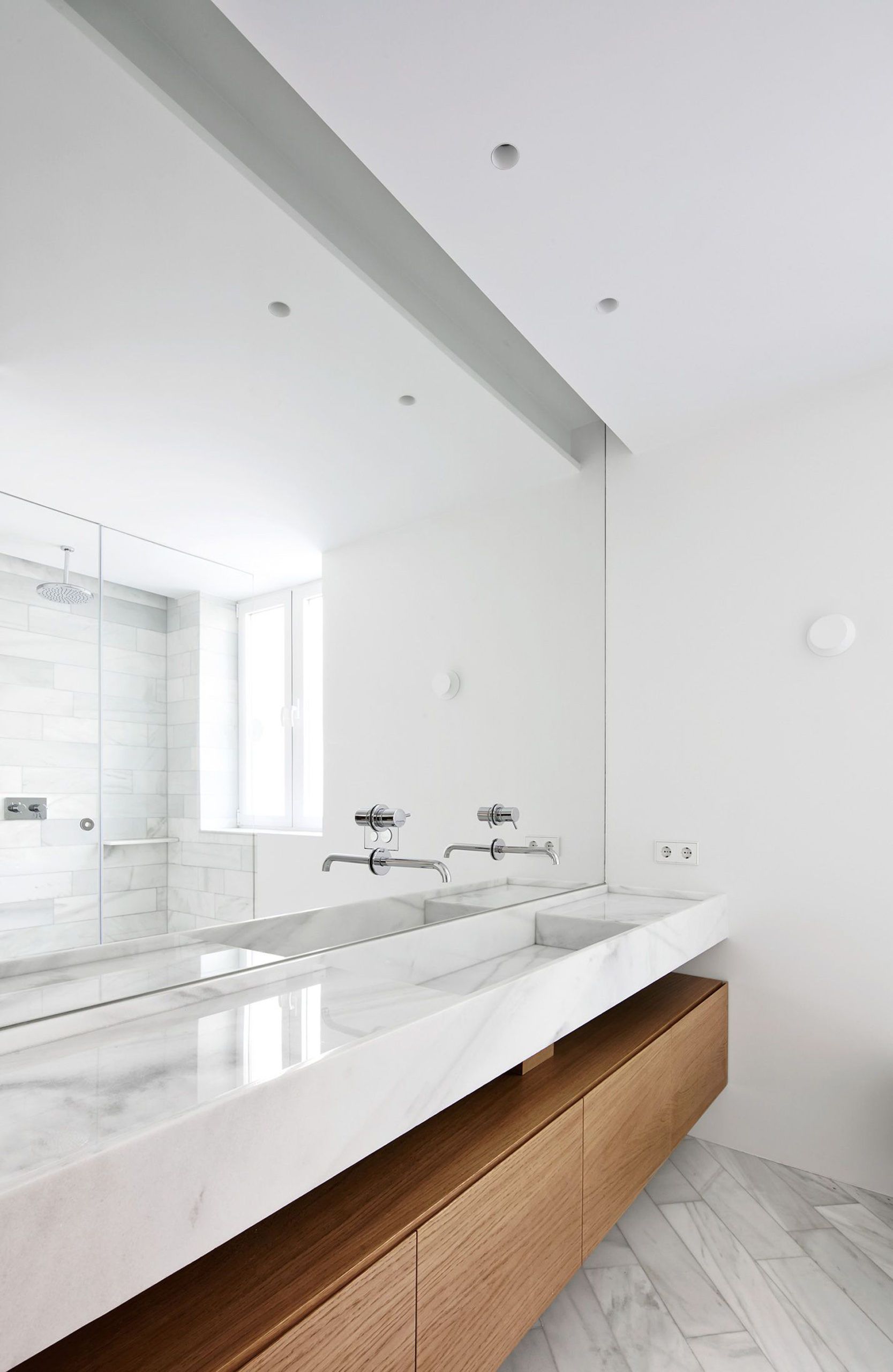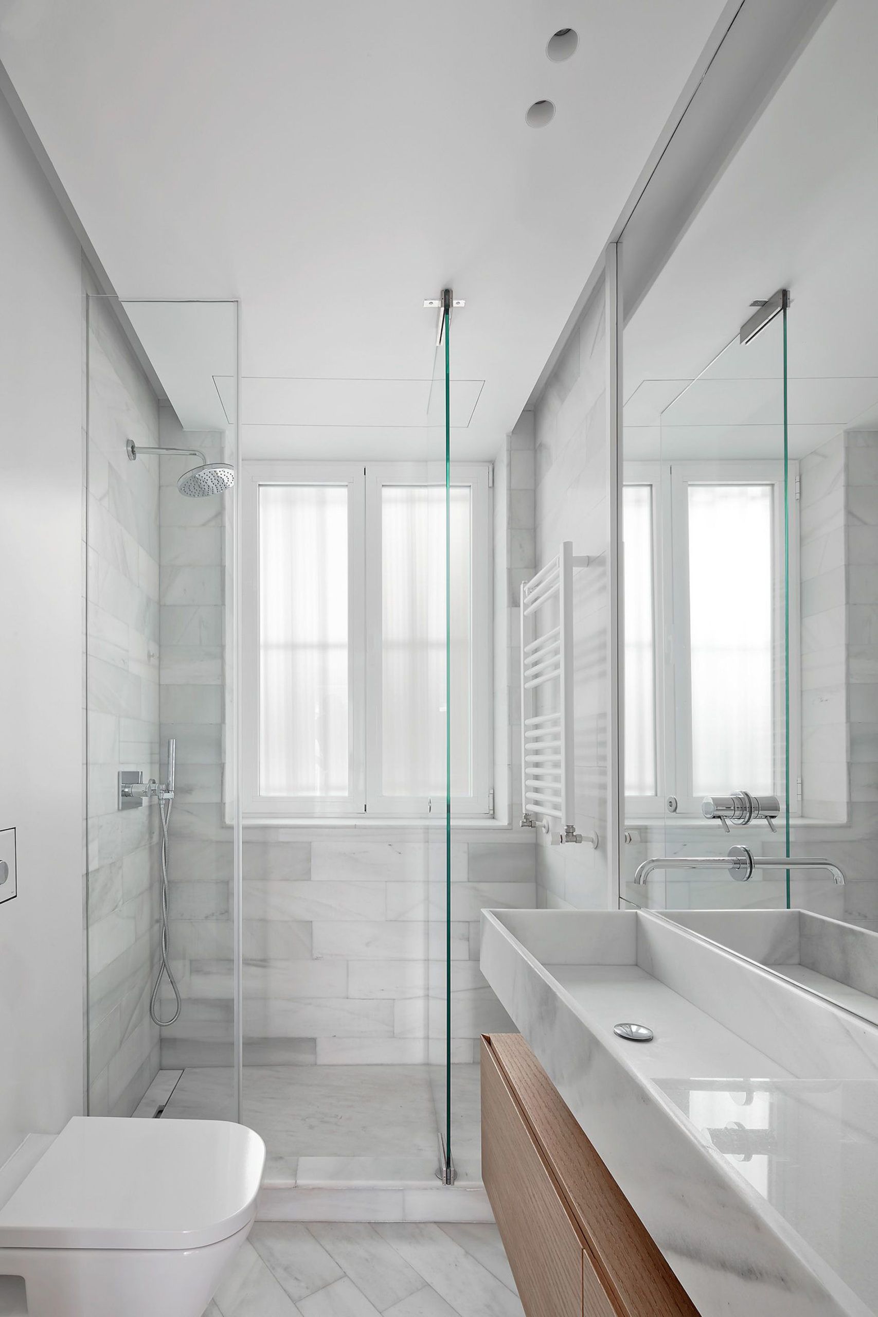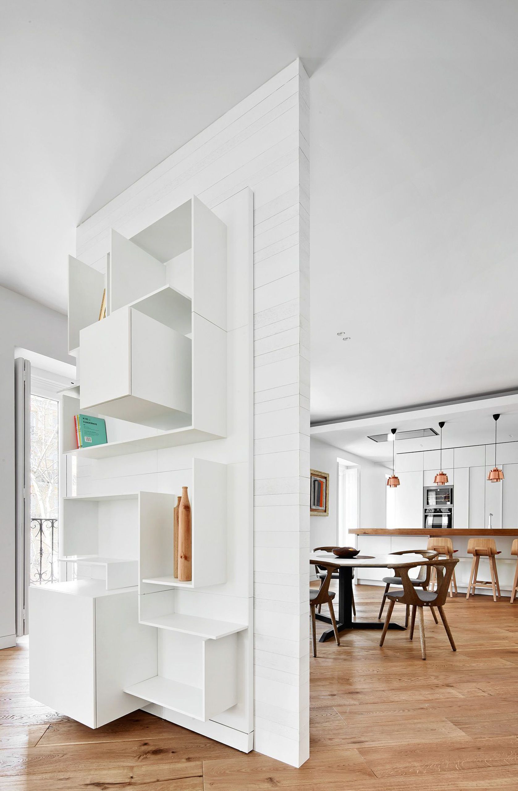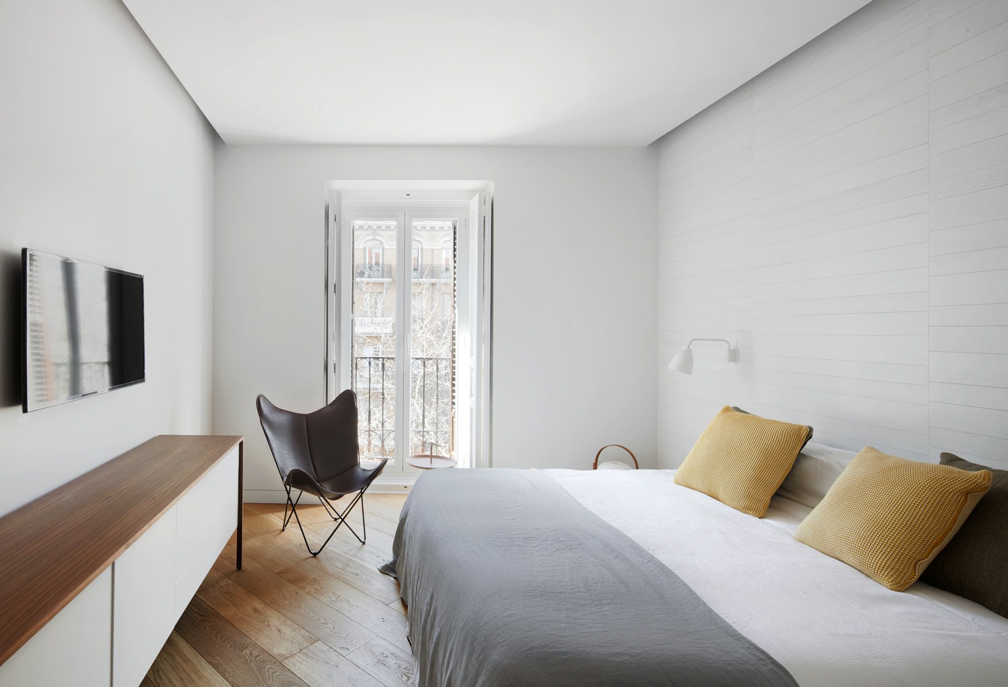 PV2 is a house in the expansion district of Madrid, close to Retiro Park, in a building of the late nineteenth century.Originally, Estudio Lucas y Hernández-Gil found a house with a marked longitudinal character, fully compartmentalized and connected by a large corridor. The firm strategy consisted on the joint of the spaces giving absolute value to the lineal development of the facade with its nine balconies (something unusual in this type of house, that are usually deep and with a little bit facade).