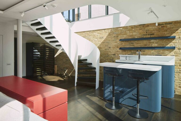 This project involved creating a beautiful helical staircase to connect upper and lower ground floor on a large semi-detached Victorian Villa in south west London. This large semi-detached Victorian Villa in south west London had been comprehensively modernized in 2016 but, on their first visit to the property, it was clear to our clients there was a problem. Relative to the scale of the building, the kitchen and living spaces were undersized and there was no main space from which to enjoy the beautiful south facing back garden. Meanwhile a large open plan area on the floor below was under-used as a gym/games room, accessed by a back stair on the other side of the house… The solution was to connect the upper and lower ground floors directly to form a single space on two levels via a beautiful sculptural helical staircase. This new stair would connect the enlarged kitchen…