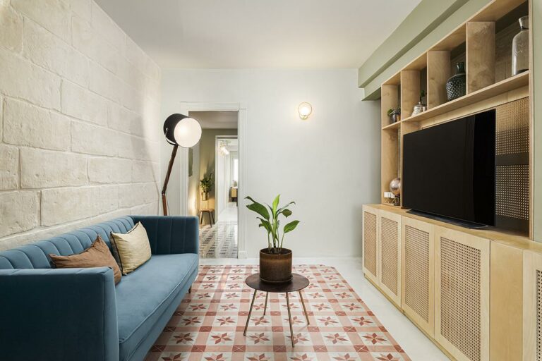 Through this project designers showcase a fusion of contemporary design and a deep respect for Maltese architecture. This project reflects their ethos: blending practicality with cultural heritage, offering both comfort and style in compact living spaces. The project is located in the heart of Cospicua, Malta. The living area features a harmonious balance of soft, muted tones, including beige and blush pink, which create an inviting atmosphere. A built-in olive-green bench echoes Malta’s historic use of natural materials, while vibrant mustard-yellow pillows add a modern Mediterranean touch. Above the bench, framed artwork celebrating Malta’s architectural and cultural legacy lends a personal and eclectic feel to the room. A standout feature of the space is its intricate, patterned tile flooring a nod to traditional Maltese tile craftsmanship. This design choice brings a timeless, artisan aesthetic that contrasts beautifully with the minimalist round glass table and sleek black stool, achieving a perfect…