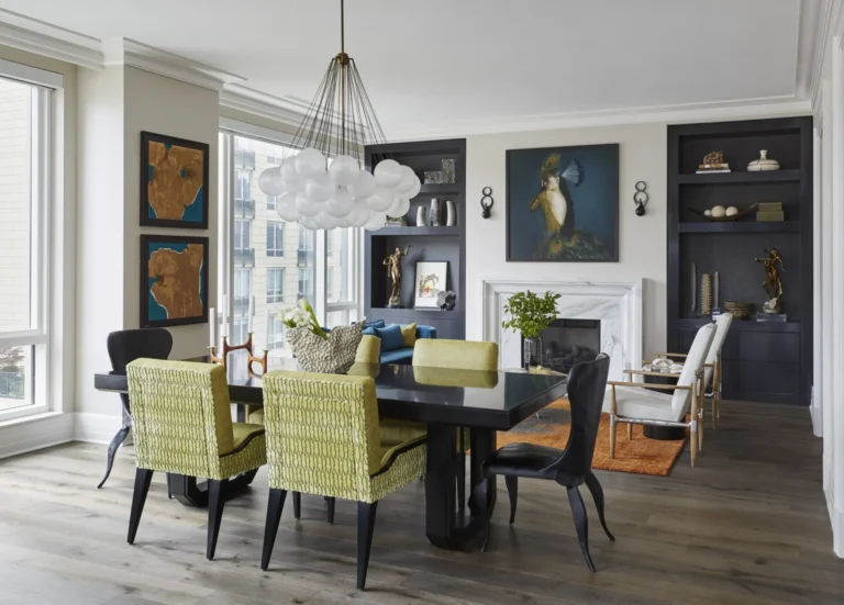 Located in Chicago’s iconic East Lake Shore Drive historic district, this 1920s co-op had been renovated but not designed to capture its full potential. This space by Donna Mondi Interior Design, showcases a dynamic mix of traditional and modern design, with a captivating emphasis on art. Designs throughout blend old and new, sleek and primitive, colorful and neutral – all the while creating cohesive spaces that evoke differing emotions but blend seamlessly from room to room. Layering in furnishings from different time periods not only shows reverence to the architectural history of the home but also creates a more timeless interior. Photography : NICK NOVELLI See also : https://house-diaries.com/one-bennett-park-a-luxury-condo-in-chicago-usa/