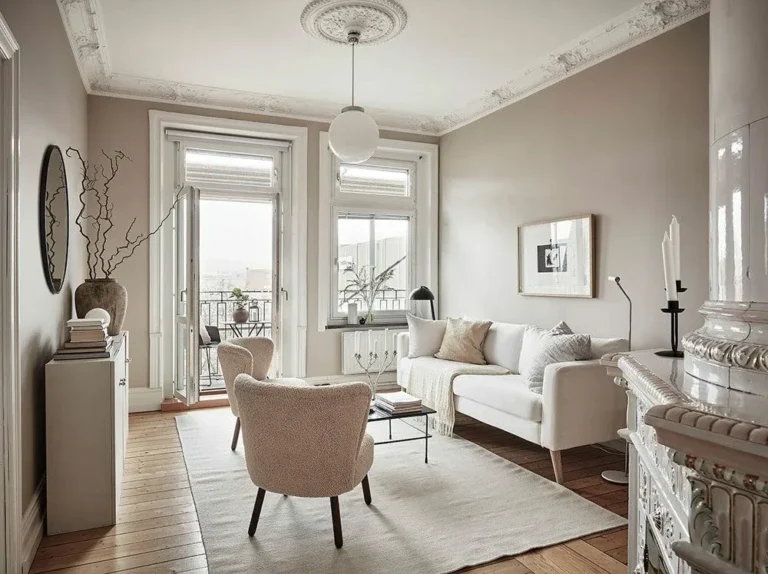 Completely beige interior – what could be more boring and banal, many of us would say. But Scandinavian designers recently are trying to rethink this shade in design, showing it in a fresh and more favorable way. In this Goteborg apartment , we can see a beautiful classic stucco molding, a small fragment of a brick wall, as well as a typical Scandinavian decor – and for such a mix, the designers chose a nice beige shade of wall paint. We can say that it turned out simply awesome – the home is delighting the eye and radiates coziness!