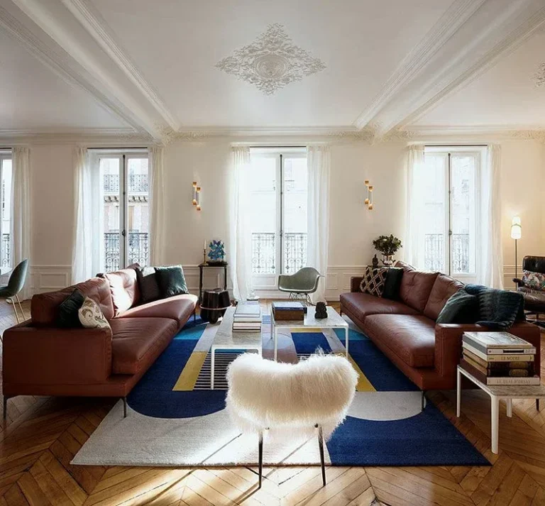 Traditionally French herringbone parquet and stucco moldings in this Paris apartment were complemented with the furniture of noble shades and various textures of marble. The living room features an amazing combination of brown, blue and mint, and a magnificent wall with gray flora wallpaper completes the image of the room. The kitchen here is very minimalist: there are a lot of open surfaces and almost no appliances – that means the owners are not used to cooking often. The hallway is decorated with a gorgeous console made of green marble, which is also seen in the bedroom, dressing room, and in the bathroom (floor, sink and shower). True French chic for modern living!