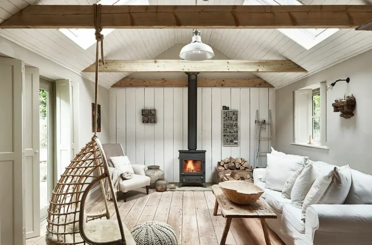 Called The Dairy House, this English cottage is located in the Hampshire countryside and is part of the Beegreen Locations portfolio, which specializes in renting beautiful houses for photography in England. Its rustic brown decor creates a soft world, matching perfectly with its old walls and wooden beams. Its blue wooden shingle facade hides a bright interior where vintage and country spirits dominate. The kitchen is exemplary, with a bucolic yet contemporary style combined with shaker-style furniture, an Aga cooker and a grand piano. Bleached parquet flooring, patinated wood, limestone floors, all contribute to the success of this rustic brown decor, bringing light and softness to the country style with its noble characters. The beautiful attic bedrooms are decorated with the same quest for peace and tranquility and offer beautiful relaxation areas. Photography : Rachel Whiting See also : https://house-diaries.com/100-year-old-balinese-house-turned-into-a-zen-retreat/