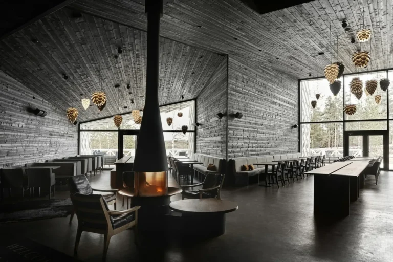 One of Studio Puisto’s designs stands in a coniferous forest in Rovaniemi, the capital of Lapland. Emma Johansson and co-designers got the assignment to design the Arctic TreeHouse Hotel in August 2015. The next year in November, the unique luxury hotel with treetop views opened on the Arctic Circle. The inspiration for the accommodation concept – set on a steep natural slope – came from Nordic nature and culture as well as the magical world of SantaPark. A vision started to form: small individual accommodation buildings set in nature, their spirit highlighting characteristics of the area and creating an optimal setting for experiencing both nature and arctic mysticism. The suites that stand on stilts draw inspiration from a classic Finnish toy, “käpylehmä,” meaning pine cone cow. All suites have window walls facing north for viewing the Northern Lights and the surrounding forest in comfort. The wooden hotel won the first prize…
