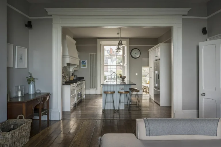 The property is a three storey over basement seafront house at Ardenza Terrace in Monkstown, Dublin. The building is a protected structure dating from 1854. When the owners purchased the house as a family home in 2013 it was in need of complete refurbishment, in addition a small extension was added to the rear as part of the works. The front façade of the house is north facing, with the result that the main reception rooms, whilst having fantastic sea views, were without sunlight. The design introduced a kitchen / family room space stretching from front to rear at ground floor. This flows into the new glazed dining room extension which connects the living areas with the south facing garden. The formal drawing room was retained at the first floor, with the master bedroom at second floor overlooking Dublin bay. Ornate plasterwork and original joinery details were restored throughout the…