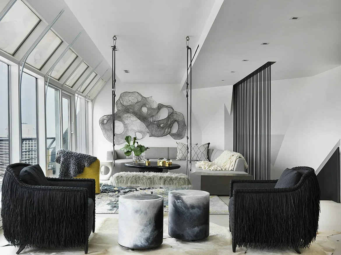 Michigan avenue is a blurry,distant memory when the clouds are your neighbors. So if you live up in the clouds your home should be as striking as your surroundings. Project Interiors‘ clients built a business empire and craved a sophisticated retreat to play, meditate, entertain, relax and let it all melt away. ” A chic exaltation of refined and rebellious: oaxacan pottery, paintings by Picasso + Warhol, lighting fashioned from bike chains, a lounge that doubles as a playground; a yoga studio with a floating lucite daybed cloistered by walnut slab doors; there’s winding corridors with pots of decorative gold at the end of every rainbow. It’s 4,000 square feet of architectural prowess, like Dr. X with design chops”.