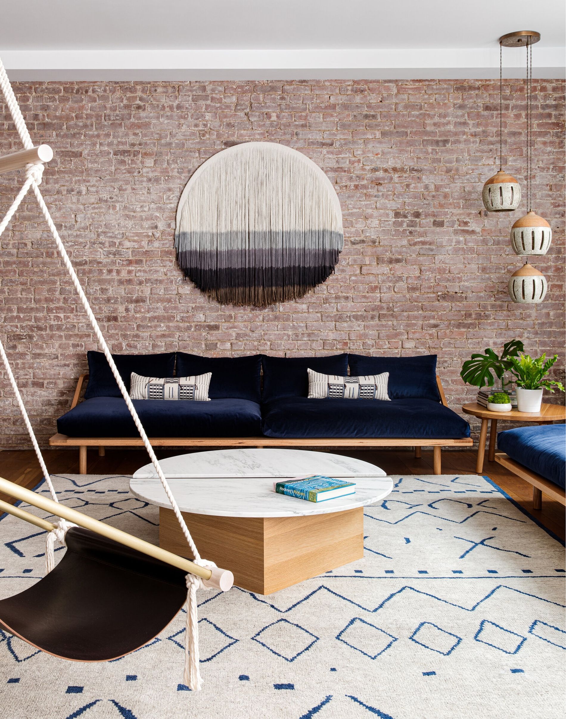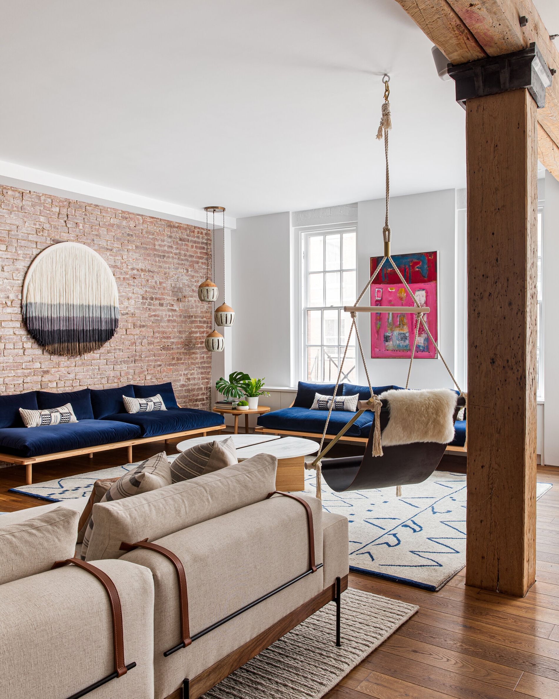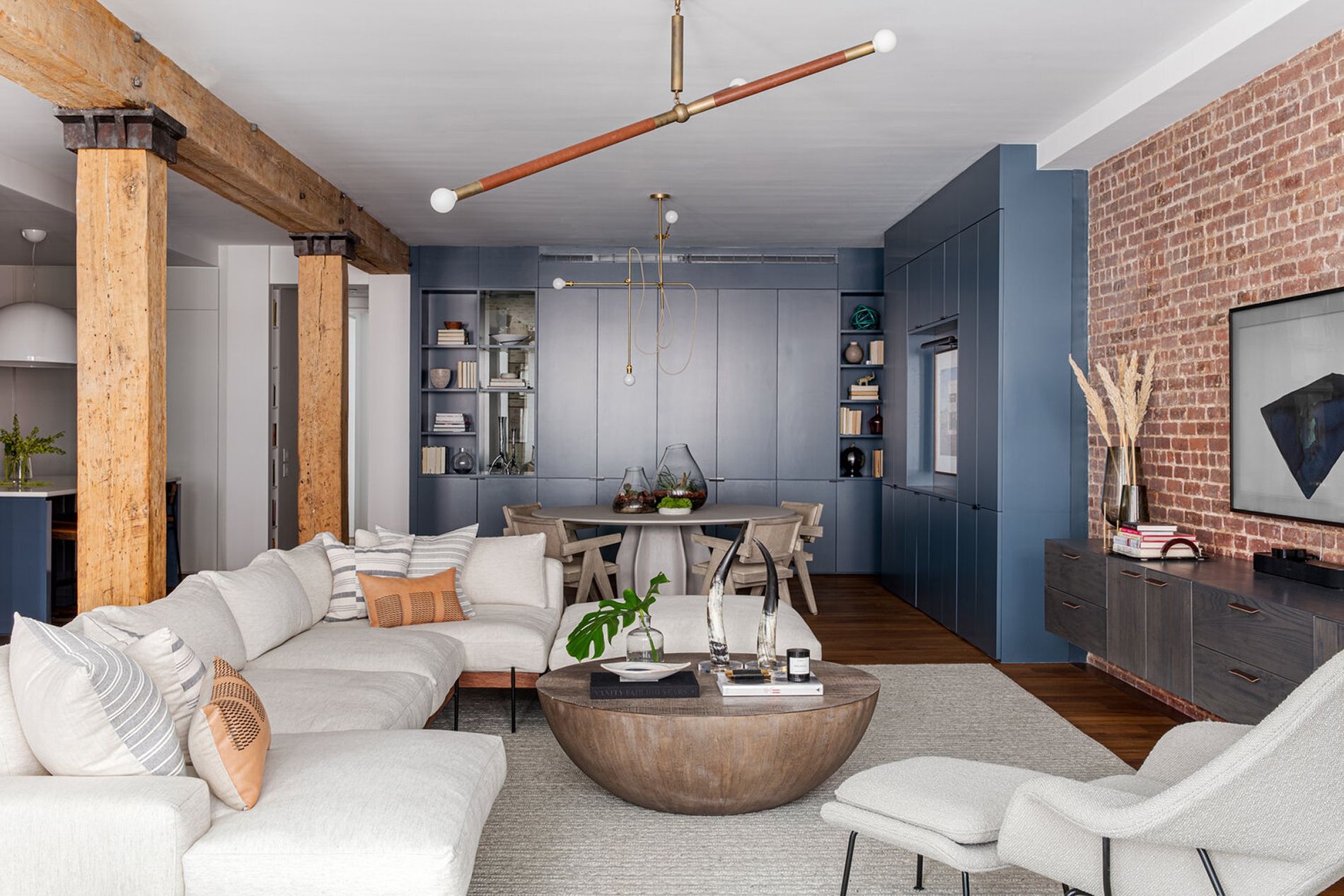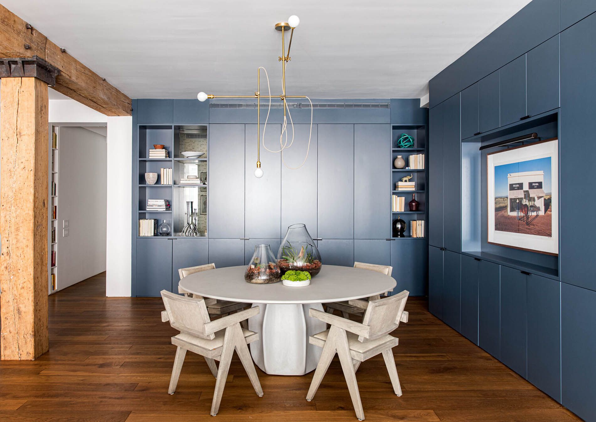 Broderic Design developed a unique, playful, vision for a stylish couple’s Tribeca loft by mixing artisanal furniture with vintage finds for a one of a kind home. Besides the loft-standard set of brick walls and wooden beams, the interiors now have spectacular cabinet furniture of deep blue shade and a diverse decor in ethnic style. Great design for a stylish apartment!!!
