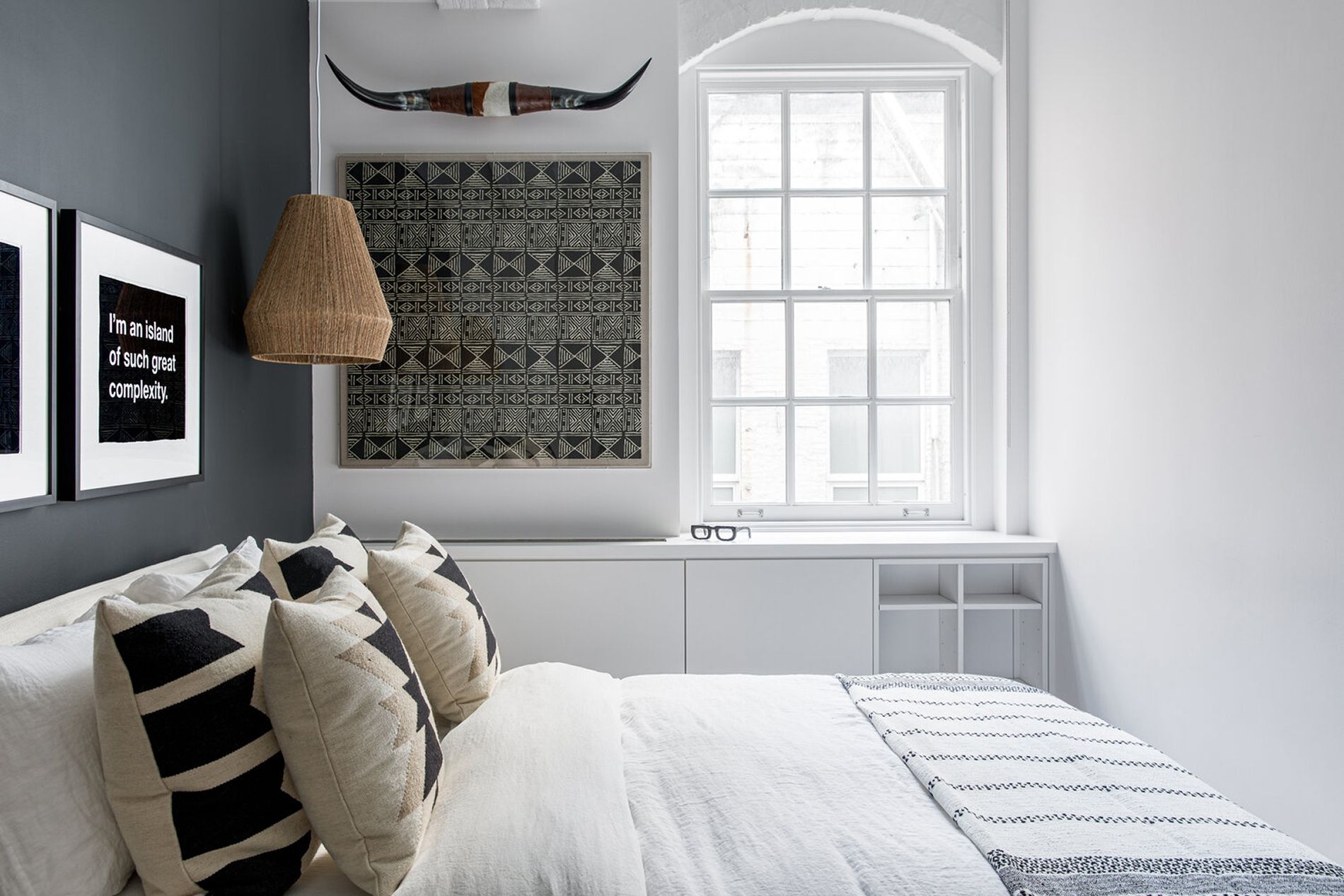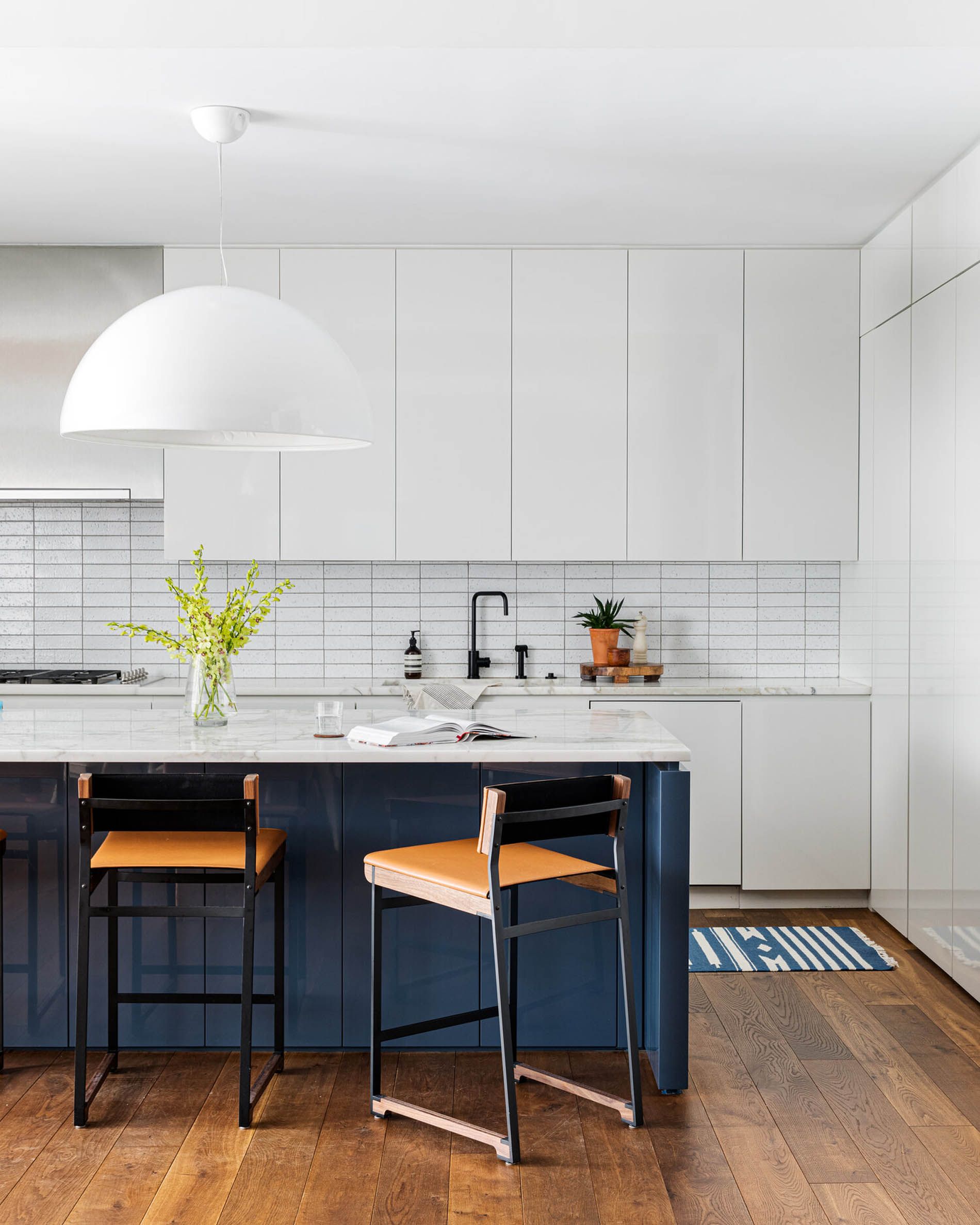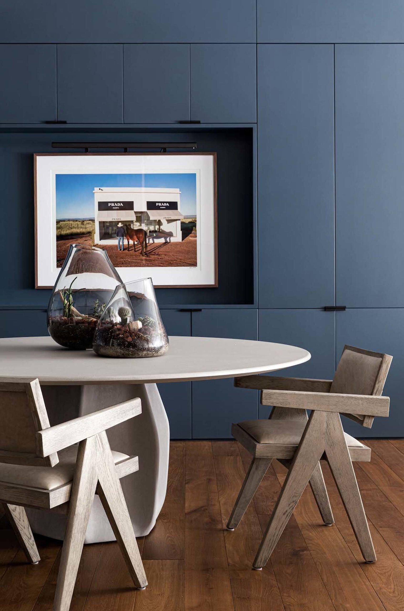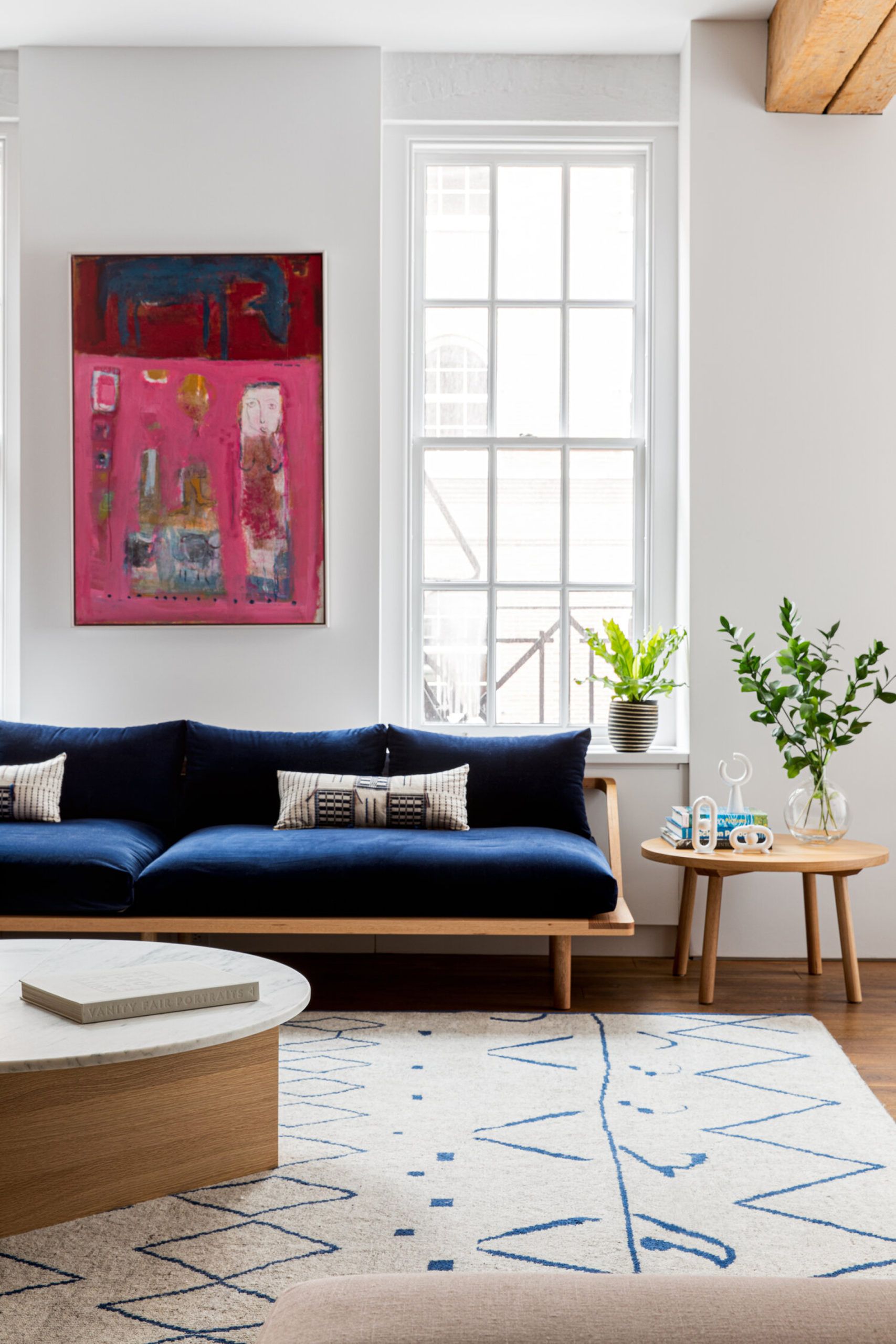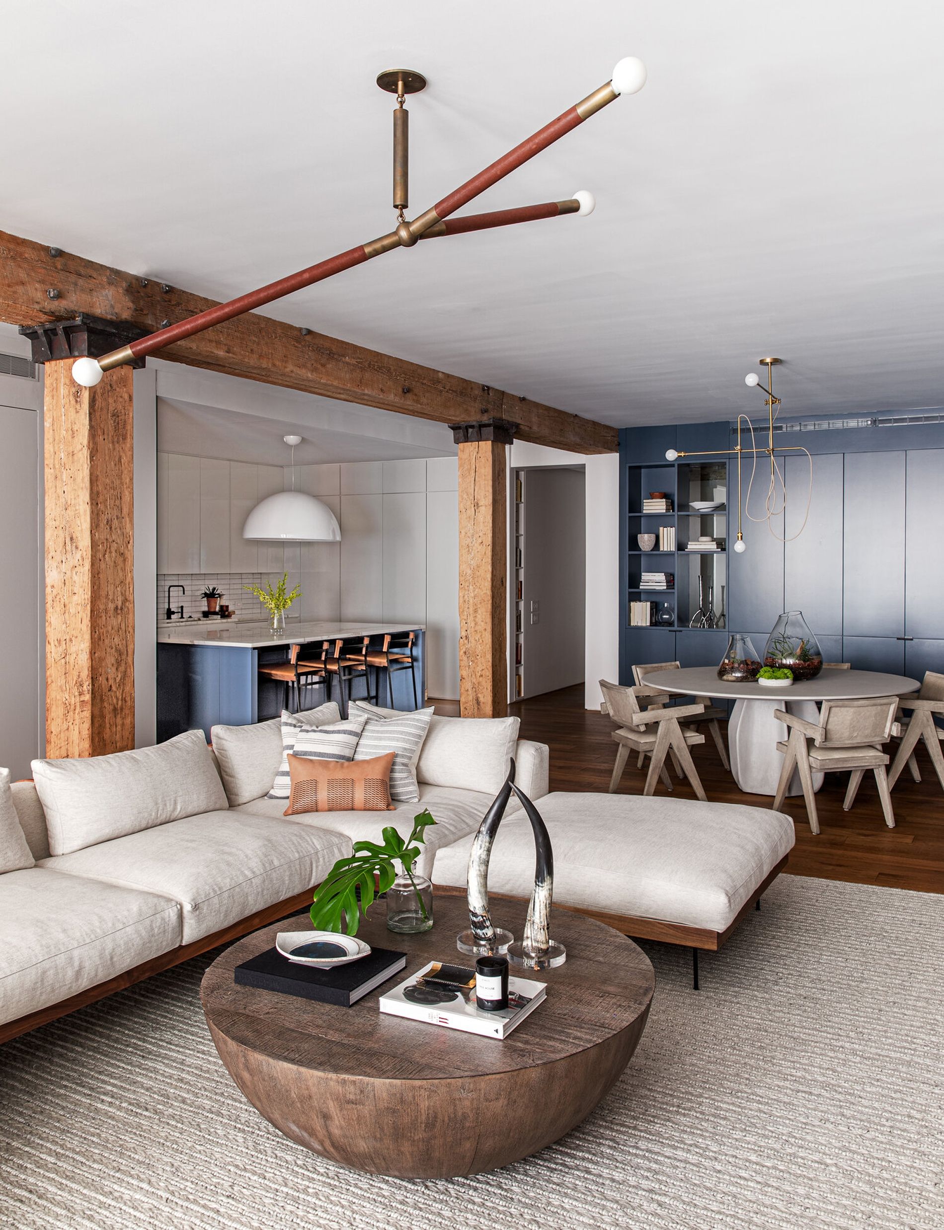 Broderic Design developed a unique, playful, vision for a stylish couple’s Tribeca loft by mixing artisanal furniture with vintage finds for a one of a kind home. Besides the loft-standard set of brick walls and wooden beams, the interiors now have spectacular cabinet furniture of deep blue shade and a diverse decor in ethnic style. Great design for a stylish apartment!!!