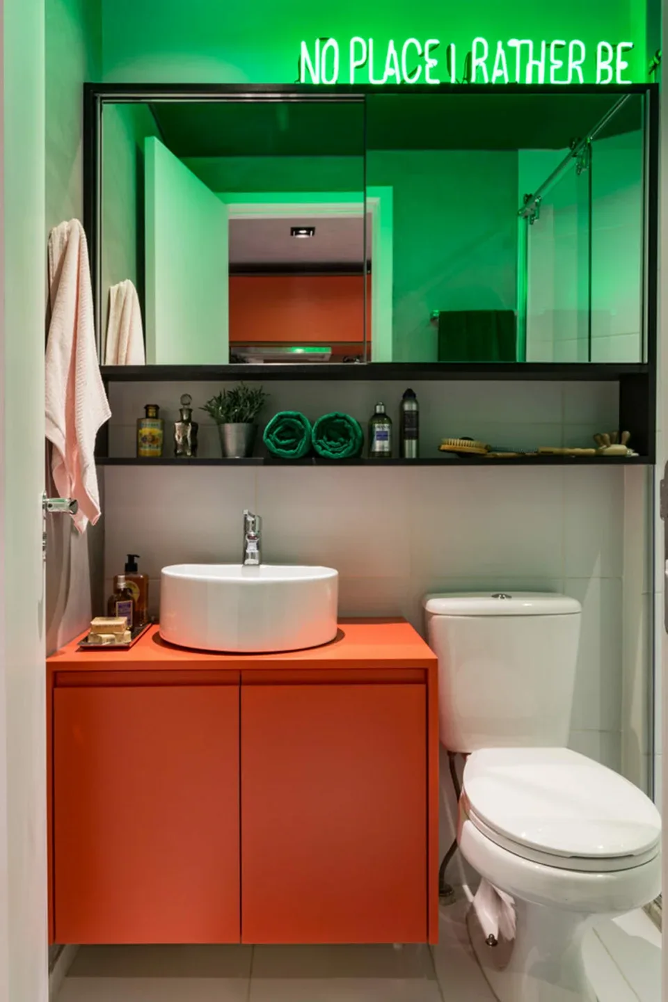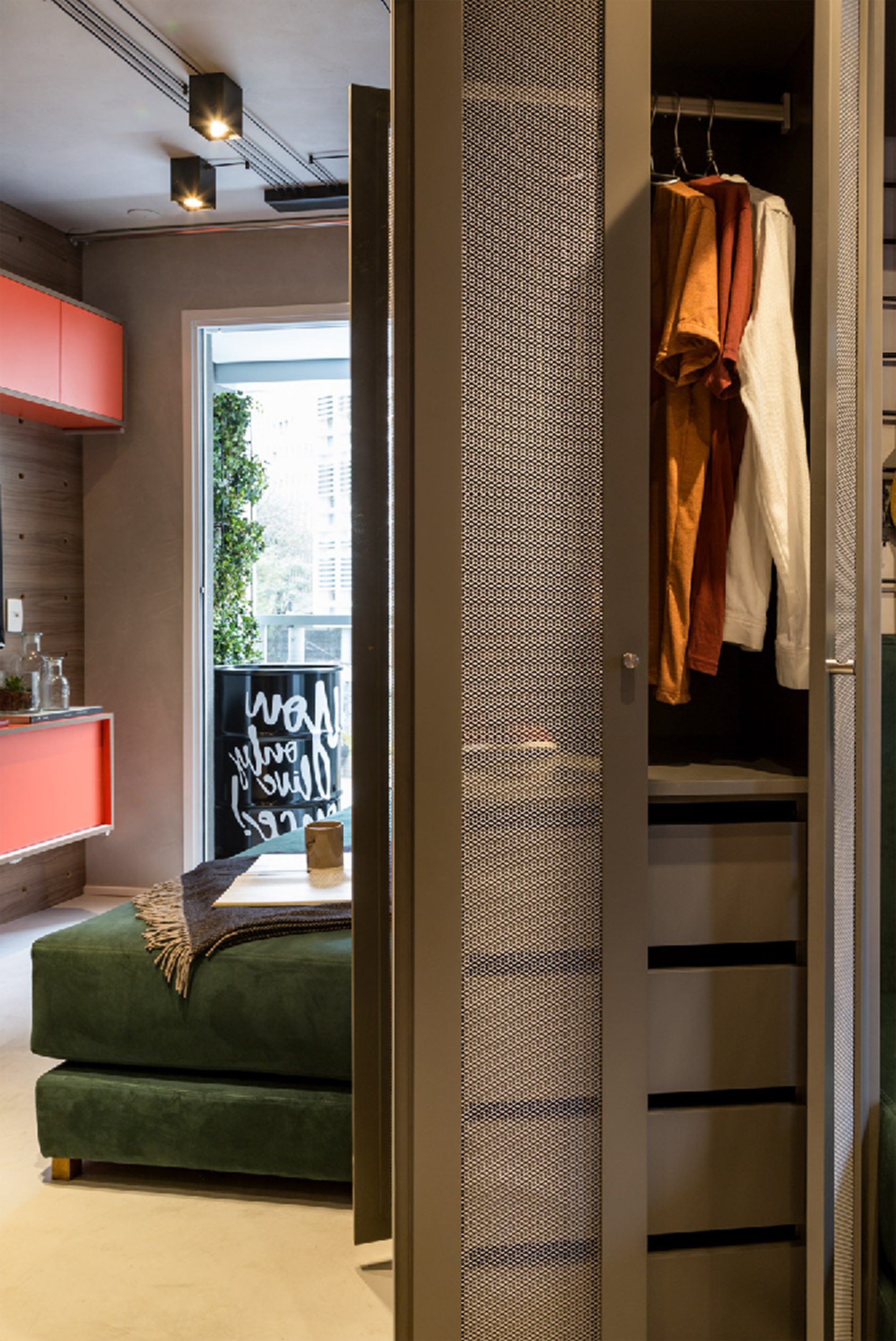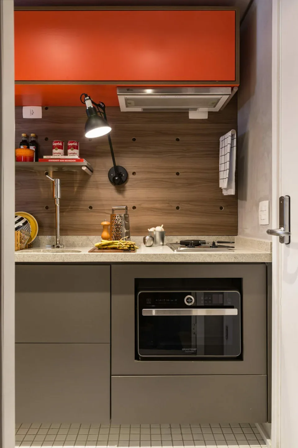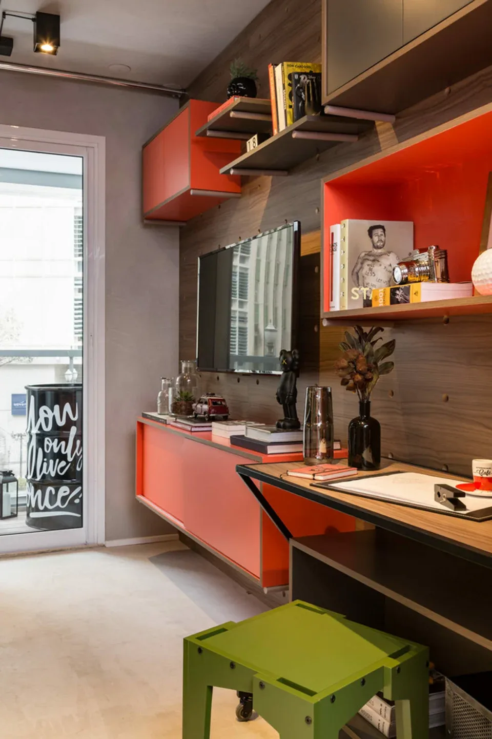 Here is another tiny flat, just 20 square meters by Melina Romano Studio based in Brazil. The designer had searched its inspiration in modern contemporary style but also used strong colors in orange, shades of green and black.