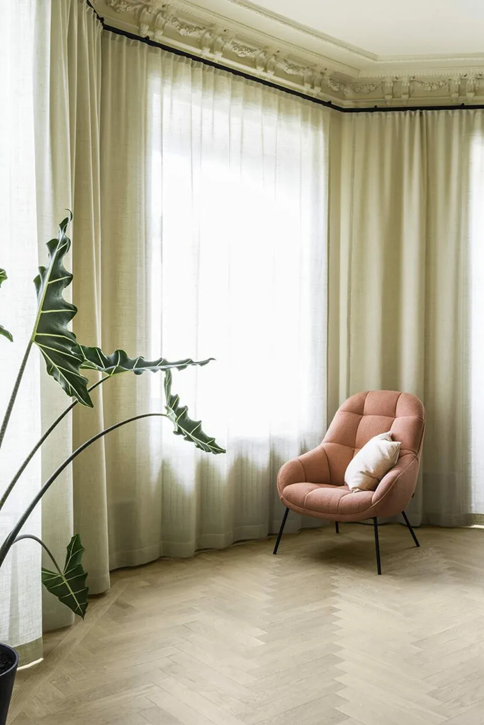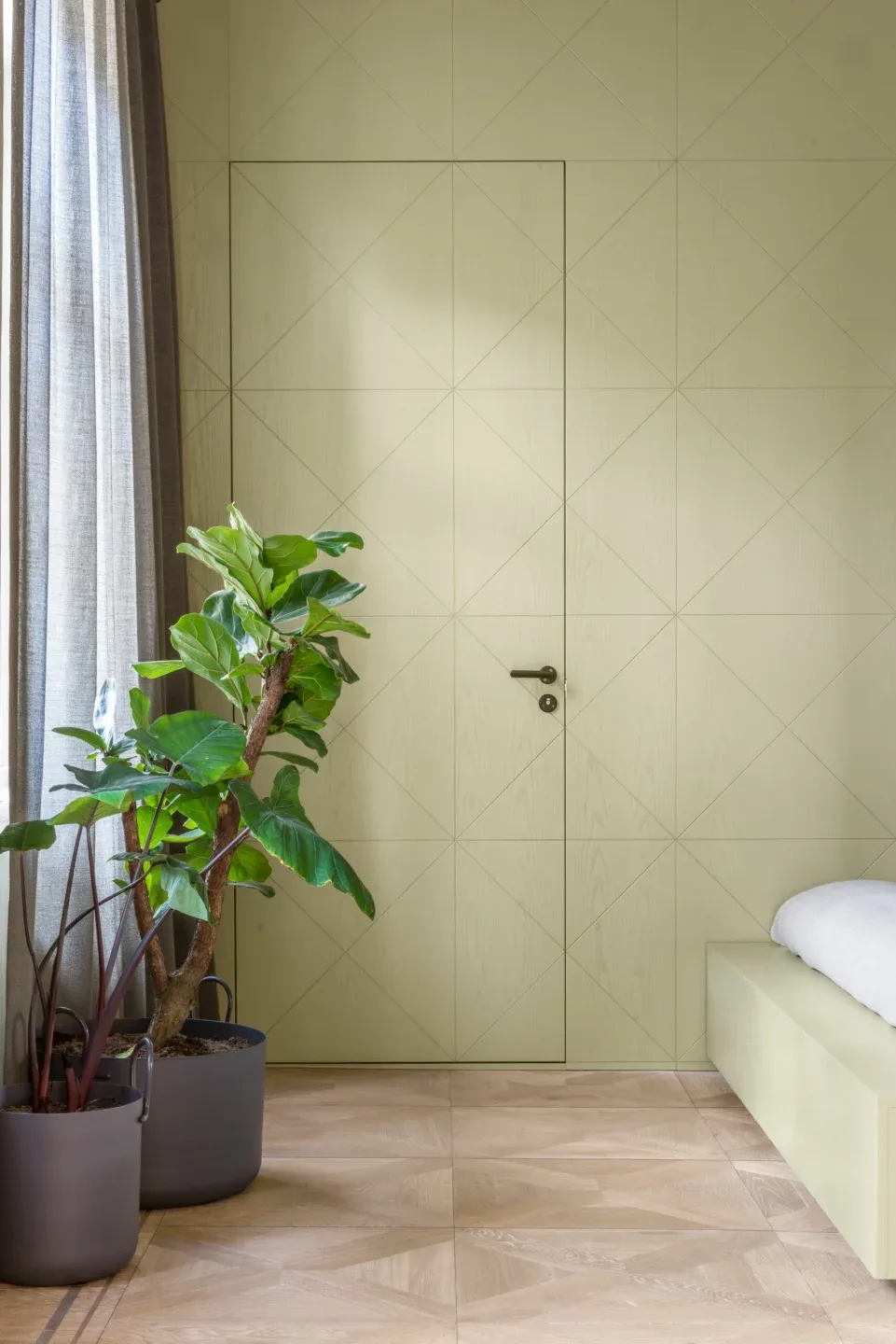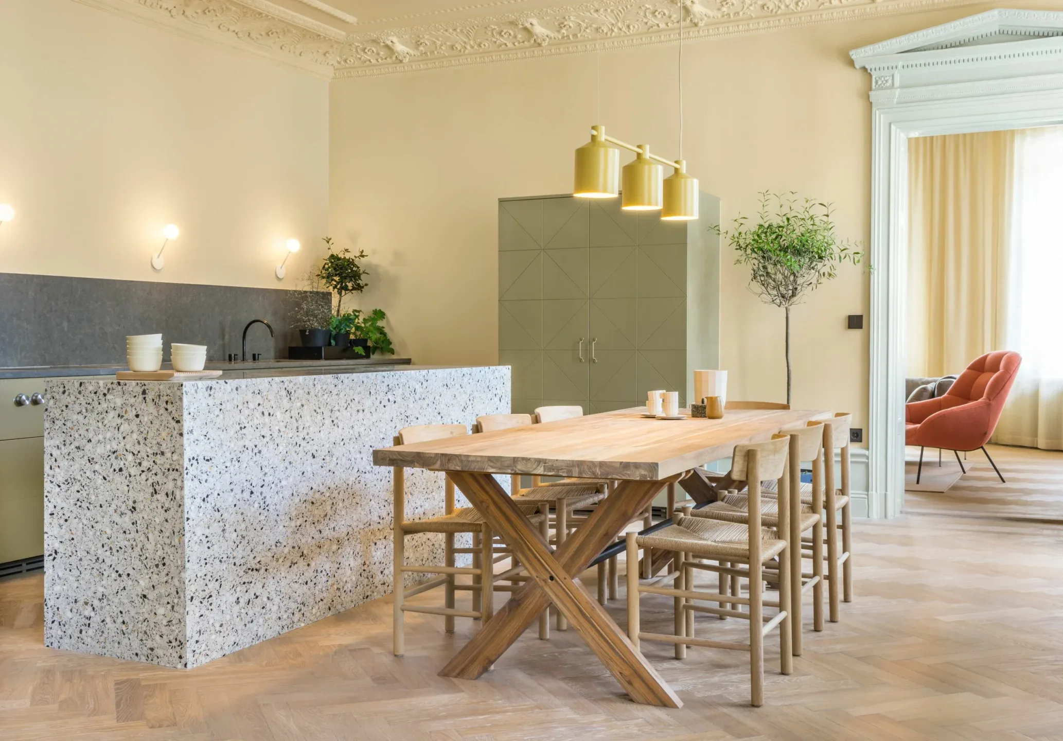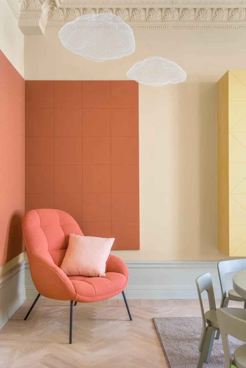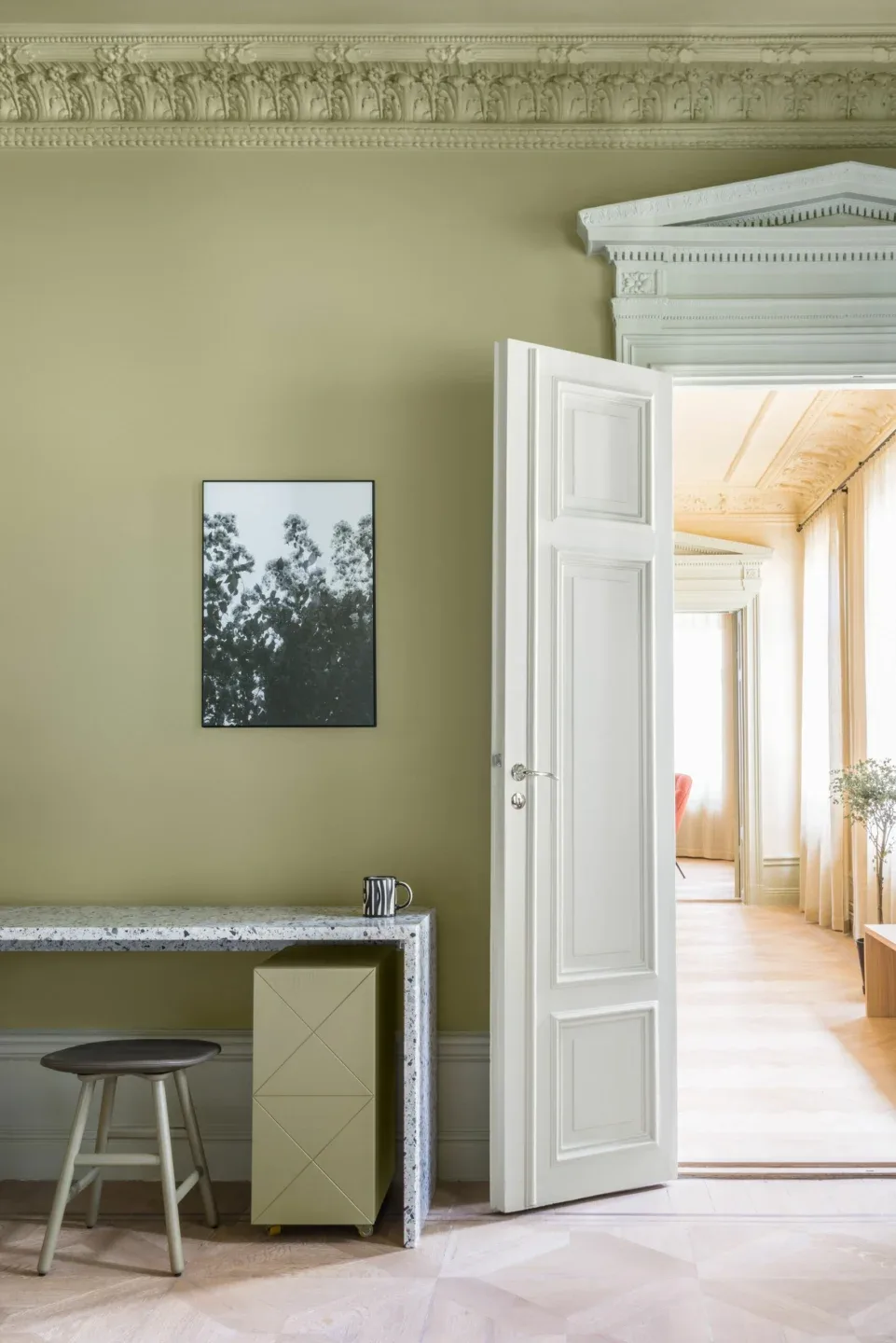 A color palette based on original colours, three expressive tiled ovens, decorations in ceilings and carpentry and an original pattern from a floor – these old traits and peculiarities were the clues that Note Design Studio needed to take a white office space into a contemporary direction. The result is a harmonious but rich color experience – inspired by the original splendour – and a new home for their client and his children.