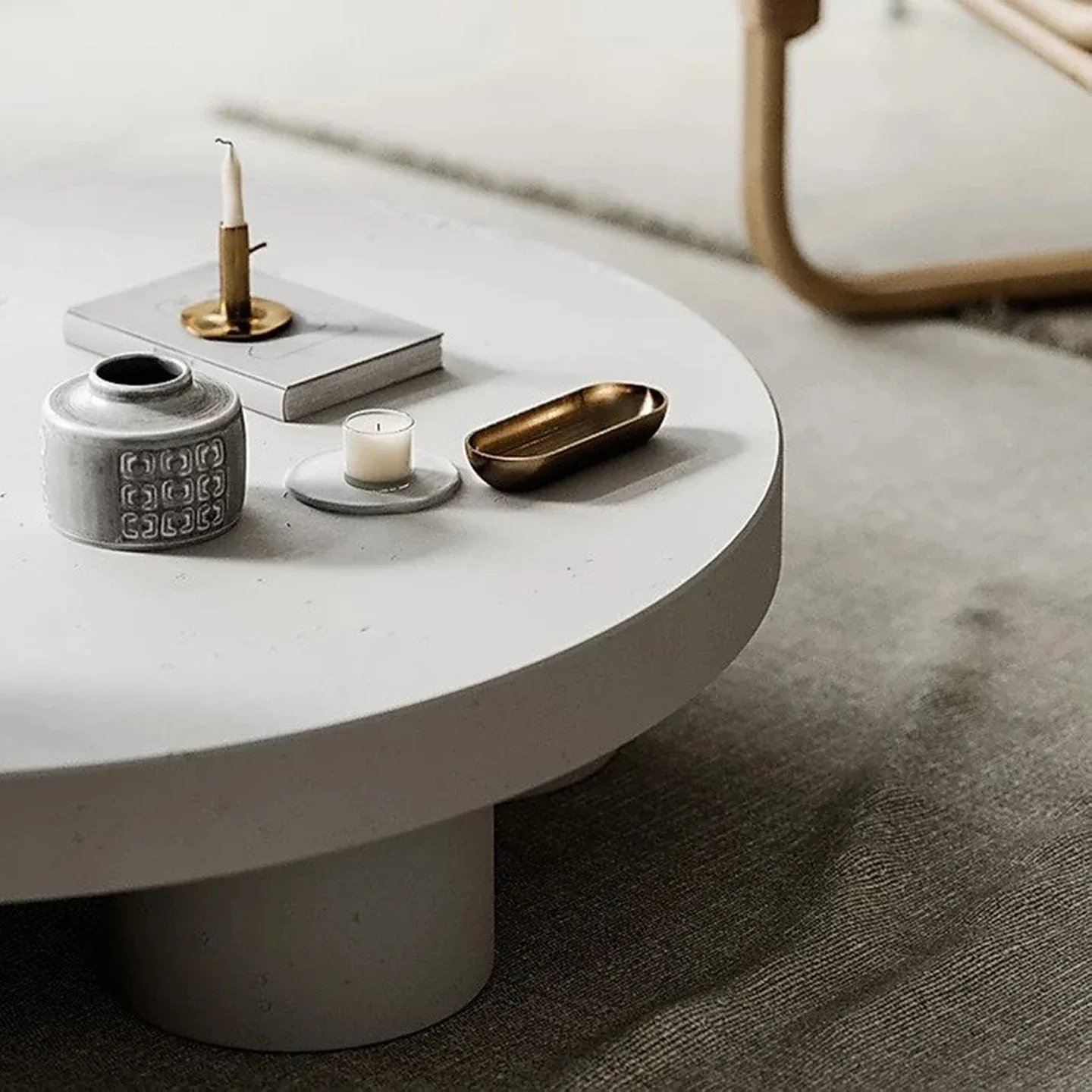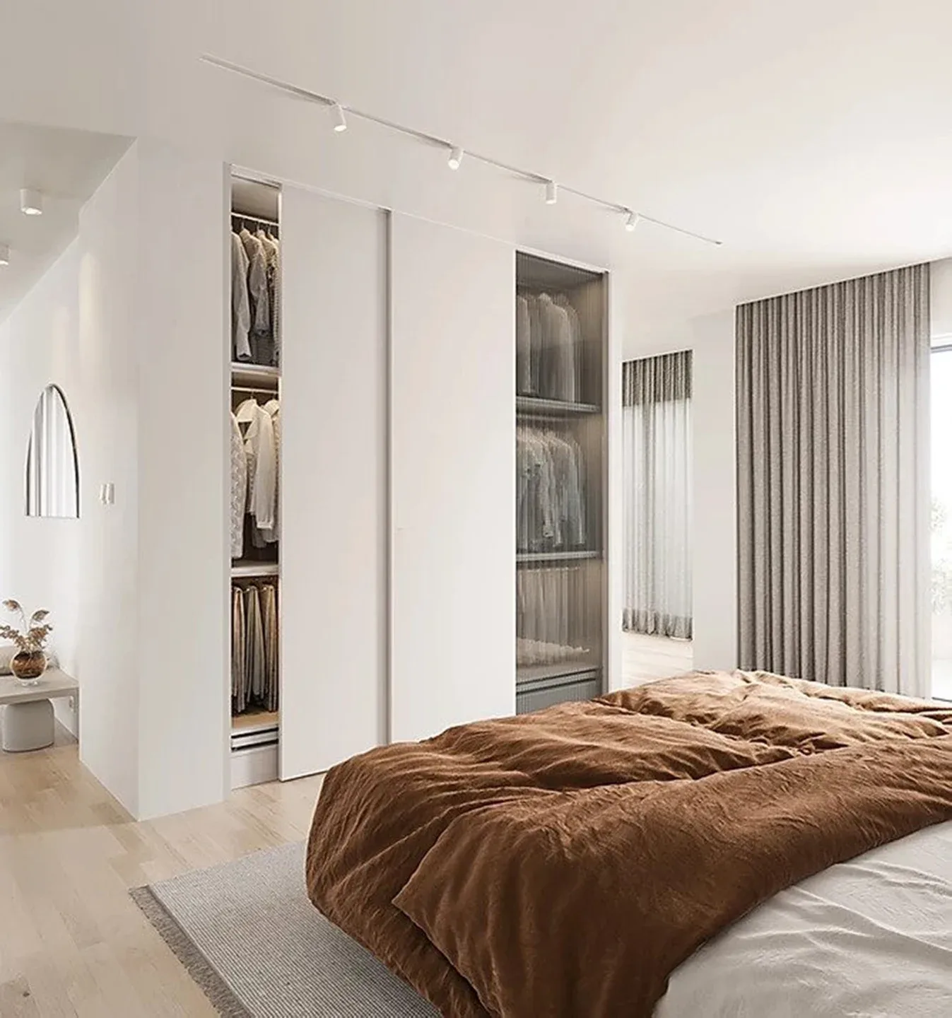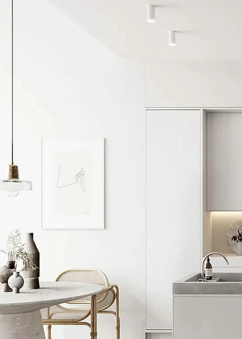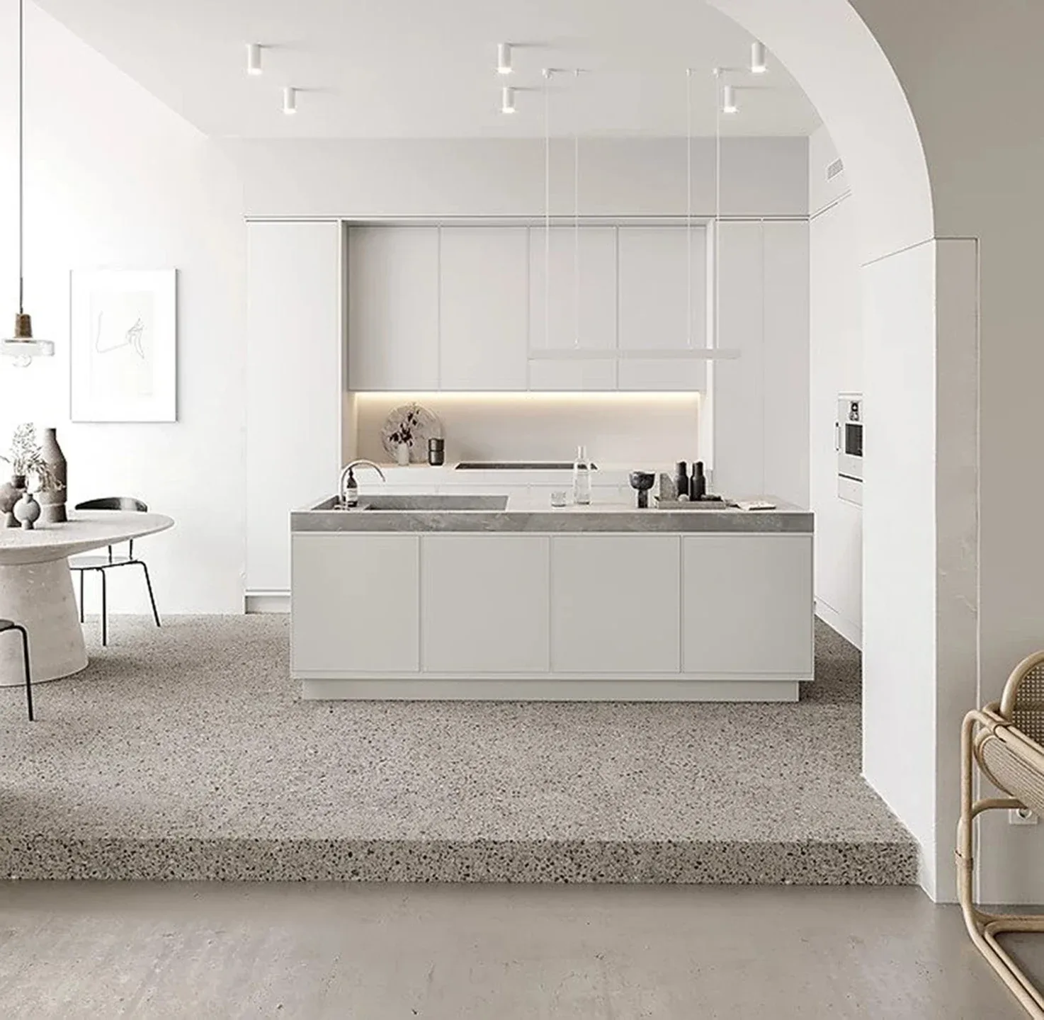 Pale interior concept residence is fluid and minimalistic, with tactile elegance emphasize on bright architectural aesthetic encompassing living, kitchen and dining room in an open space with no official dividing. The neutral Pale palette is displayed through raw materials including concrete, dry-shade terrazzo, glass, wood and plaster. Natural stone and concrete floors reflect natural light from full-height arch shaped openings bringing nature’s influence inside the house and referencing the colours of Nordic ambient. For the furnishing layout they pumped most of the items from Danish design brands.
