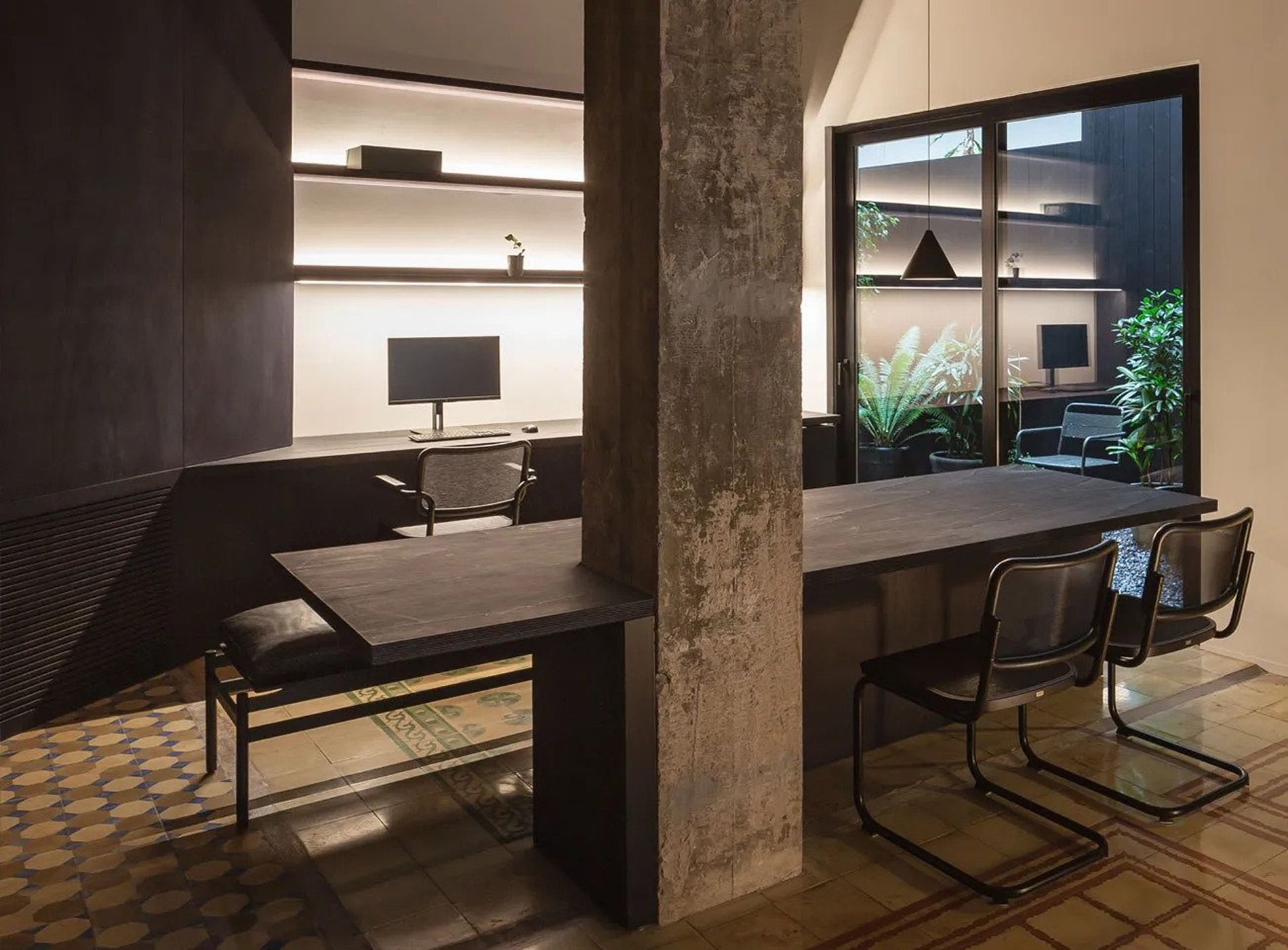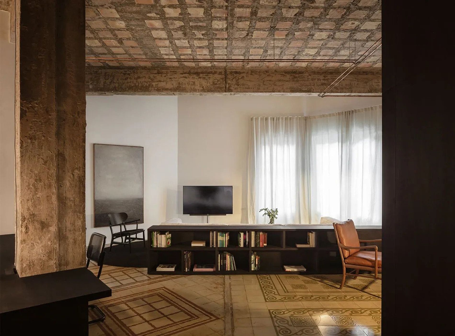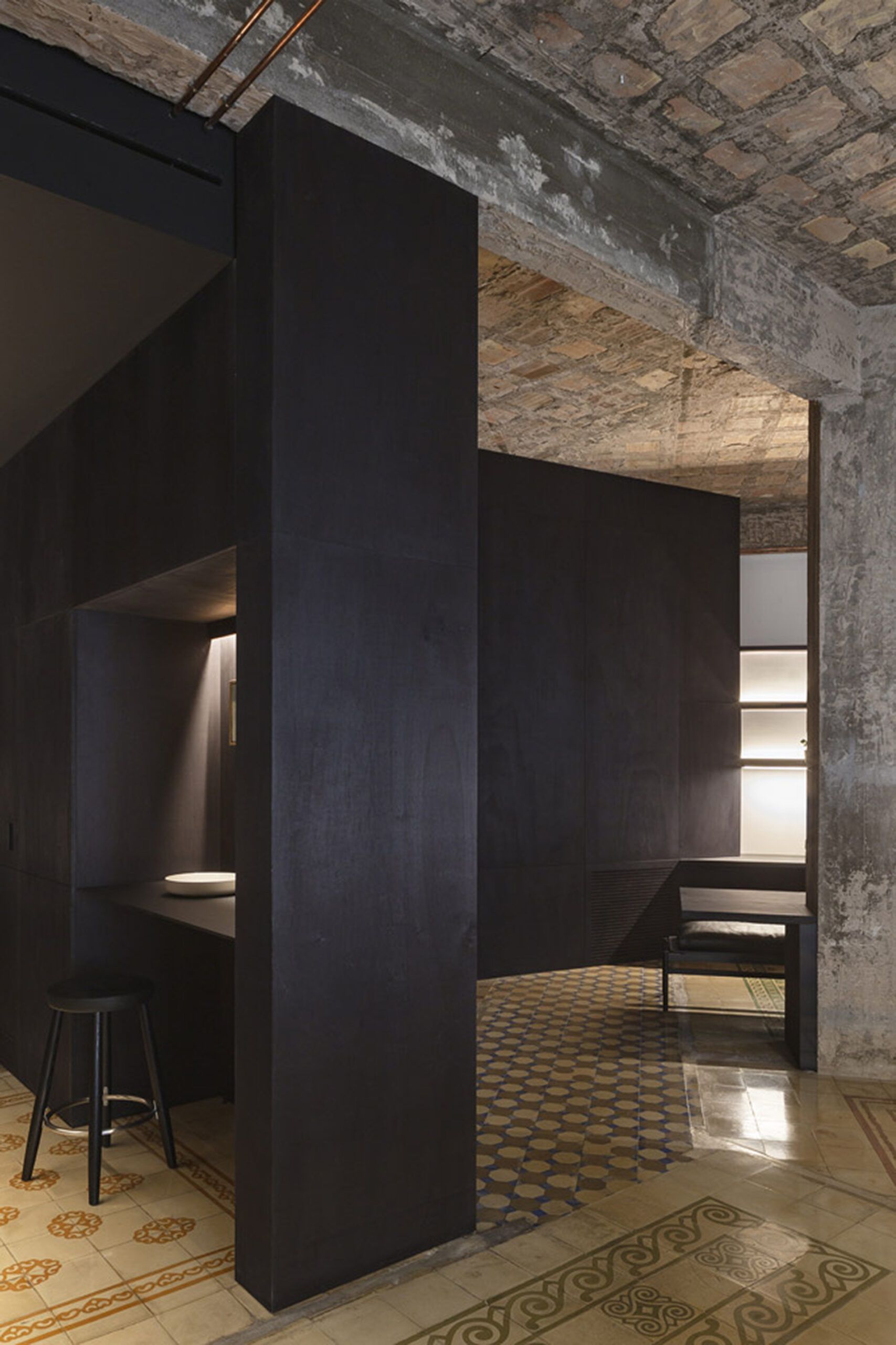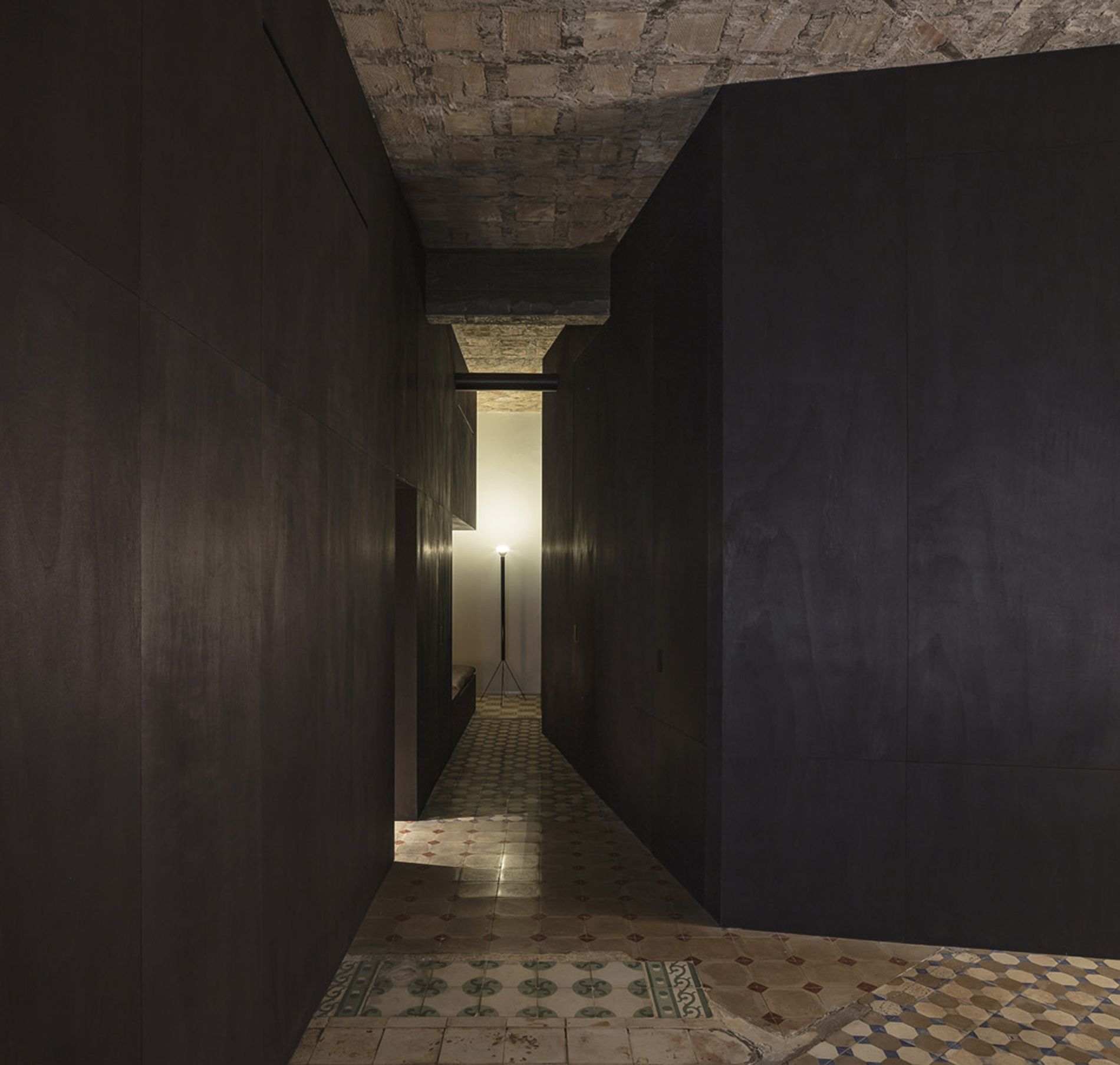 Located on the ground floor of a significant building —La Finca Roja— in the city of Valencia (Spain) and taking some of the building’s most notable features, such as the red brick and the various mosaic tiles that shape the floor, the first part of Francesc Rife Studio‘s work was to preserve the raw essence of the space. Secondly, the black-stained poplar wood unfolds and expands in the interior void as a discrete and neutral material. The impartiality of this color contributes to the fact that any historical evidence is remarkable, either the tiles that covered the fireplace, the ceilings, or the “wounds” that the previous distributions have left and allow to read on the floor the multitude of rooms that the house originally hosted.