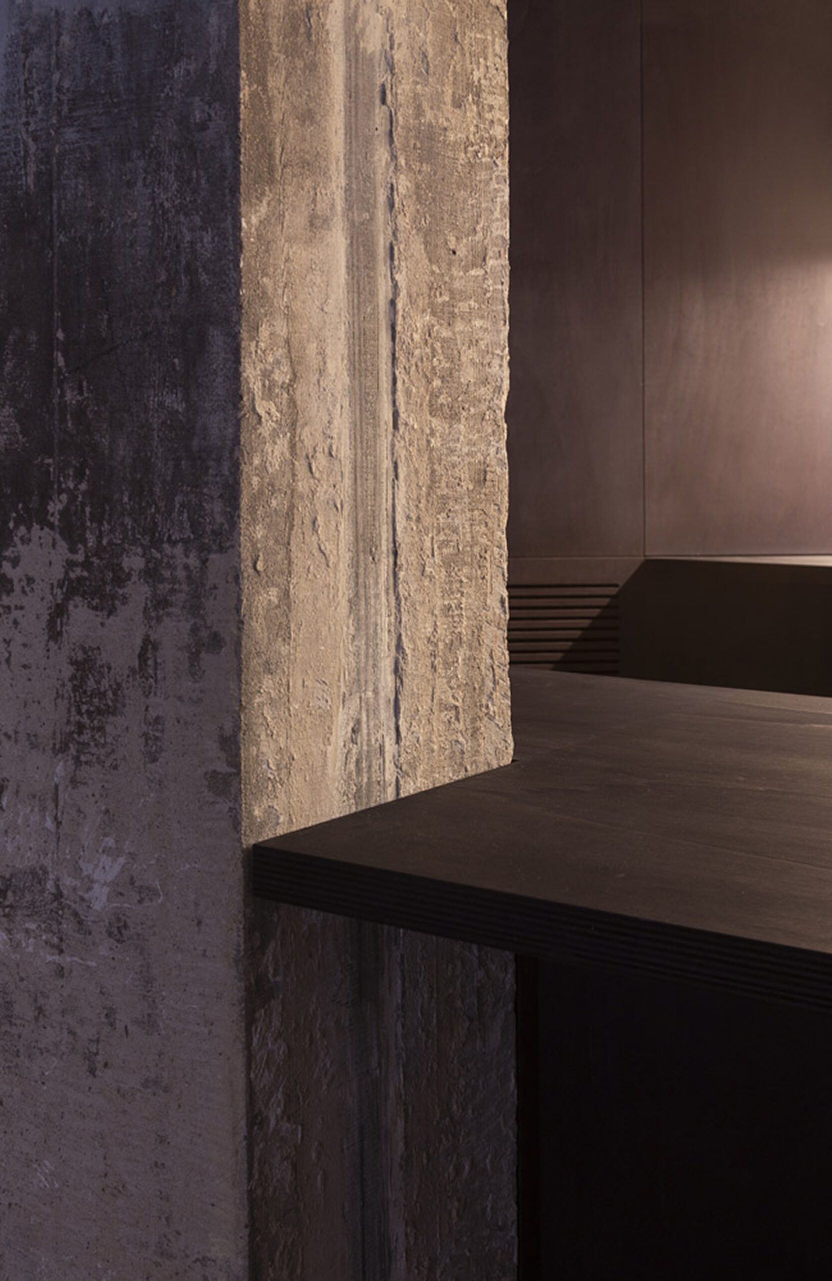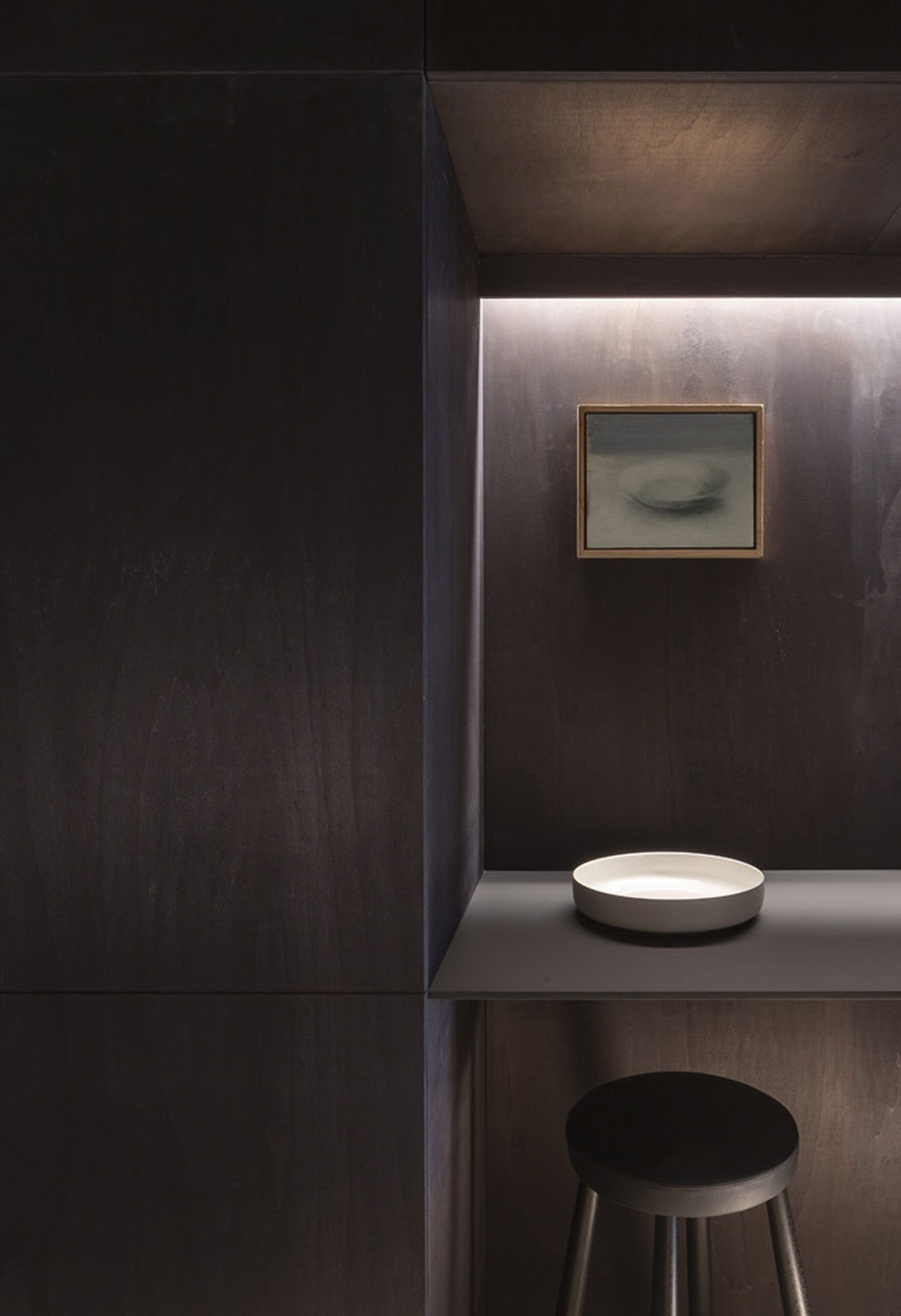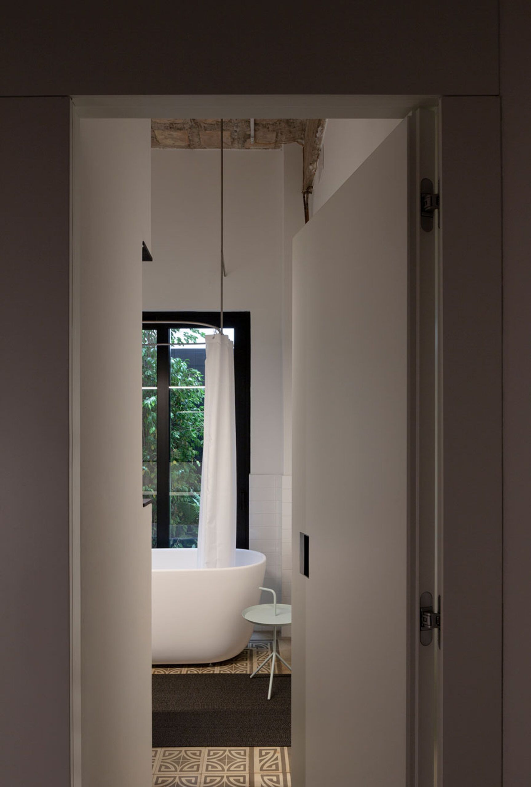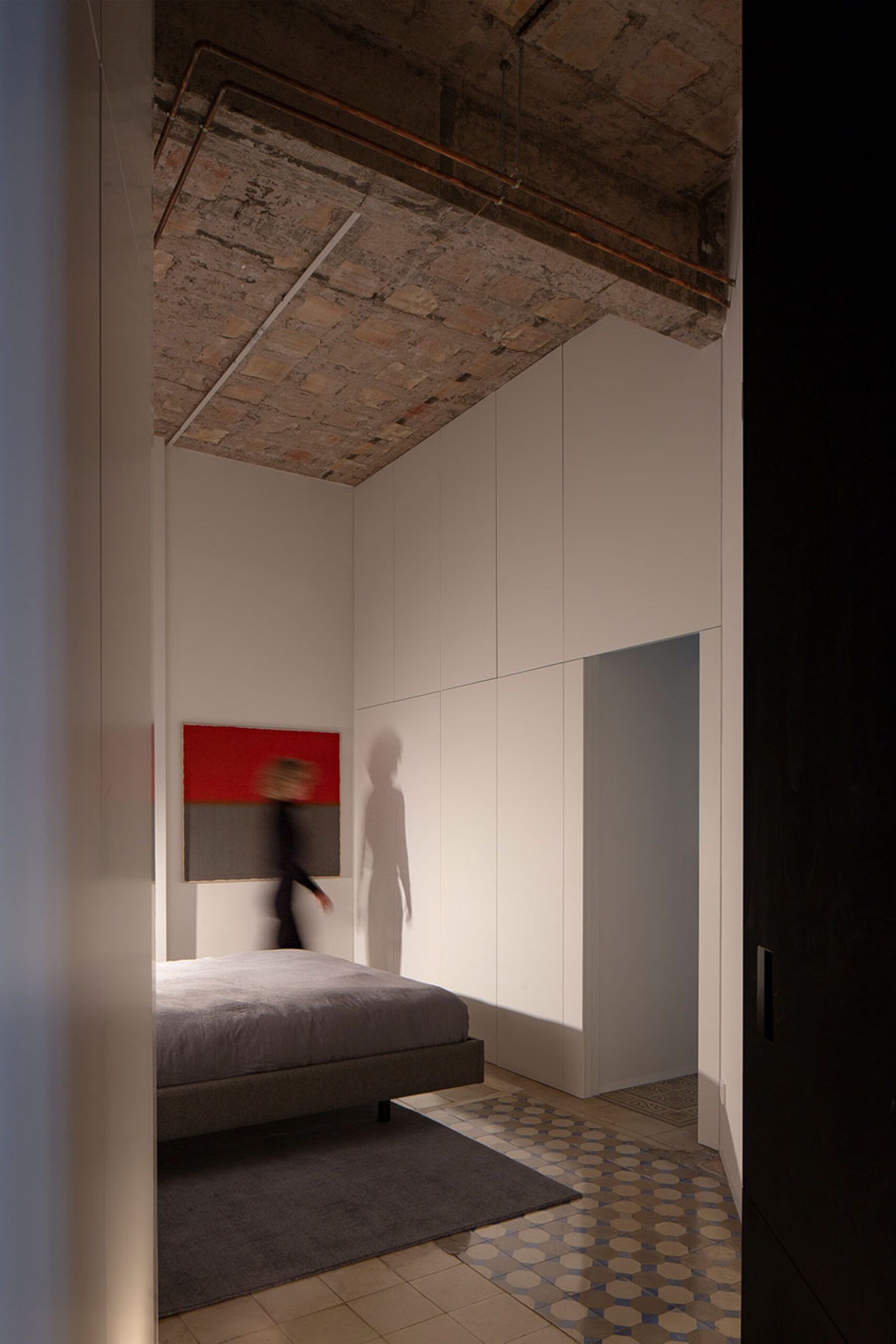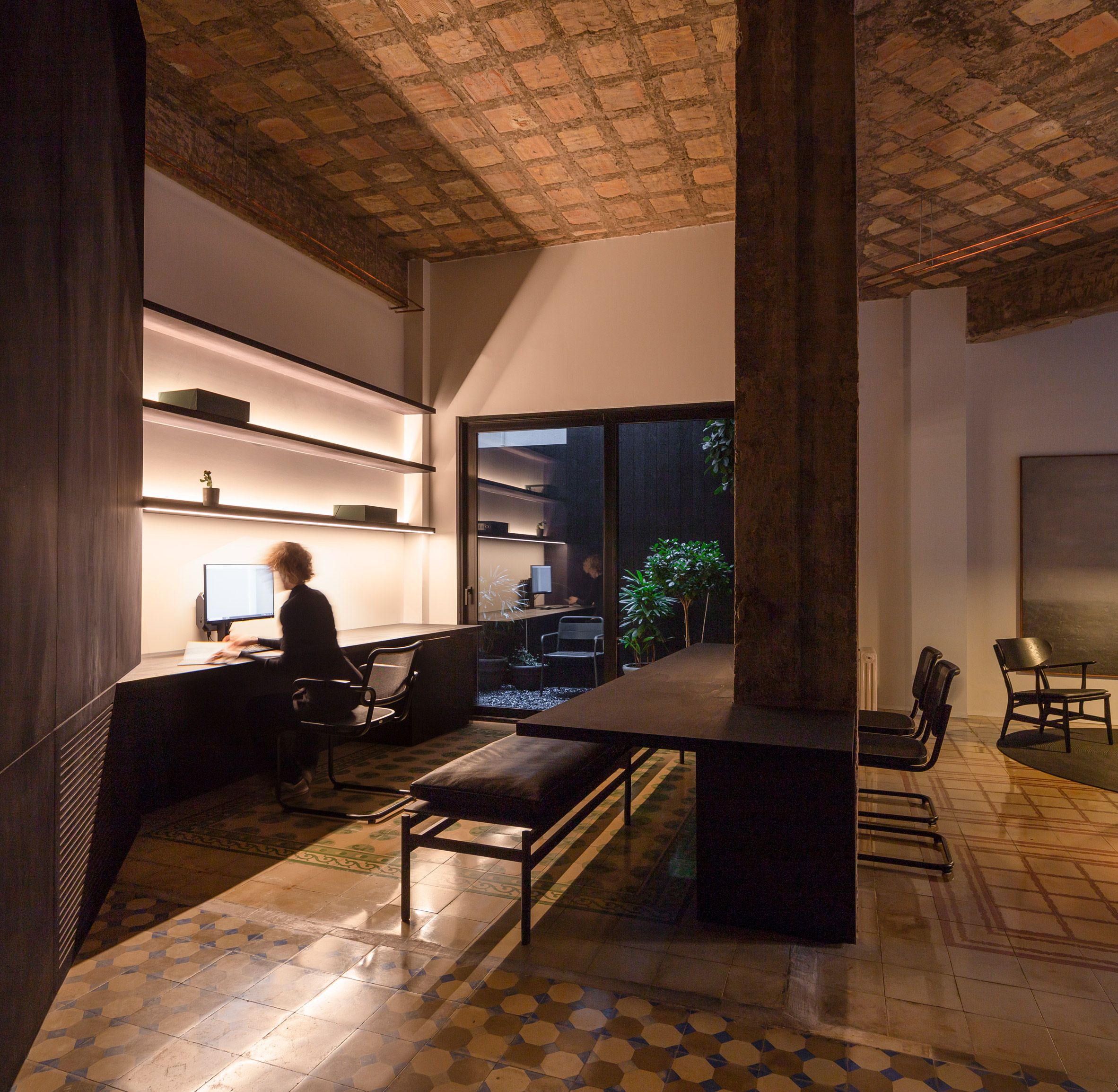 Located on the ground floor of a significant building —La Finca Roja— in the city of Valencia (Spain) and taking some of the building’s most notable features, such as the red brick and the various mosaic tiles that shape the floor, the first part of Francesc Rife Studio‘s work was to preserve the raw essence of the space. Secondly, the black-stained poplar wood unfolds and expands in the interior void as a discrete and neutral material. The impartiality of this color contributes to the fact that any historical evidence is remarkable, either the tiles that covered the fireplace, the ceilings, or the “wounds” that the previous distributions have left and allow to read on the floor the multitude of rooms that the house originally hosted.
