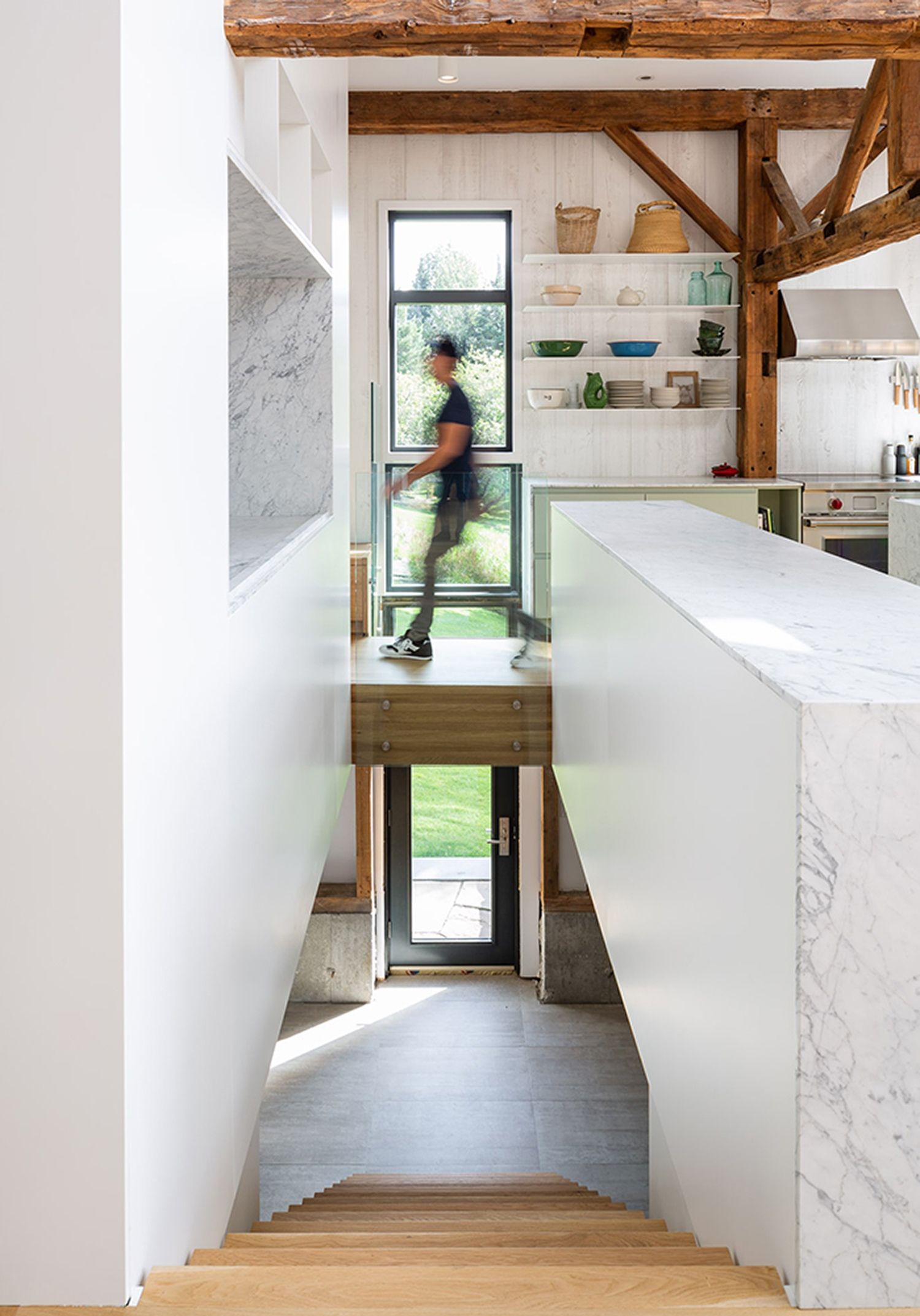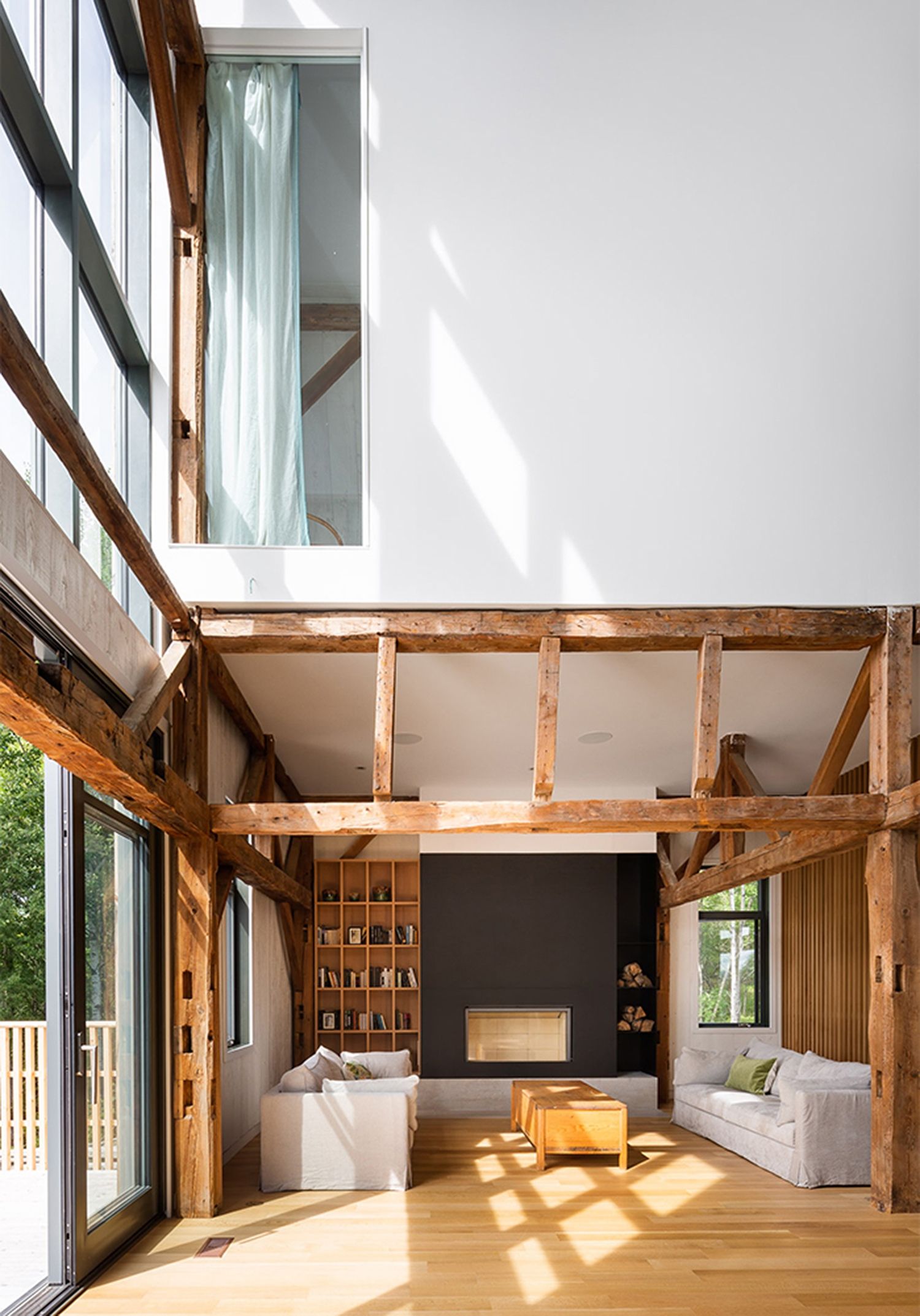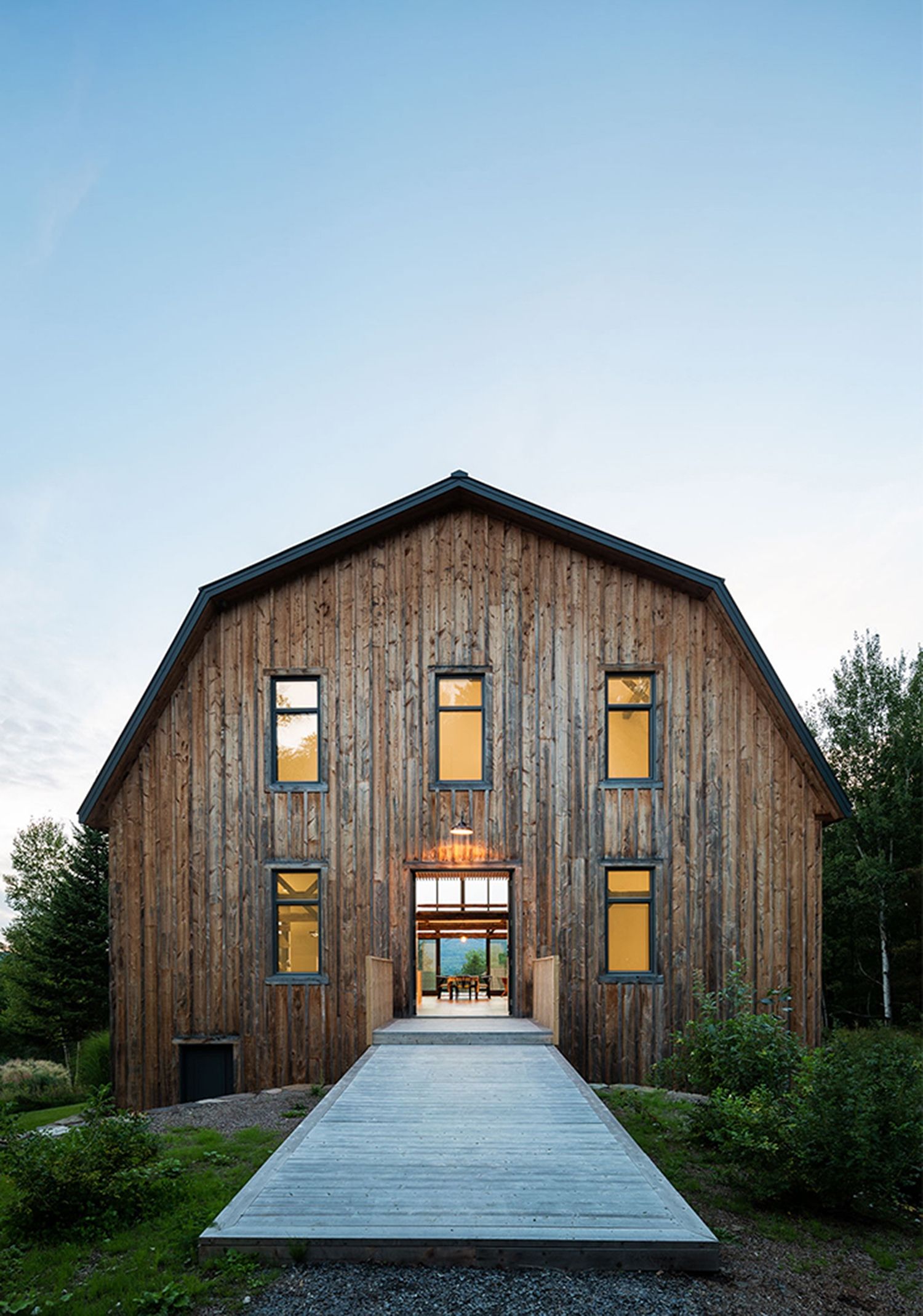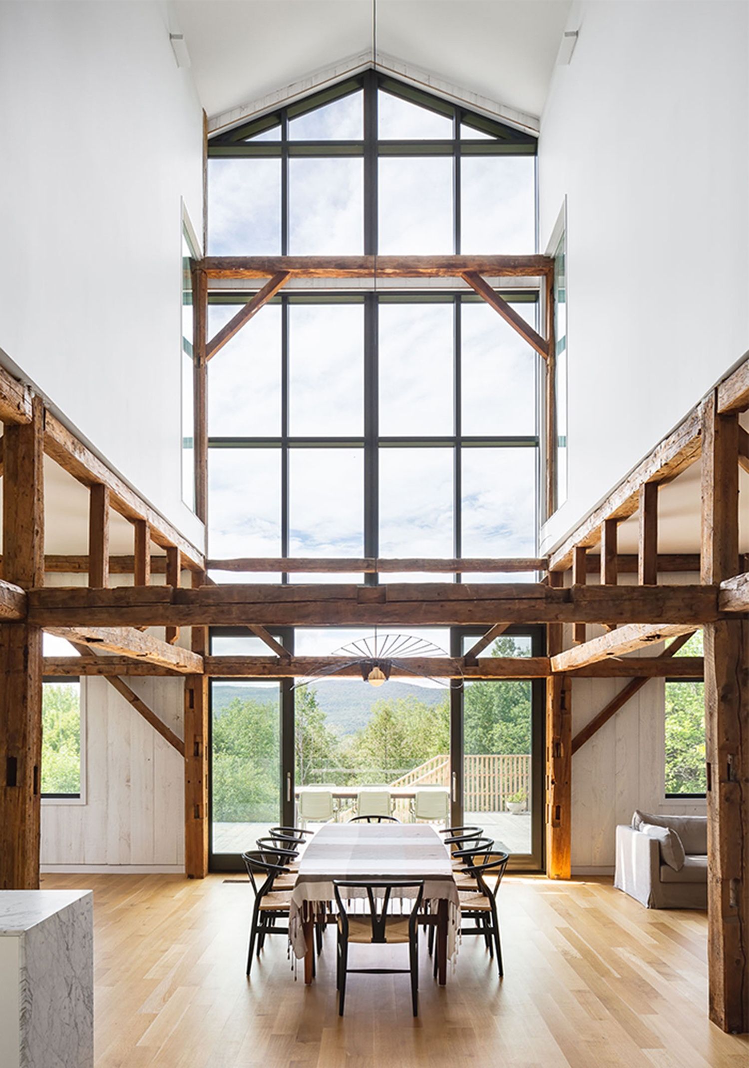 The Firm Studio was keen to preserve the vernacular architectural qualities of the original building. The initial structure has therefore been fully recovered. Each piece of hemlock in the facing and the structure was numbered to be then reinstalled: it is this framework that guided the organization of the space.The floor that once housed the livestock has become the main living level. It offers residents different degrees of privacy thanks to its multiple areas: open, half-open and closed. But above all, its 30 feet in height make it a space that breathes and connects majestically with the natural setting.It must be said that the site, camped at the foot of Mount Owl’s Head, offers a grandiose view that they have taken advantage of through generous windows. From there, the ancestral agricultural landscape remains almost intact.