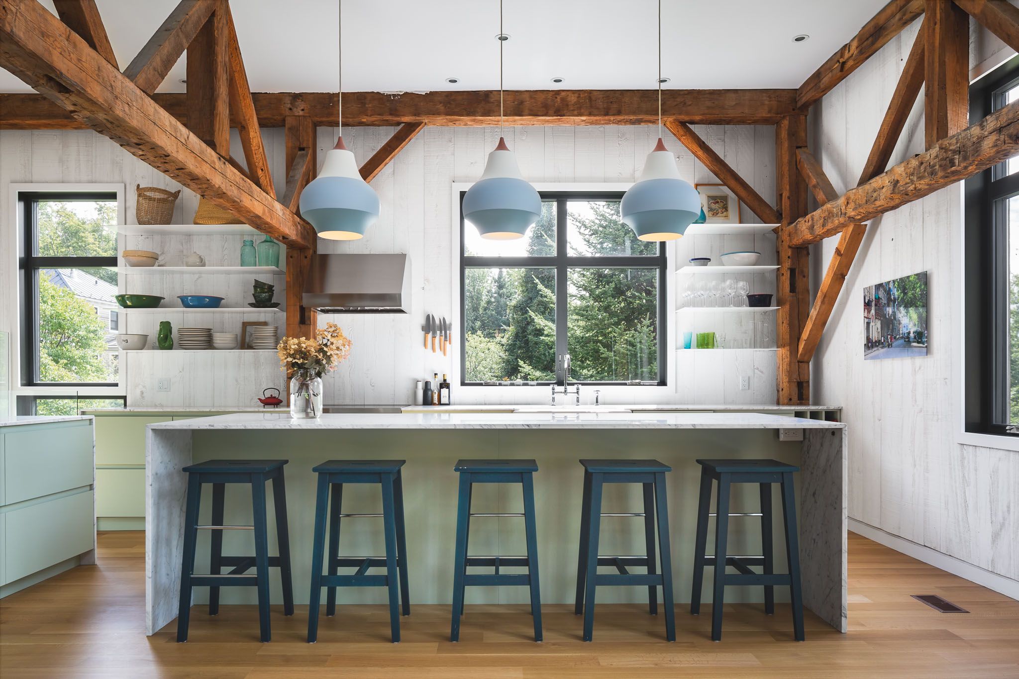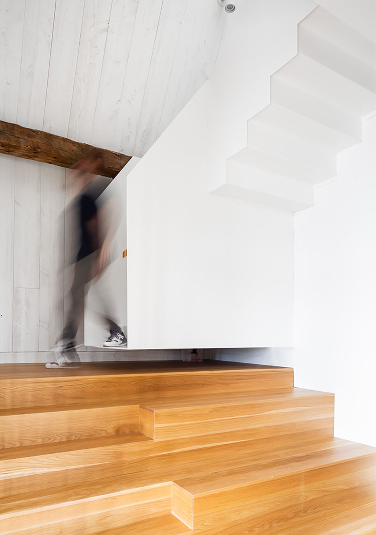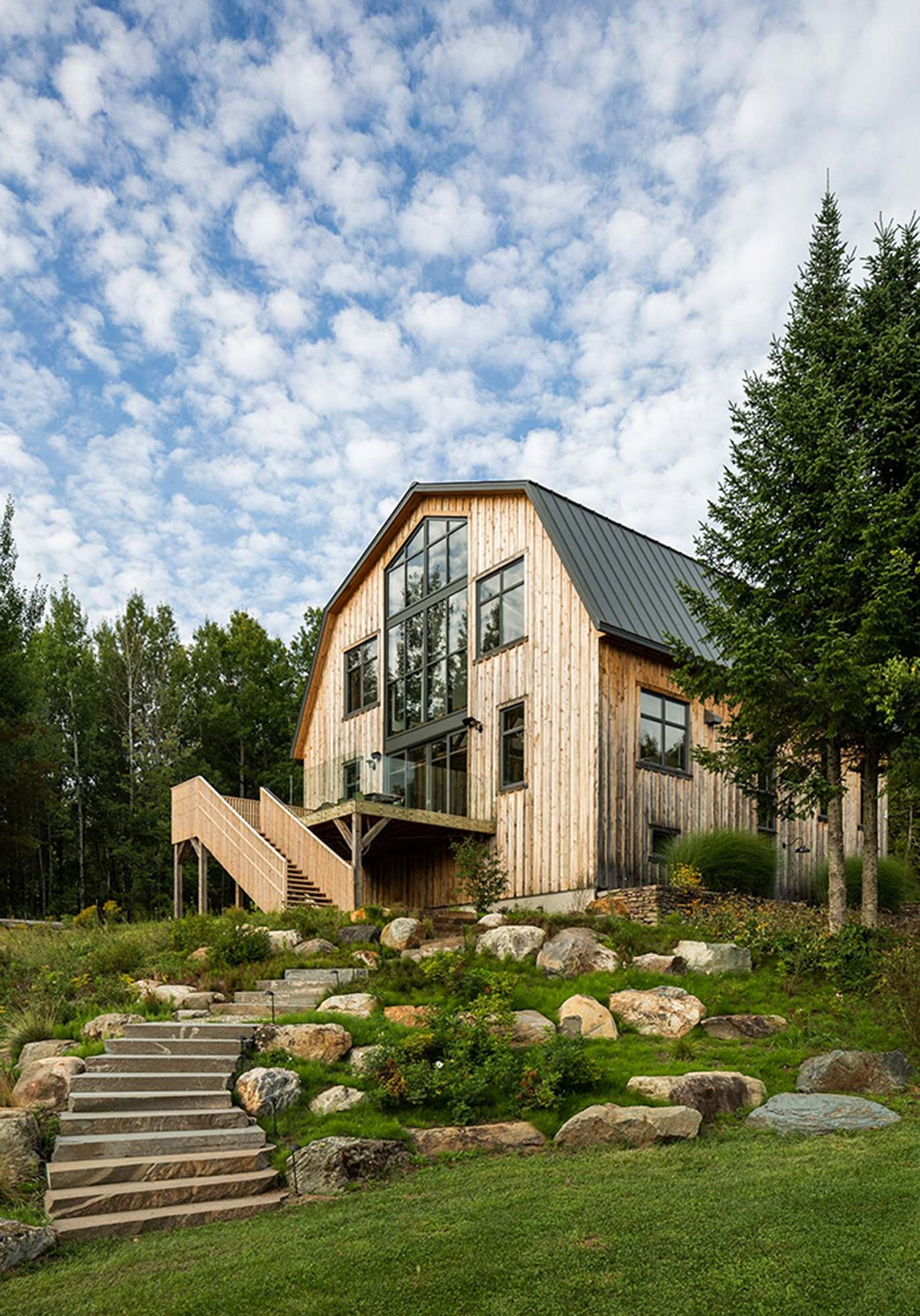 The Firm Studio was keen to preserve the vernacular architectural qualities of the original building. The initial structure has therefore been fully recovered. Each piece of hemlock in the facing and the structure was numbered to be then reinstalled: it is this framework that guided the organization of the space.The floor that once housed the livestock has become the main living level. It offers residents different degrees of privacy thanks to its multiple areas: open, half-open and closed. But above all, its 30 feet in height make it a space that breathes and connects majestically with the natural setting.It must be said that the site, camped at the foot of Mount Owl’s Head, offers a grandiose view that they have taken advantage of through generous windows. From there, the ancestral agricultural landscape remains almost intact.