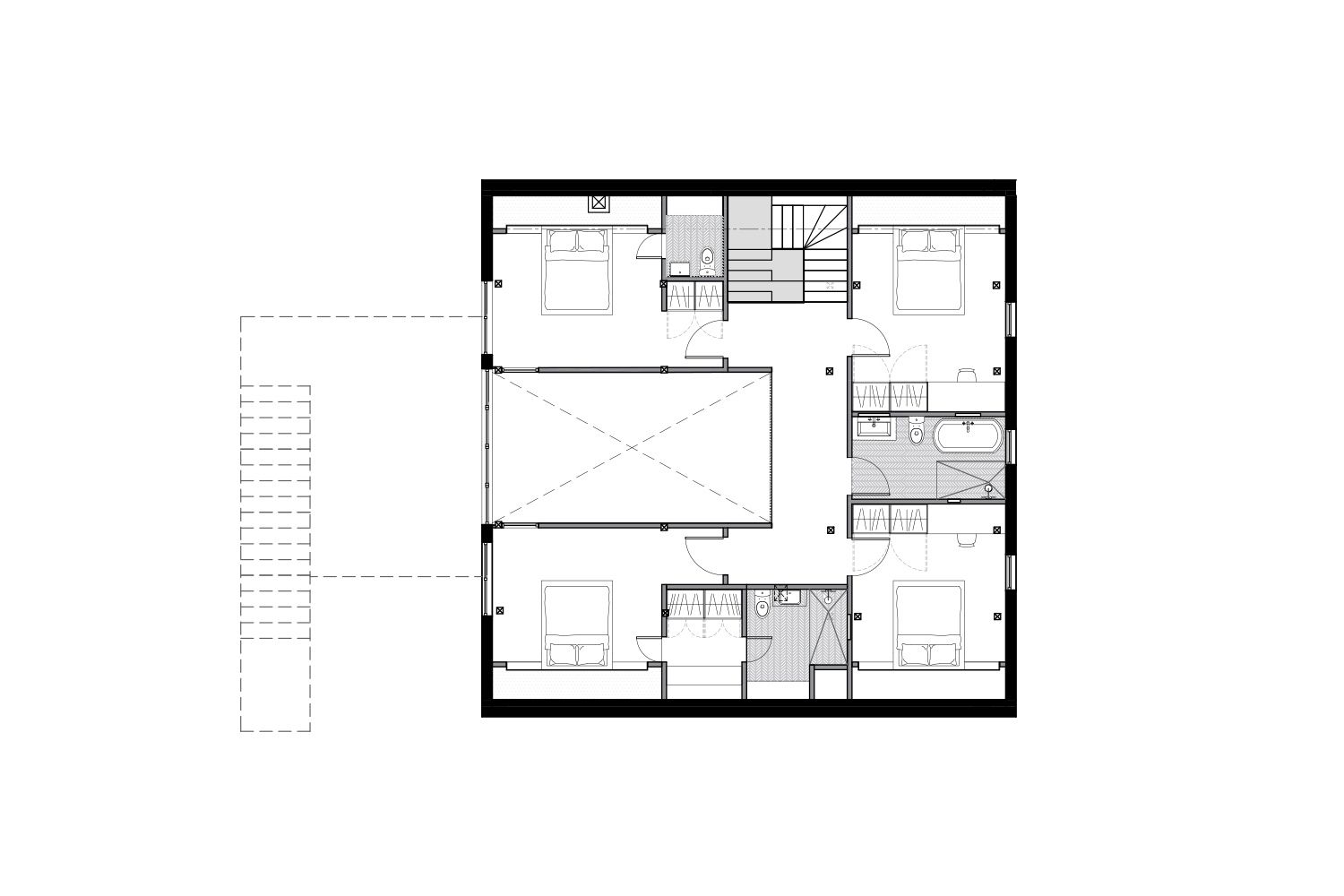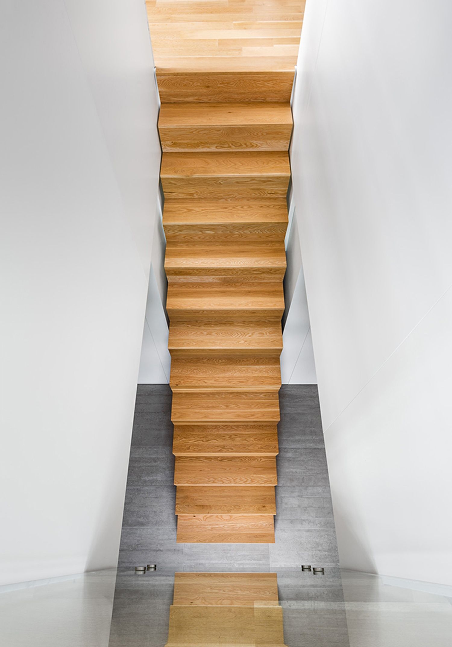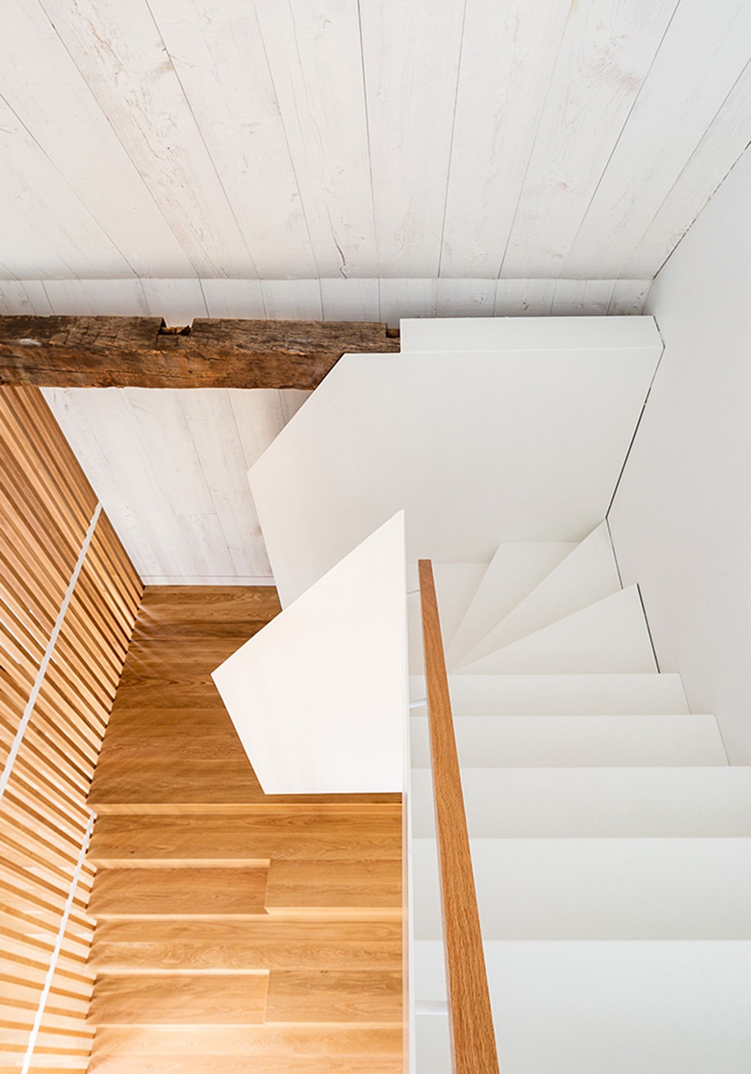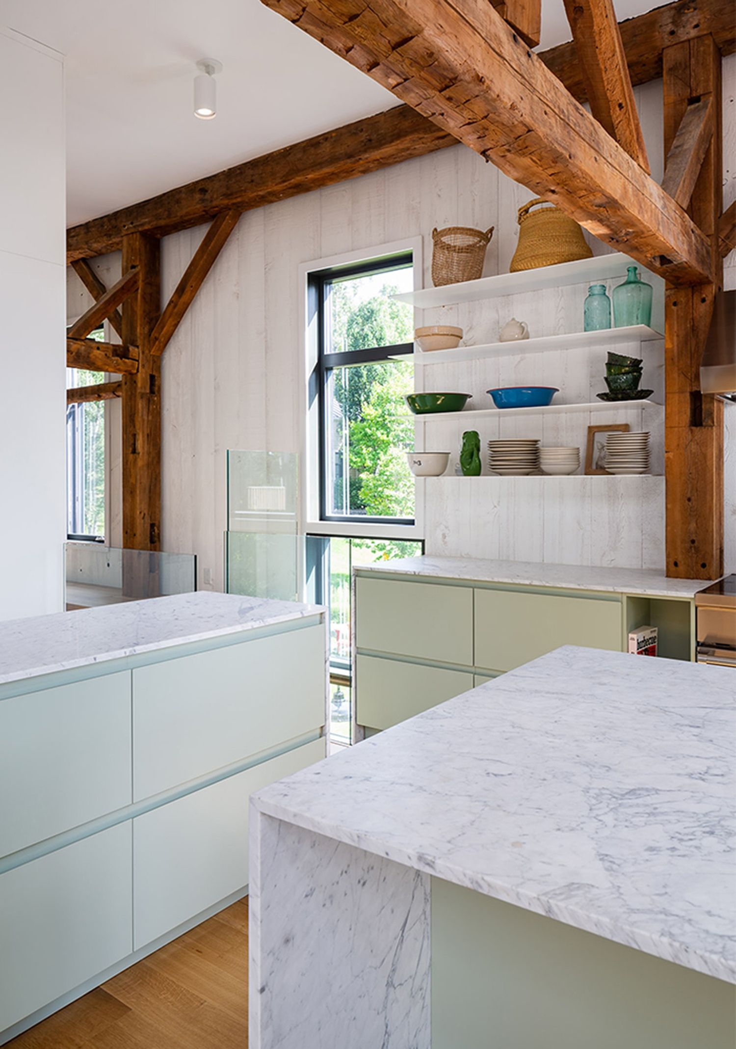 The Firm Studio was keen to preserve the vernacular architectural qualities of the original building. The initial structure has therefore been fully recovered. Each piece of hemlock in the facing and the structure was numbered to be then reinstalled: it is this framework that guided the organization of the space.The floor that once housed the livestock has become the main living level. It offers residents different degrees of privacy thanks to its multiple areas: open, half-open and closed. But above all, its 30 feet in height make it a space that breathes and connects majestically with the natural setting.It must be said that the site, camped at the foot of Mount Owl’s Head, offers a grandiose view that they have taken advantage of through generous windows. From there, the ancestral agricultural landscape remains almost intact.