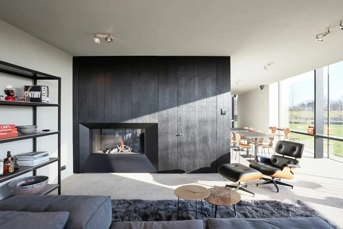 Absolute peace and quiet was central to the renovation, while the history of this place would not be lost .. The use of rough concrete, wood, sleek design and large windows ensure that this impressive piece of architecture, completely absorbed in the surrounding landscape of Belgian polders with former bunkers from WW I & II. The minimalist style with black / gray accents, give peace to the whole and let you become aware of this nostalgic landscape at every moment…..