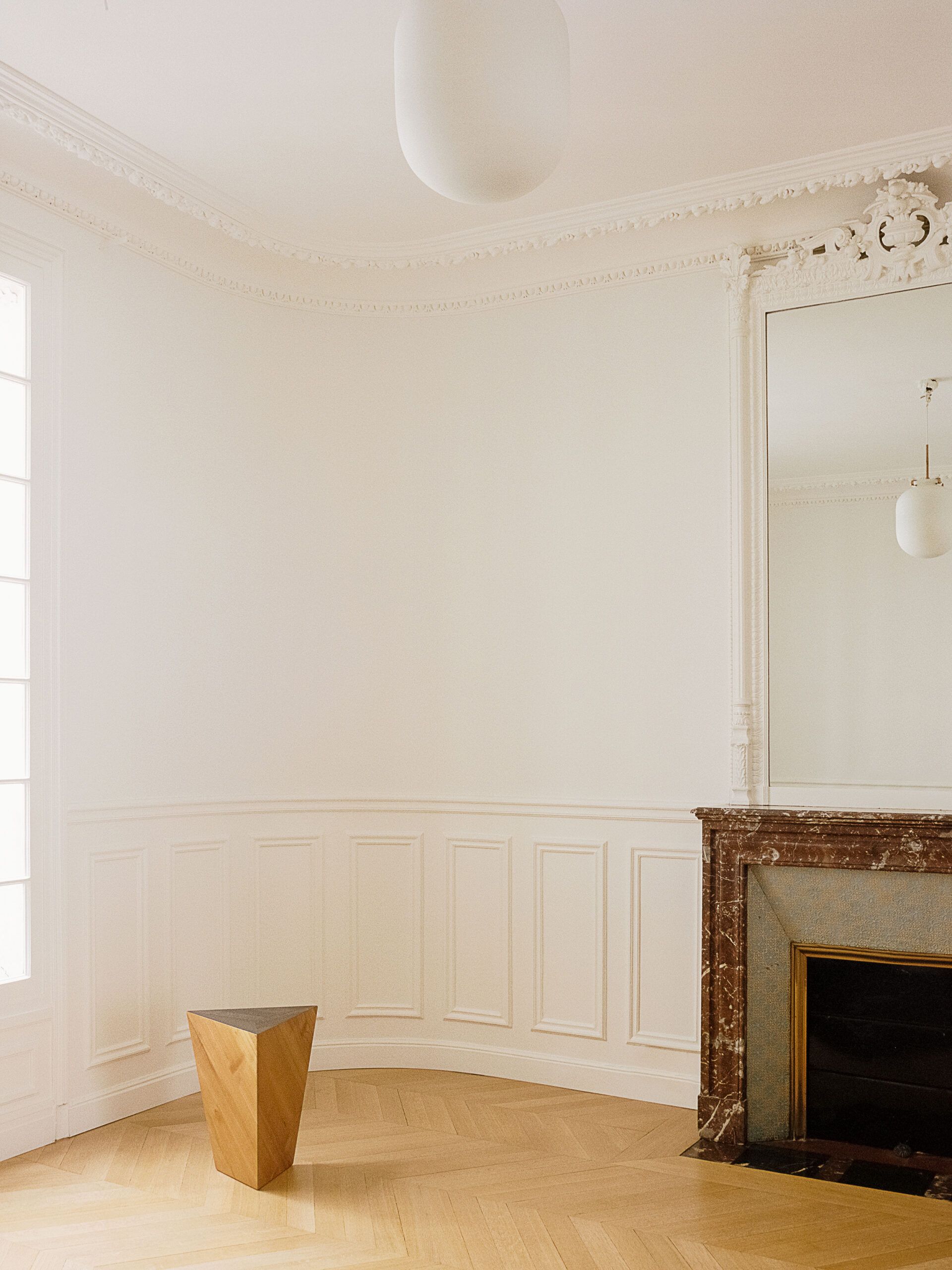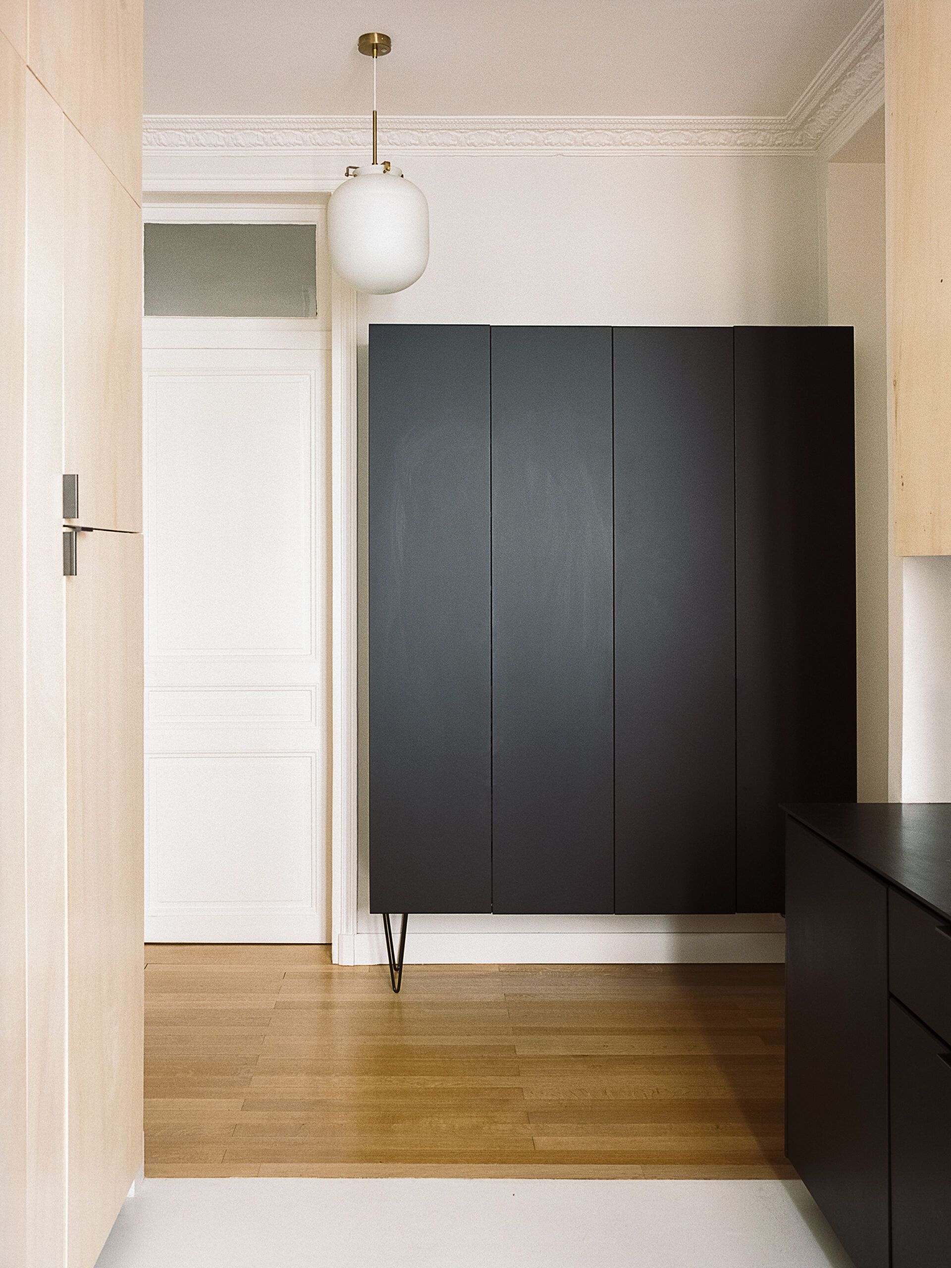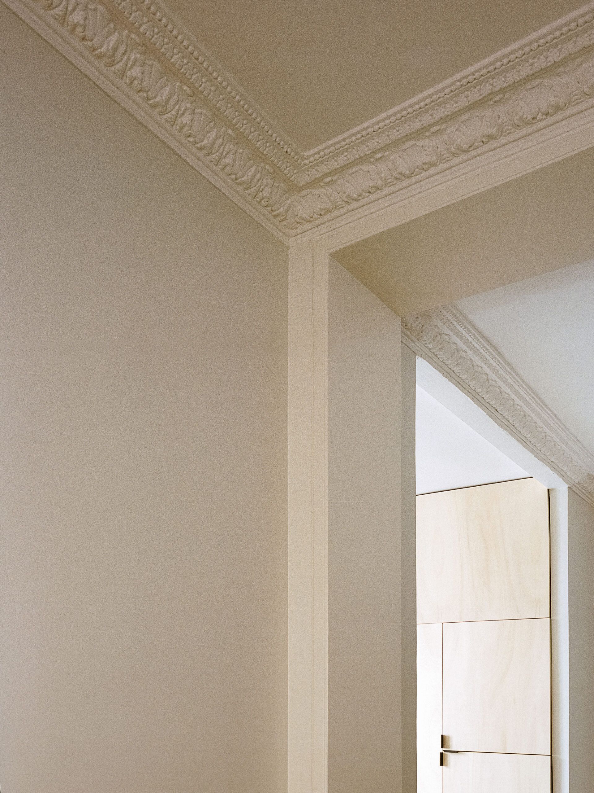 This Apartment project, designed by DROO Studio, draws on inspiration from the Danish Painter Hommershoi, as foreground and background merge through singular framed views through an enfilade of rooms. A subdued palette of dark and light hues , natural concrete walls, leathered zimbabwe granite sit against the pale tones of birch wood and the highly ornate panelling and restored marble fireplaces to create subtle juxtapositions of time and light.