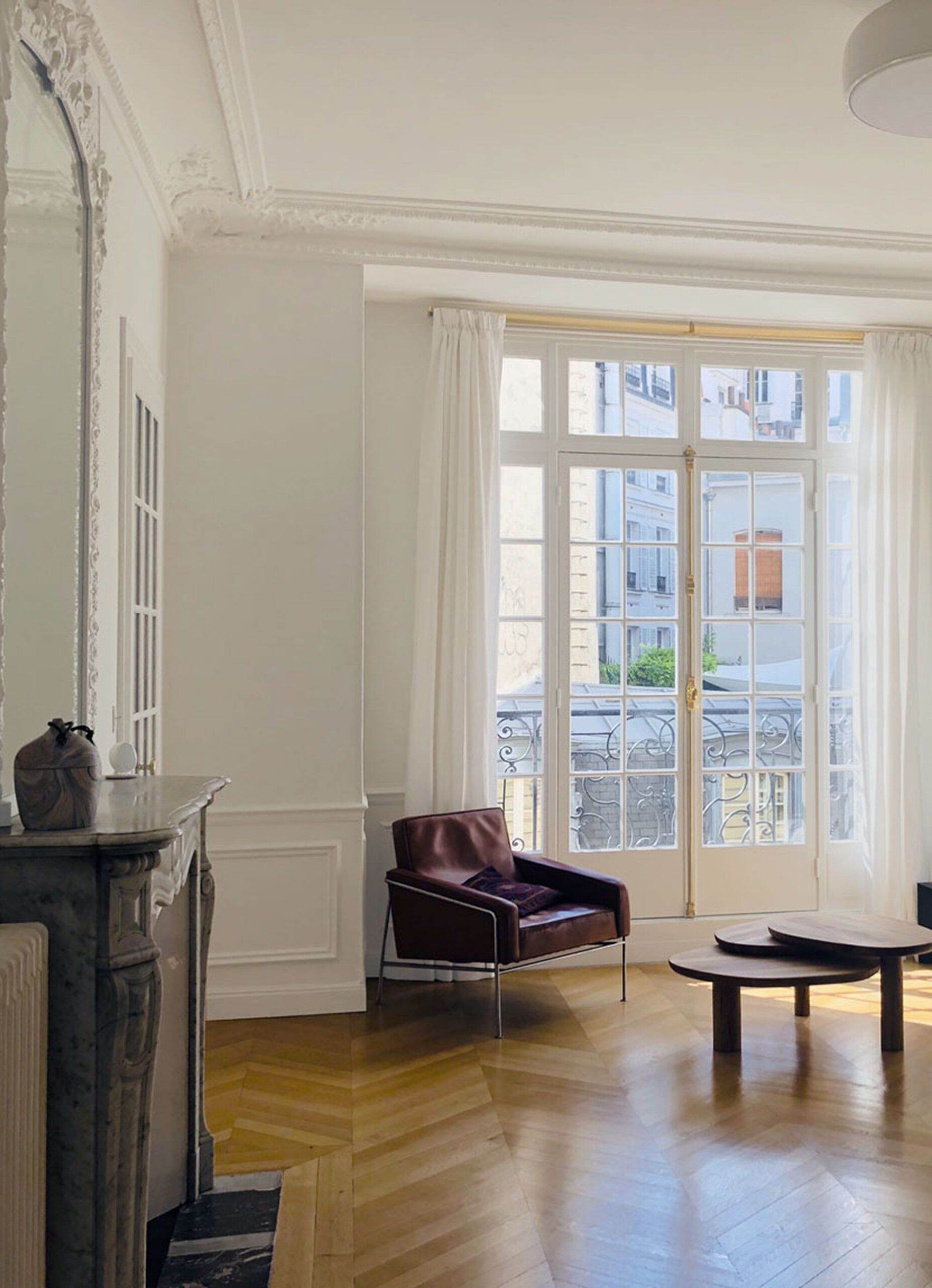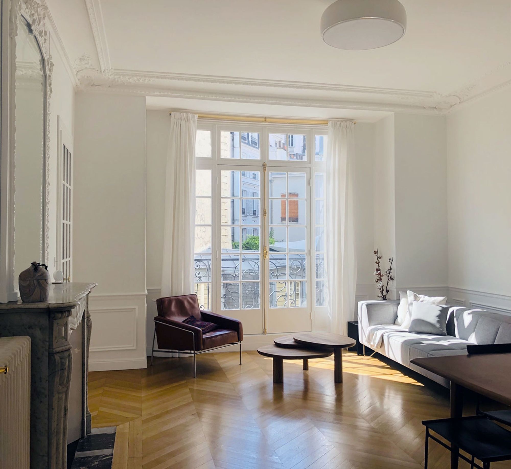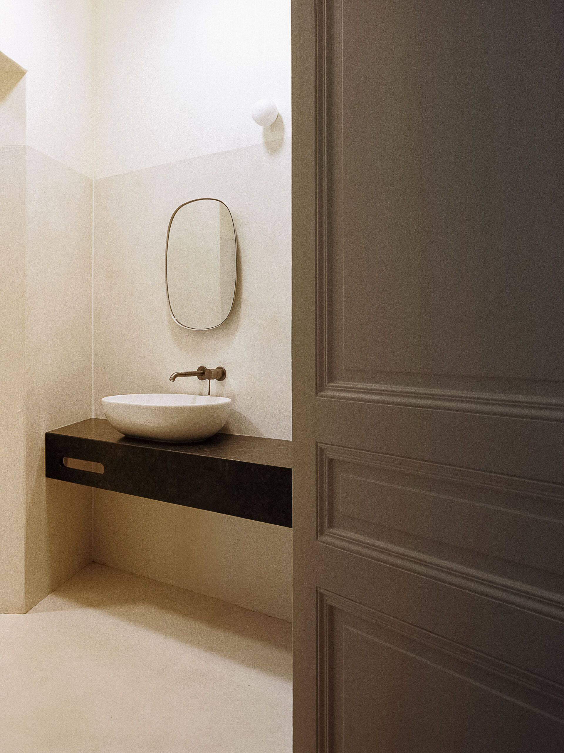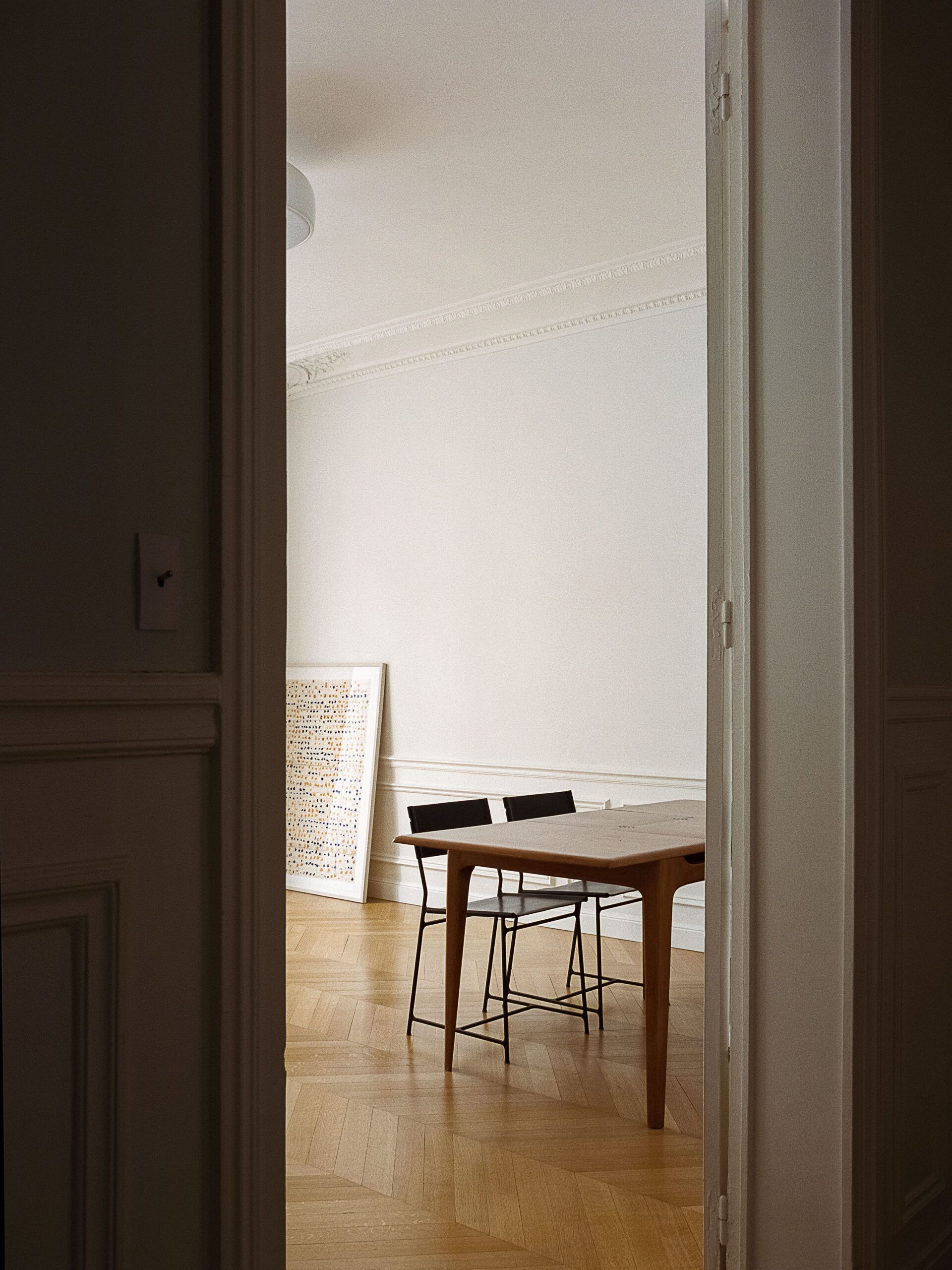 This Apartment project, designed by DROO Studio, draws on inspiration from the Danish Painter Hommershoi, as foreground and background merge through singular framed views through an enfilade of rooms. A subdued palette of dark and light hues , natural concrete walls, leathered zimbabwe granite sit against the pale tones of birch wood and the highly ornate panelling and restored marble fireplaces to create subtle juxtapositions of time and light.