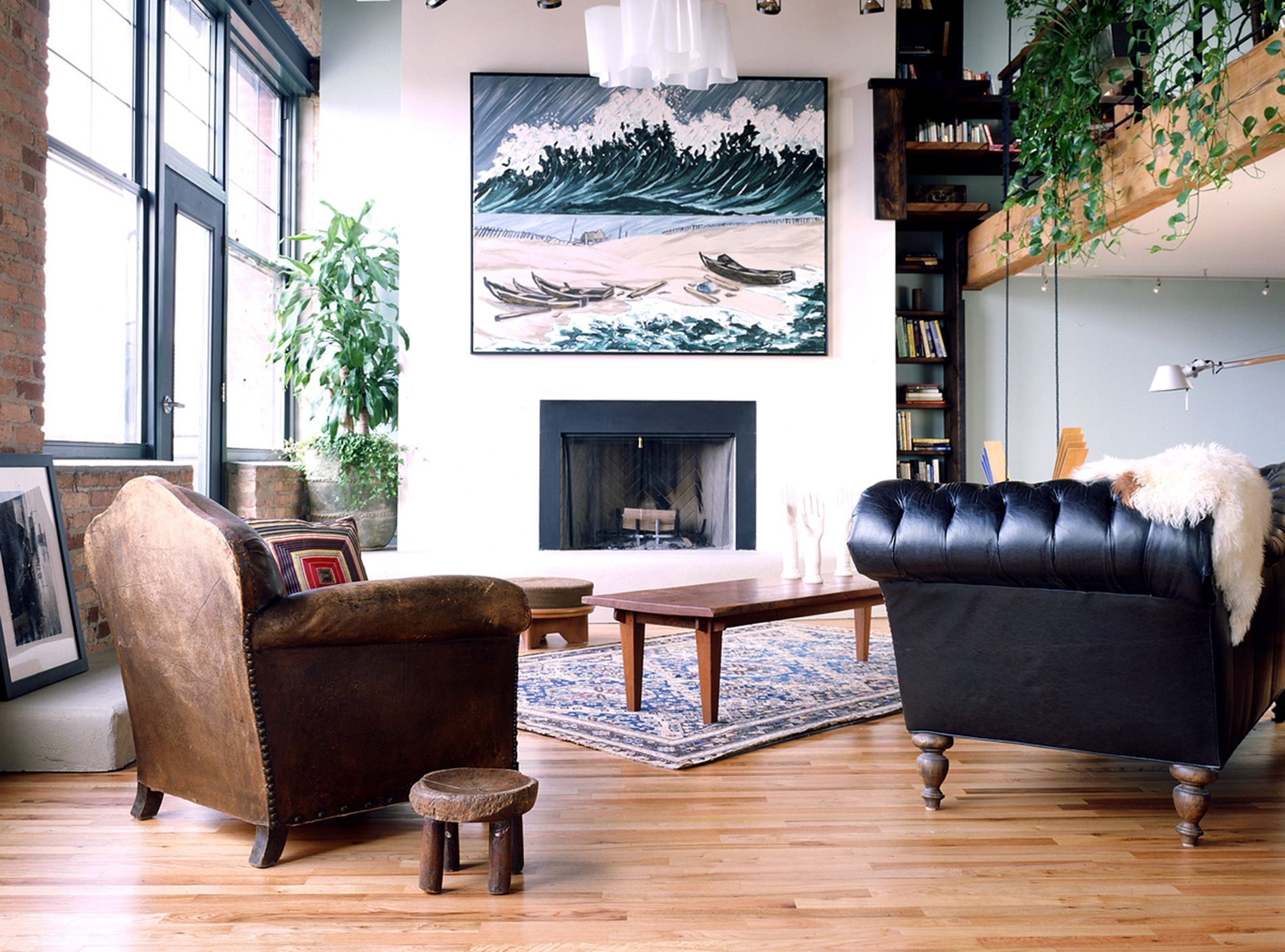 This interior renovation by Scrafano Architects, unifies four existing lofts into one large open living space on three different levels. The architect located the kitchen/eating area in the center of the space to create a central social gathering and communal area. Fireplaces are used as focal points to mark both ends of the L-shaped living space. Built-in shelves and cabinetry separate interior rooms while simultaneously connecting spaces and storing the owners’ large book collection and travel treasures. The bedrooms, bathrooms, and offices are tucked upstairs under the building’s original wood ceiling. New, cantilevered metal grate floors with open rails increase the upper level live/work area and allow light to filter to the spaces be